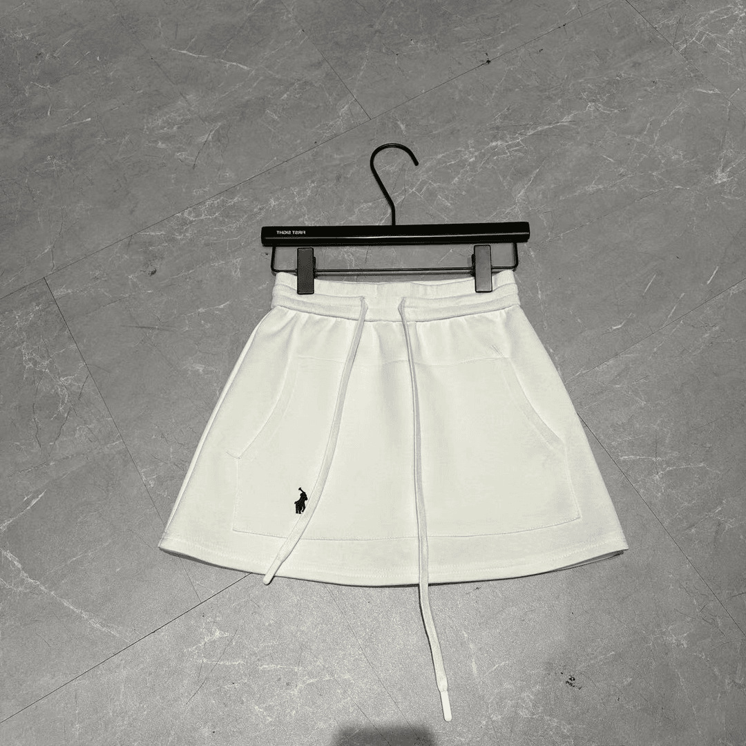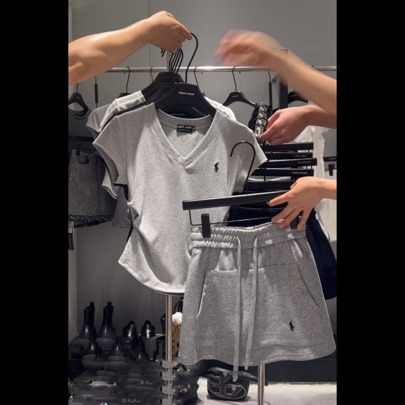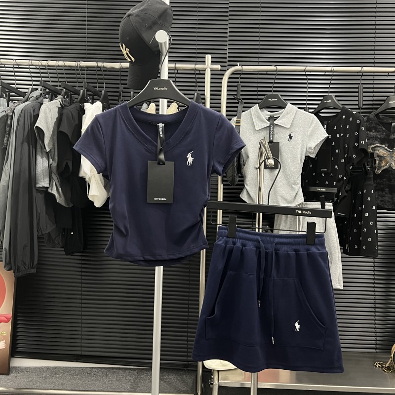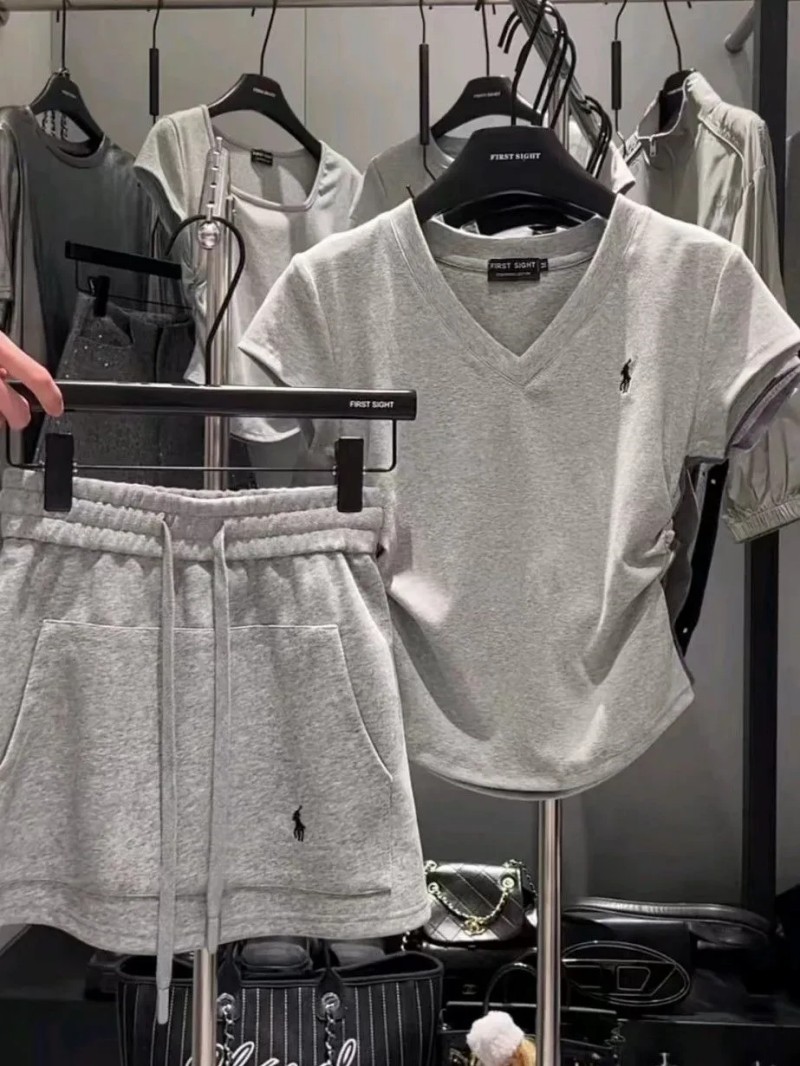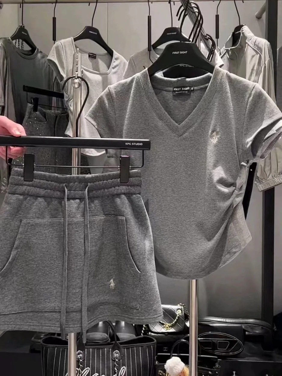 2026 여름 플리츠 포니 자수 V넥 반팔 슬림핏 탑+신축성 하이웨이스트 만능 스커트 여성용
