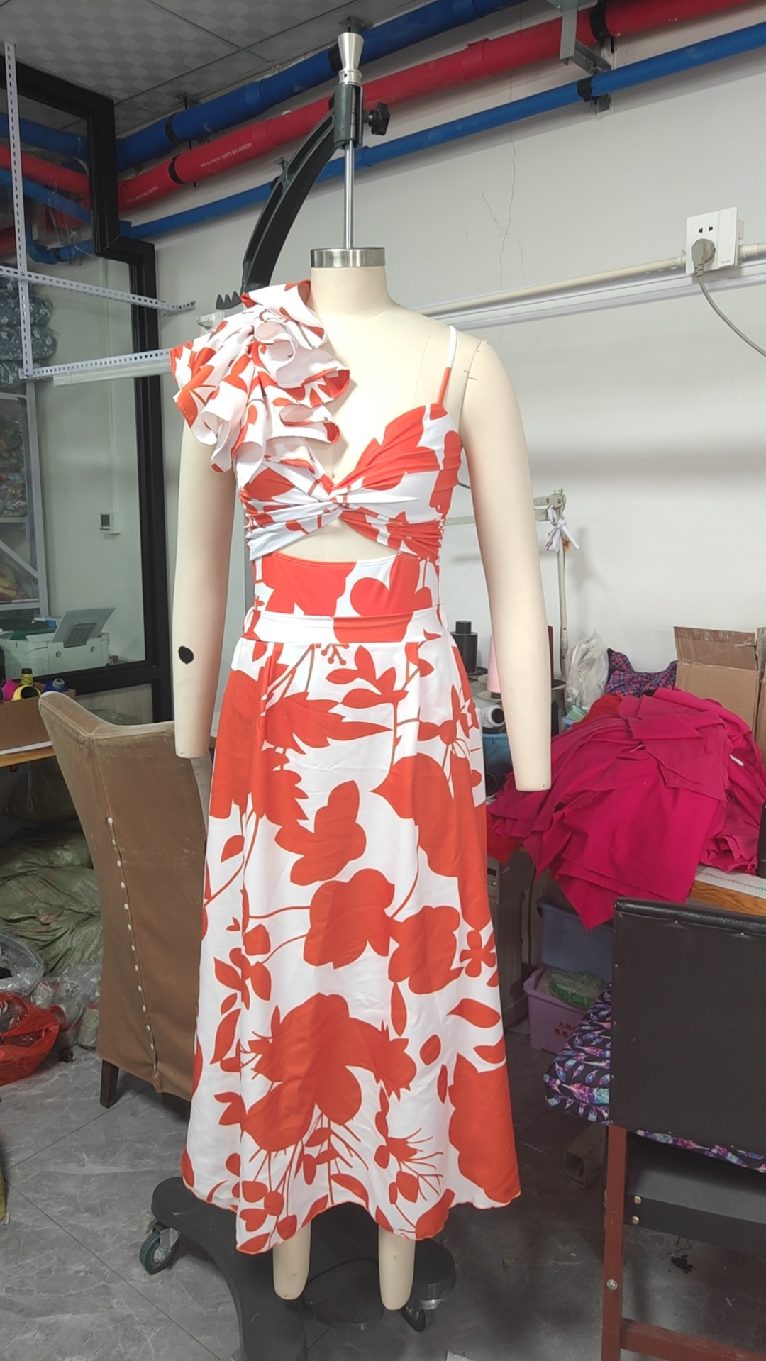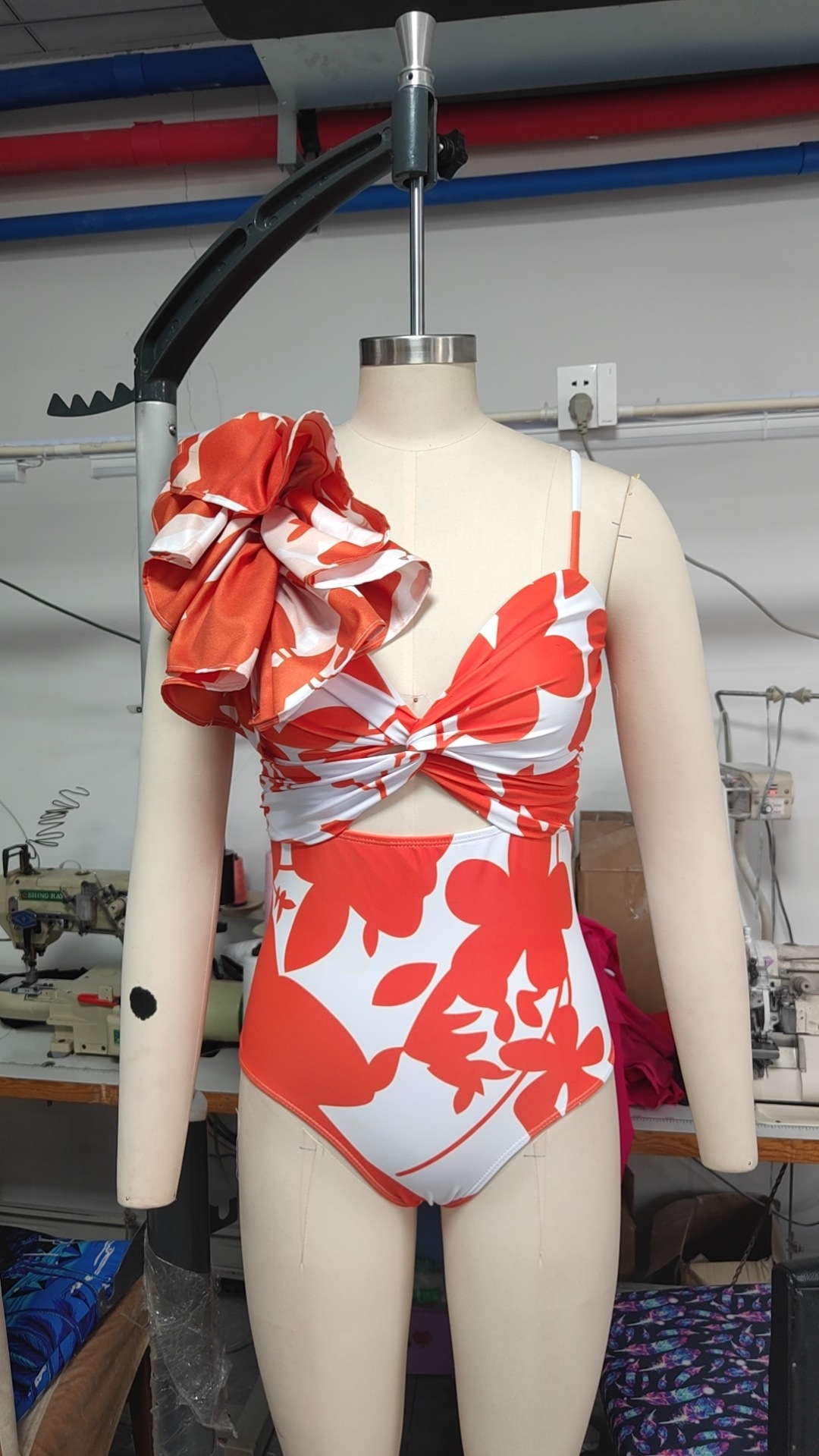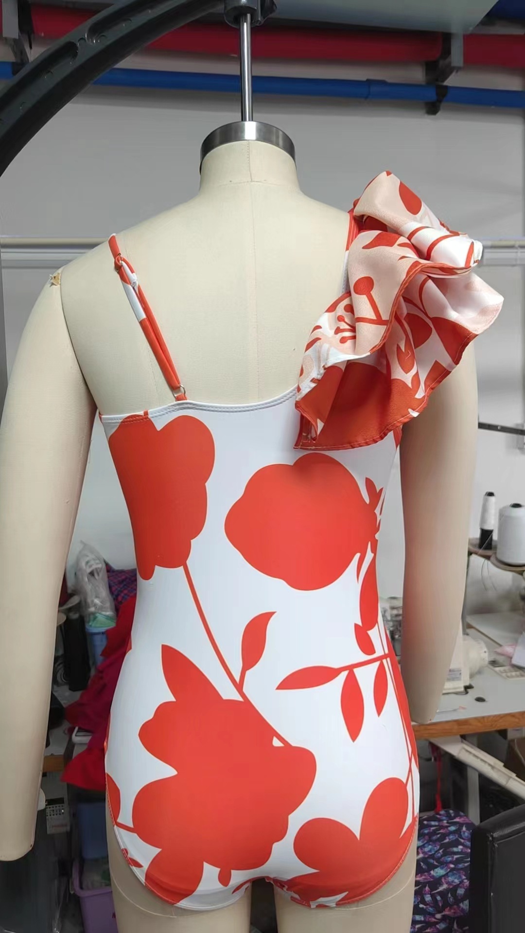 유럽과 미국의 원피스 수영복 여성의 2024 새로운 원 숄더 러플 수영복 여성 하이 엔드 할로우 아웃 인쇄 원피스 수영복
