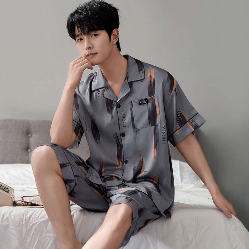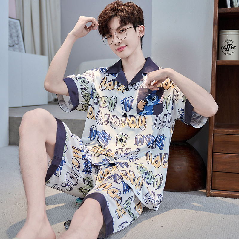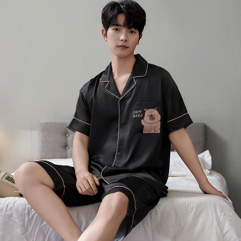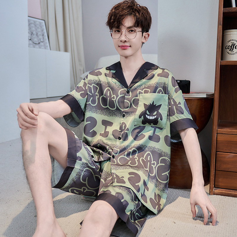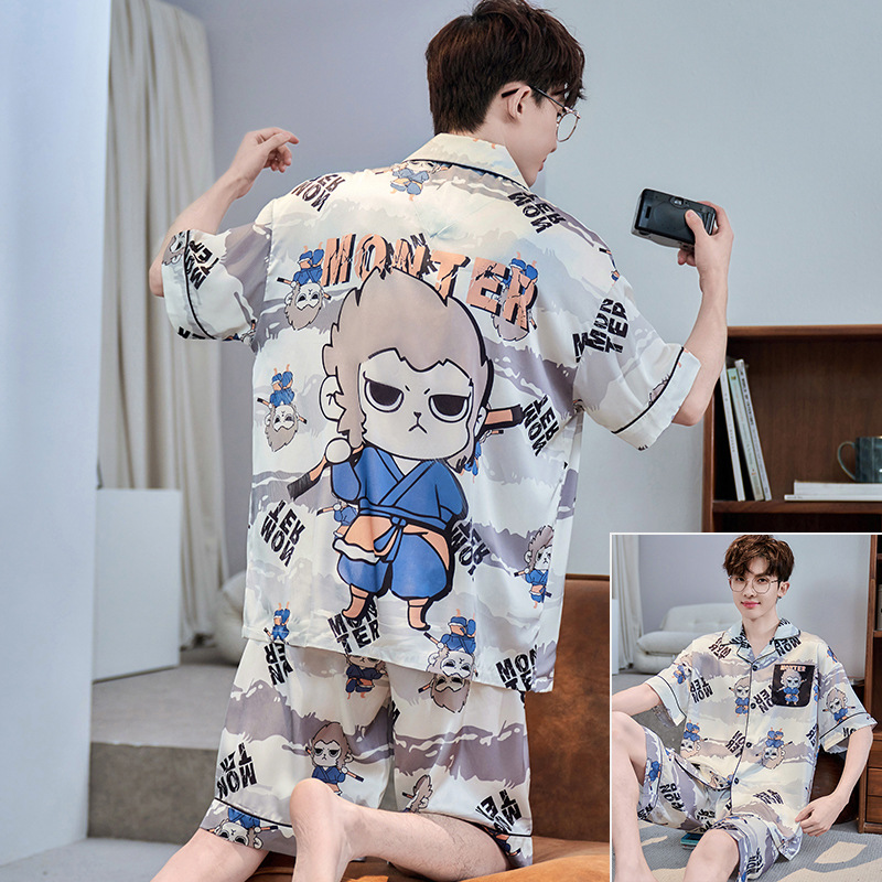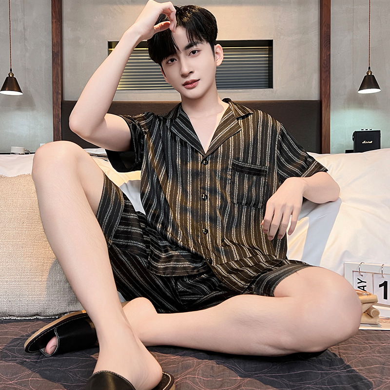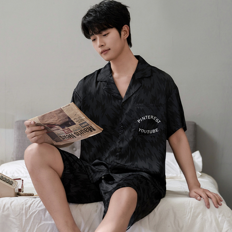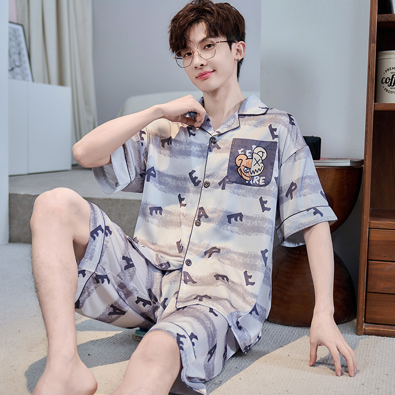 잠옷 남자 여름 얇은 얼음 실크 간단한 고급 십대 소년 한국 스타일 실크 짧은 소매 홈 의류 세트