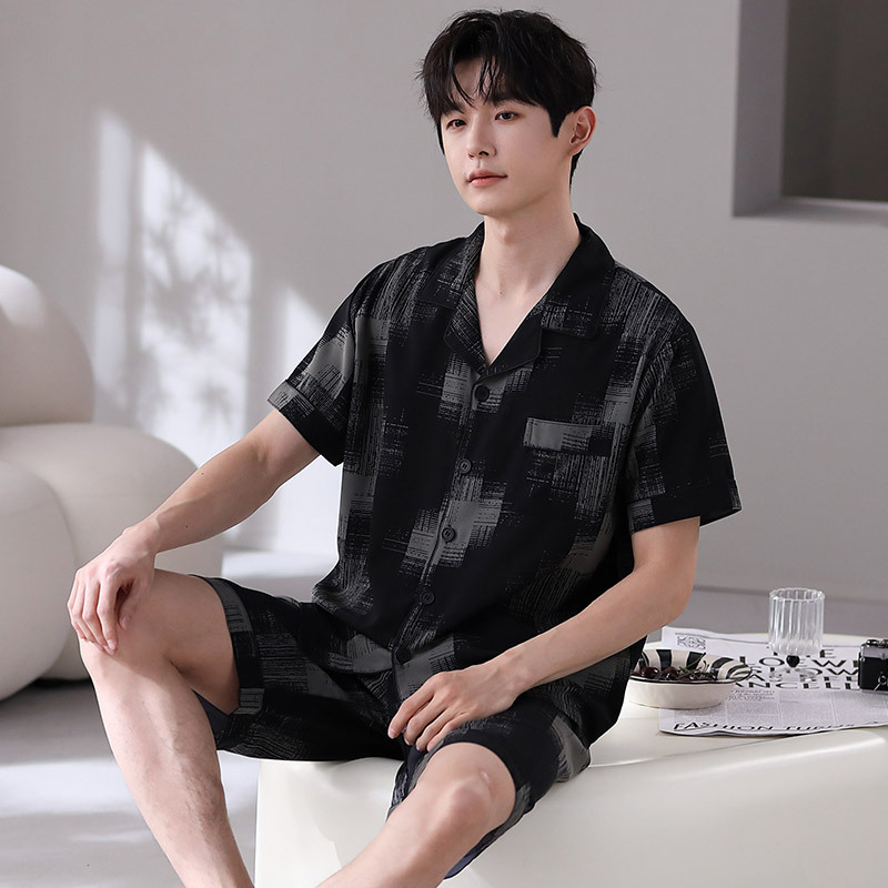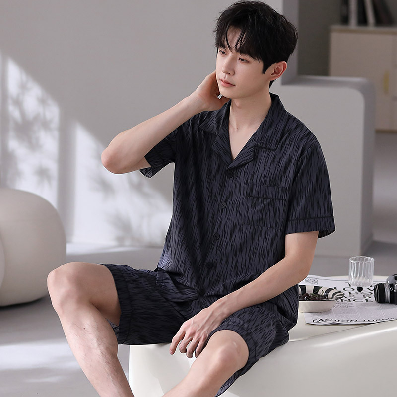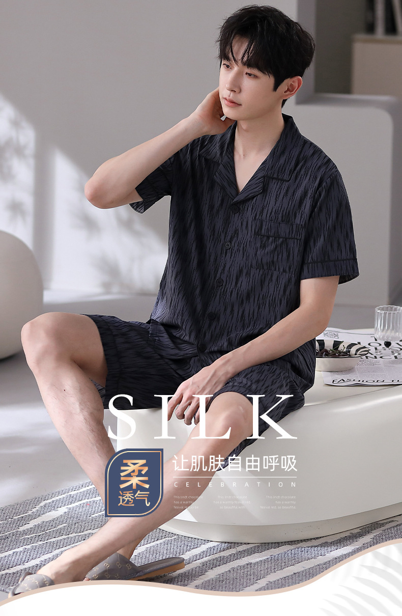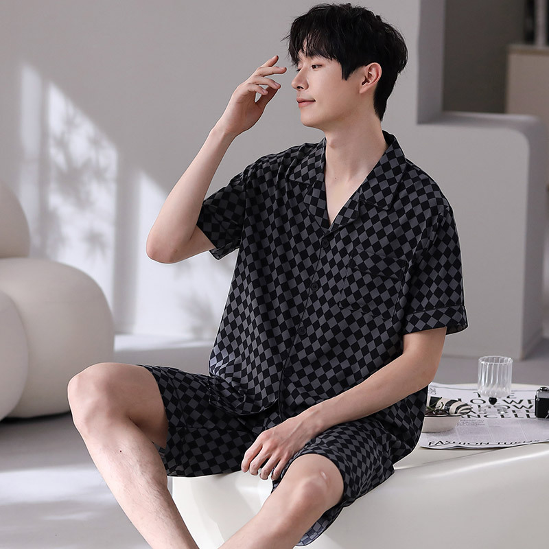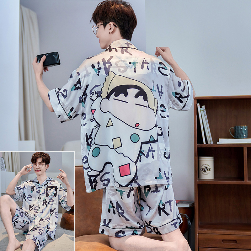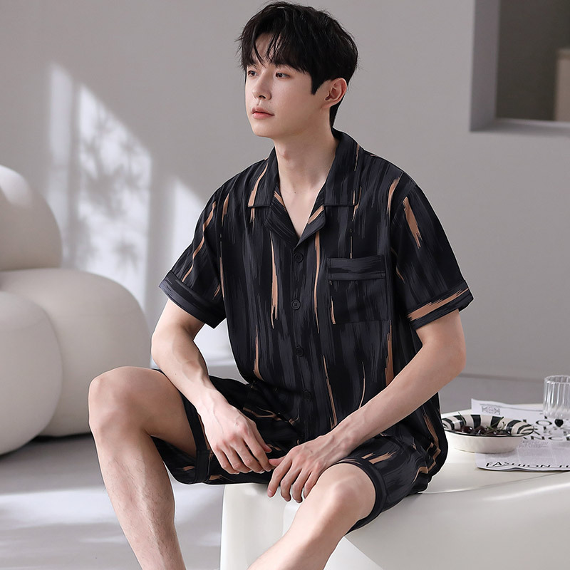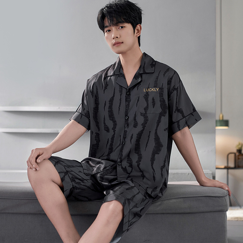 잠옷 남자 여름 얇은 얼음 실크 간단한 고급 십대 소년 한국 스타일 실크 짧은 소매 홈 의류 세트
