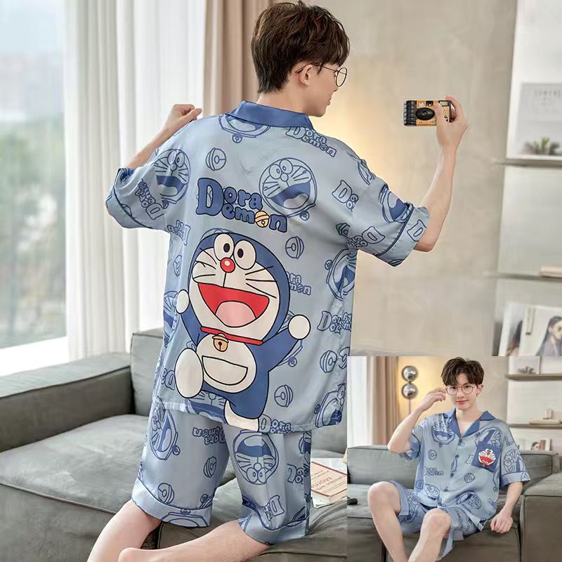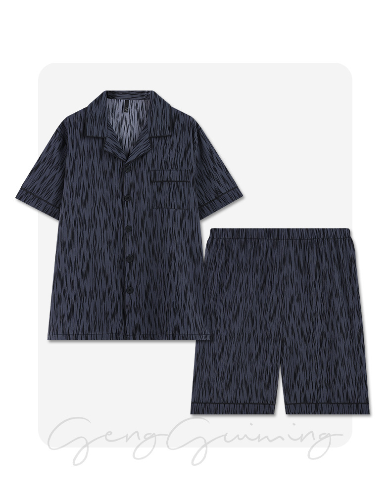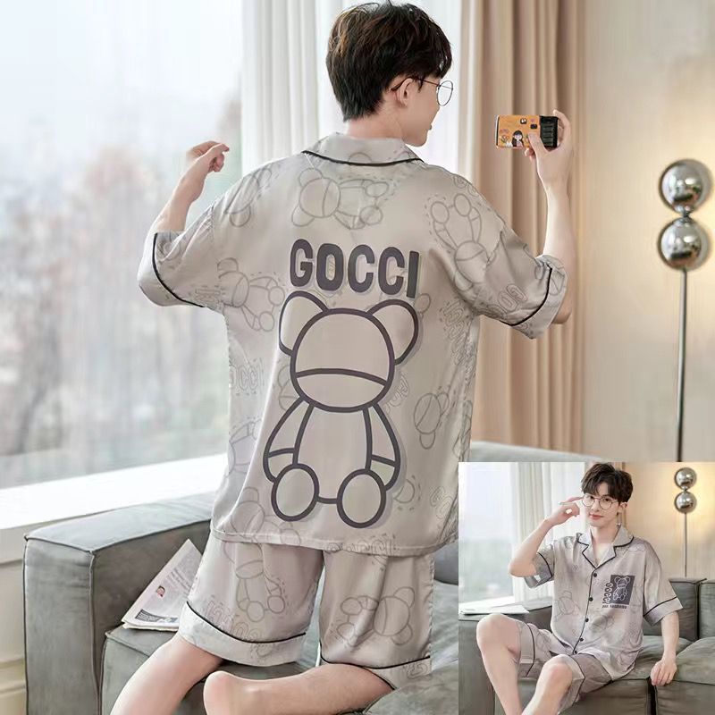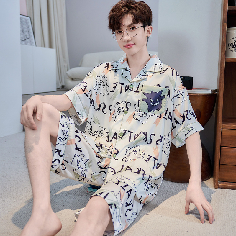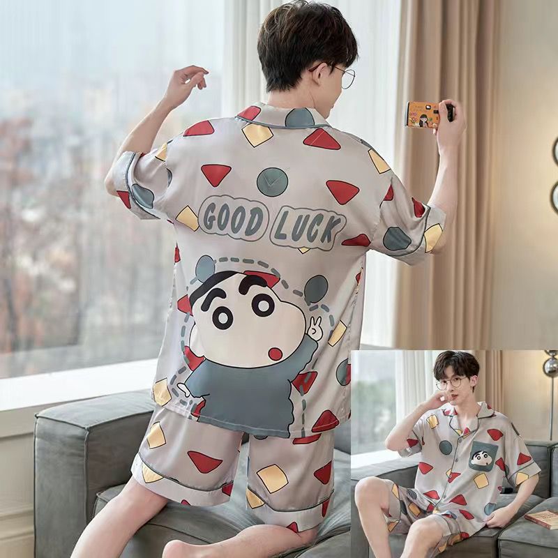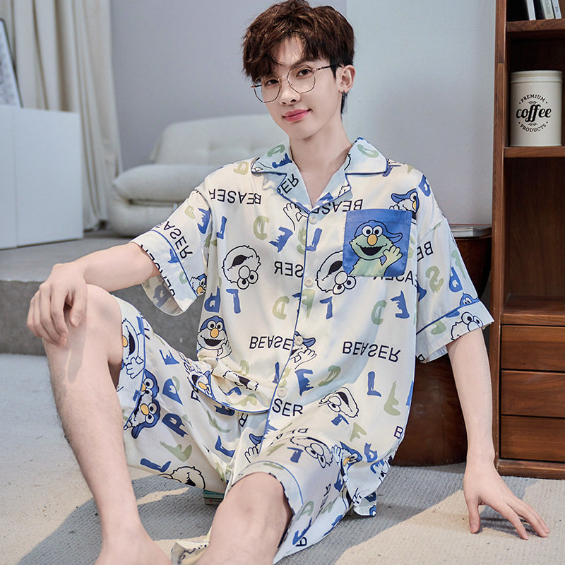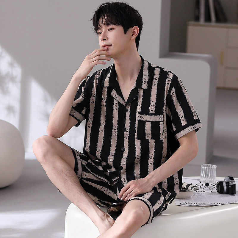 잠옷 남자 여름 얇은 얼음 실크 간단한 고급 십대 소년 한국 스타일 실크 짧은 소매 홈 의류 세트