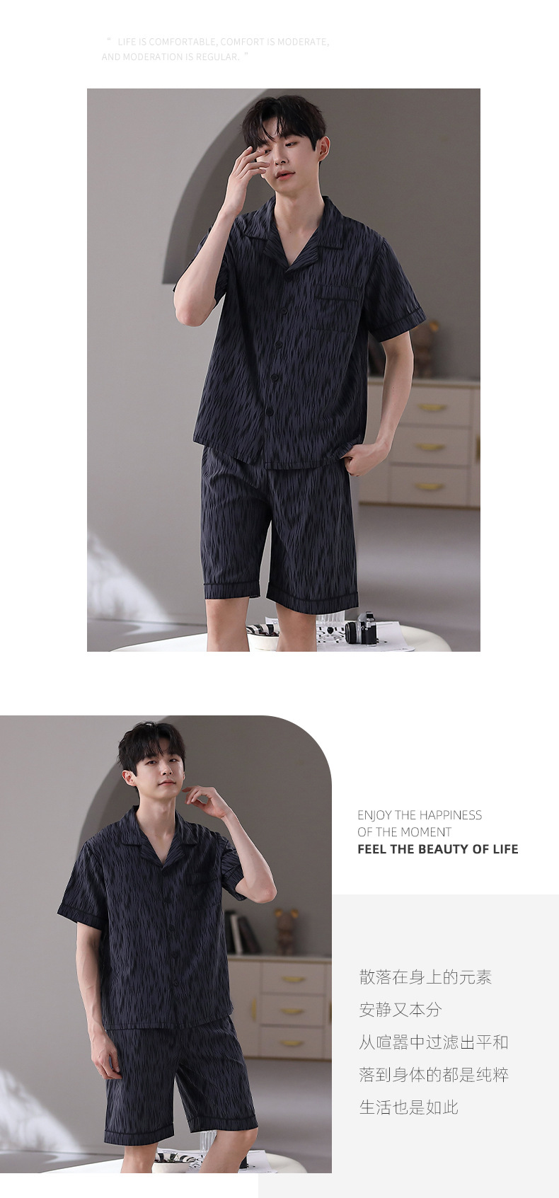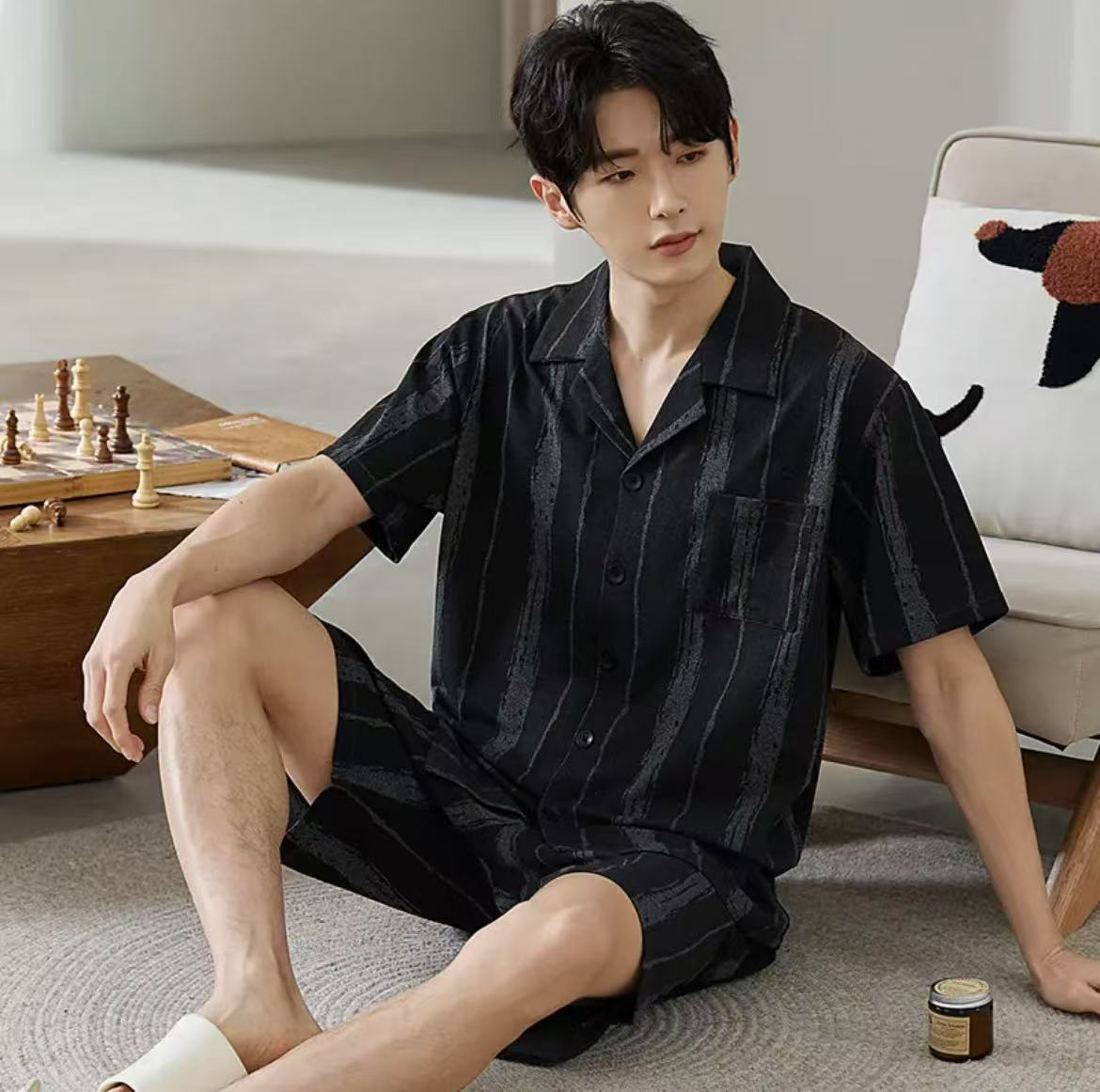 잠옷 남자 여름 얇은 얼음 실크 간단한 고급 십대 소년 한국 스타일 실크 짧은 소매 홈 의류 세트스토어 가기
