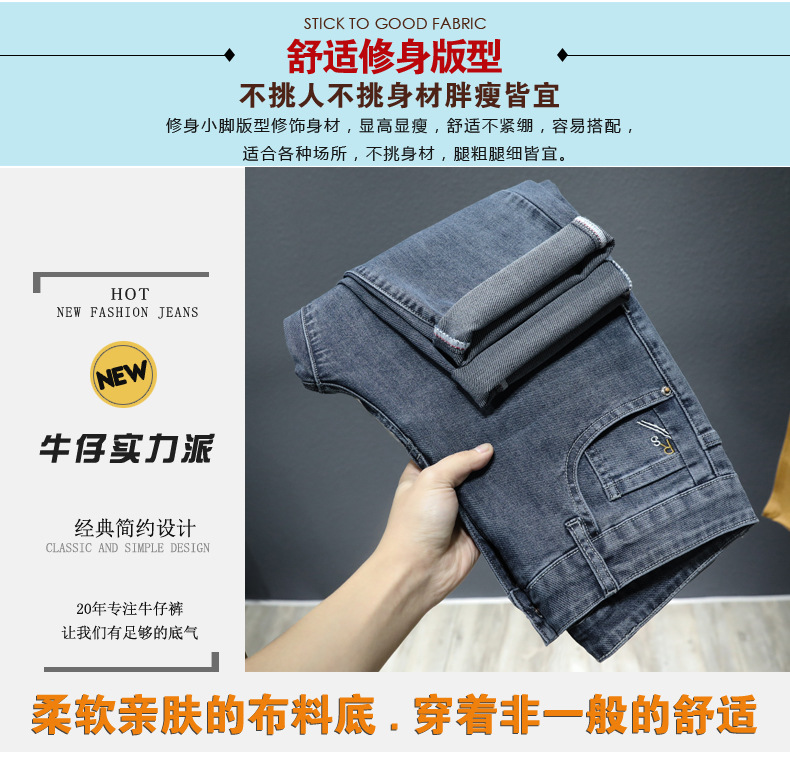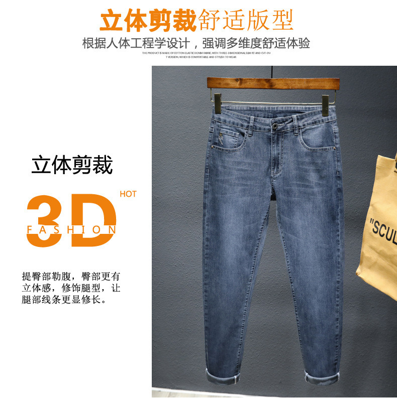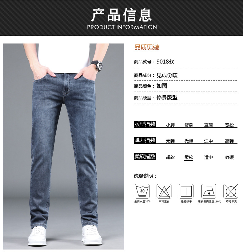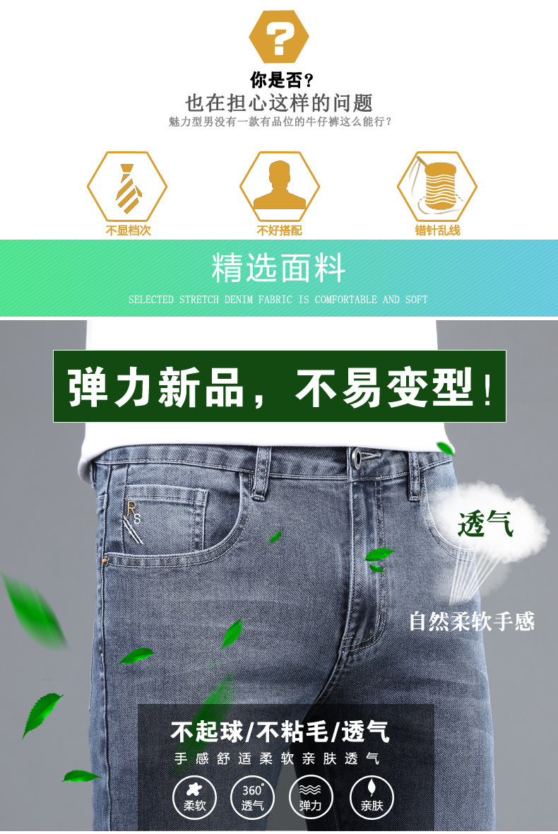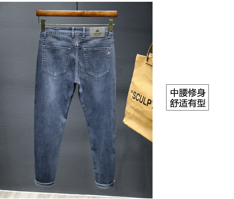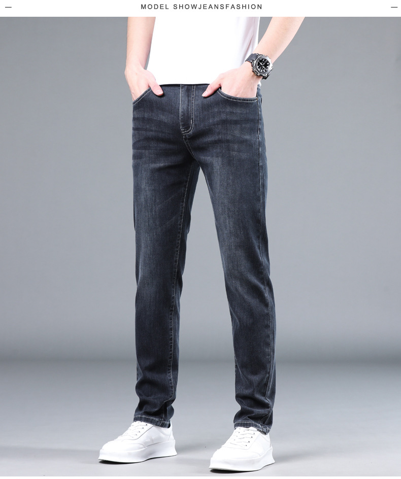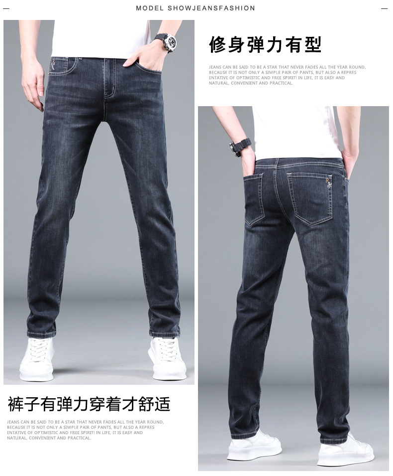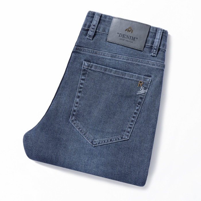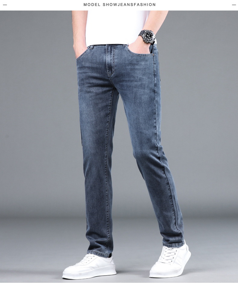 여름 남성용 청바지 슬림 핏 탄성 작은 스트레이트 얇은 편안한 부드러운 중간 허리 데님 남성용 바지