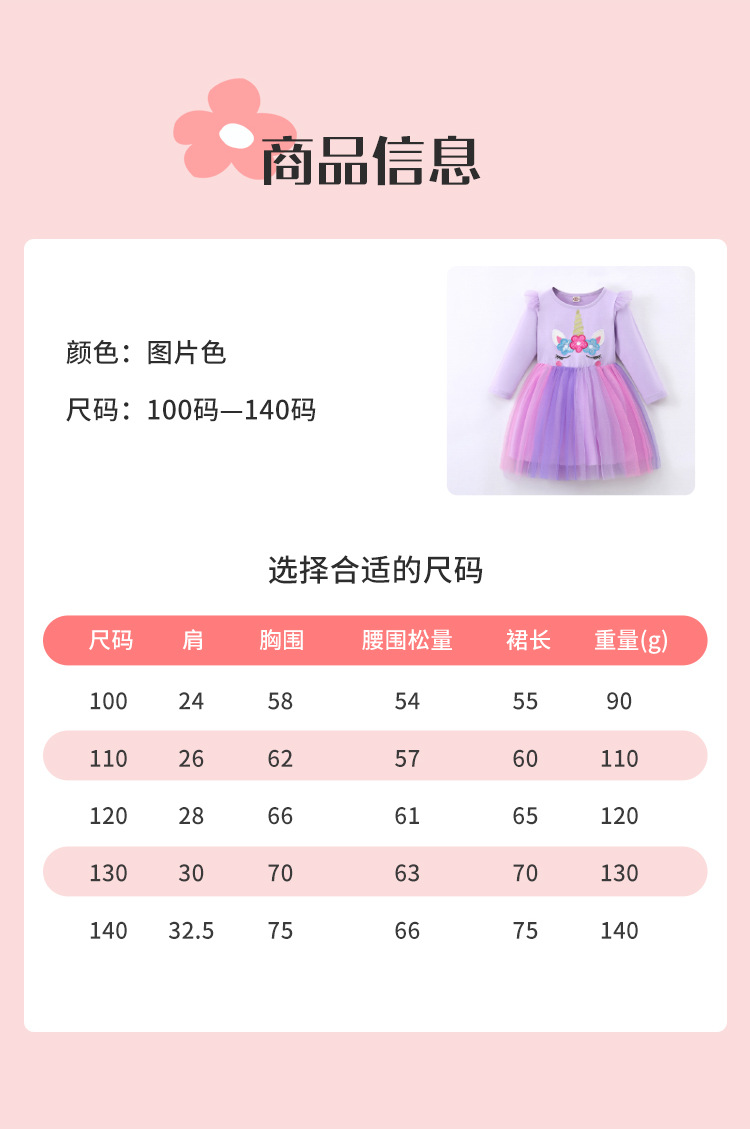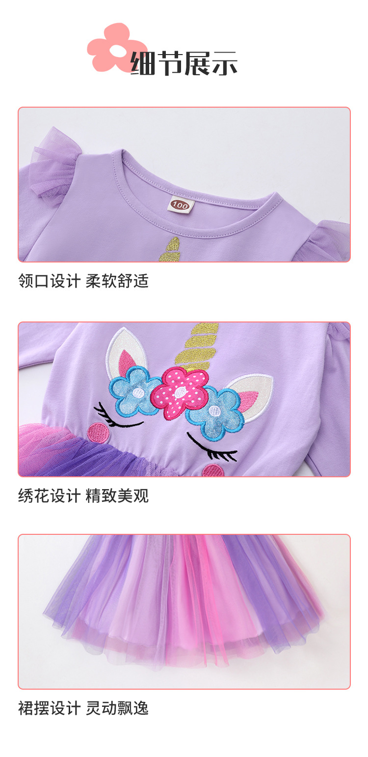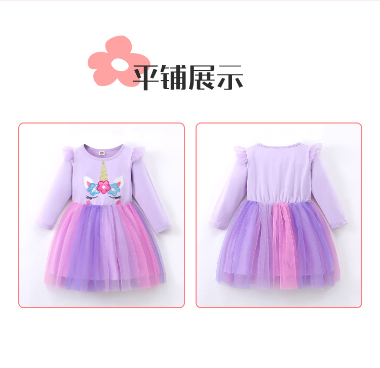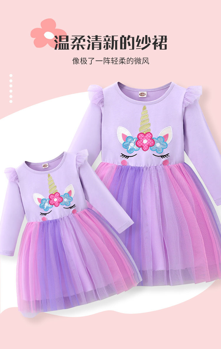 어린이 긴 소매 공주 원피스 간단한 귀여운 컬러 메쉬 원피스 만화 인터넷 인기 유니콘 소녀 원피스 아동복스토어 가기