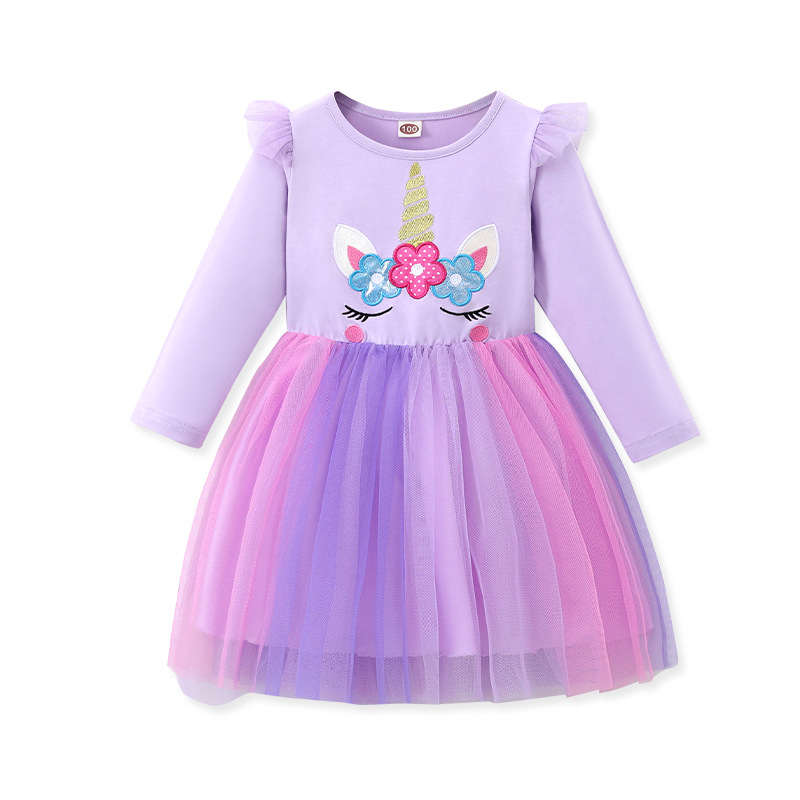 어린이 긴 소매 공주 원피스 간단한 귀여운 컬러 메쉬 원피스 만화 인터넷 인기 유니콘 소녀 원피스 아동복