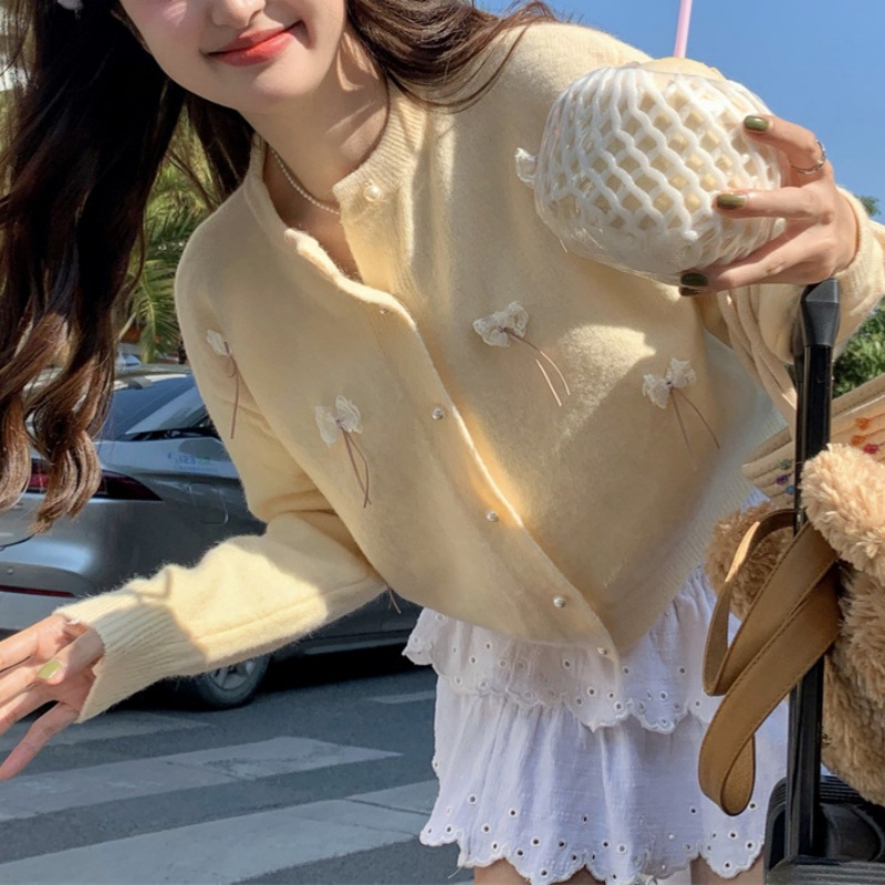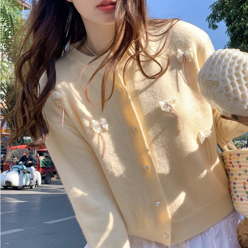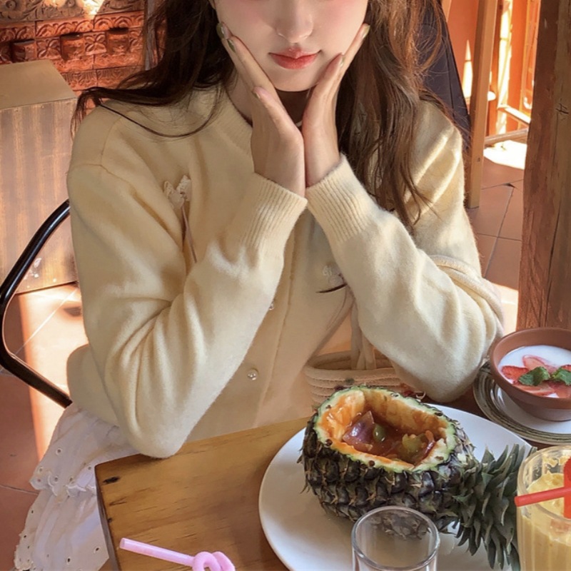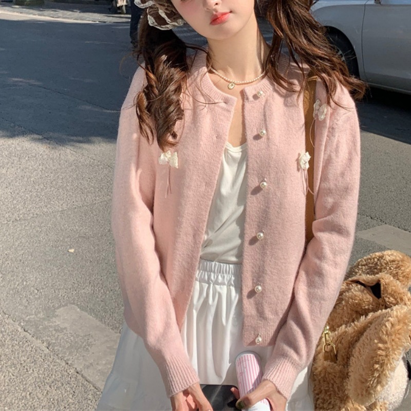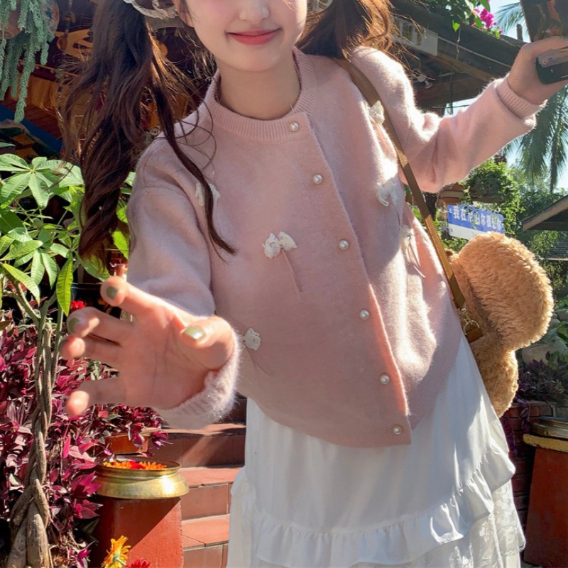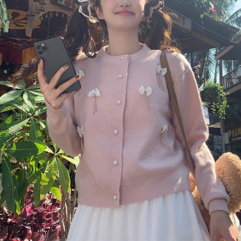 한국 봄 새로운 스타일 부드럽고 달콤한 스타일 연령 감소 디자인 입체 활 장식 니트 카디건 스웨터 여성용스토어 가기