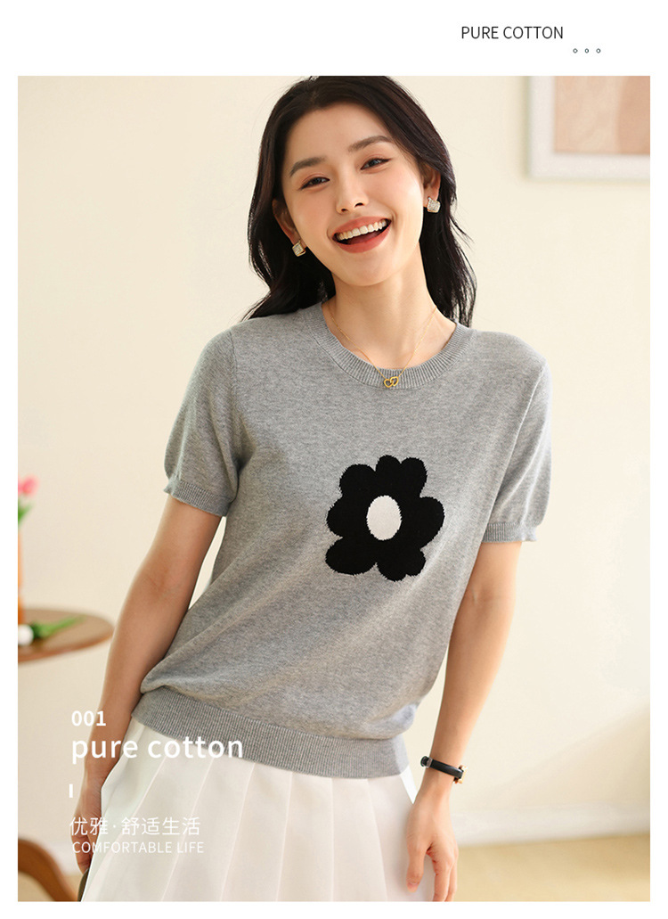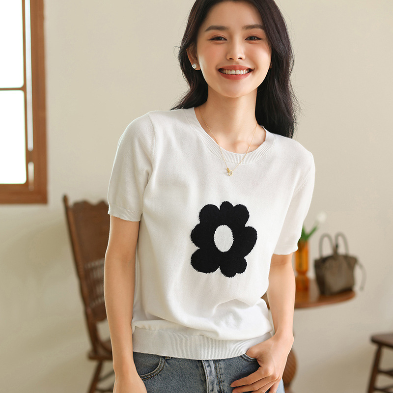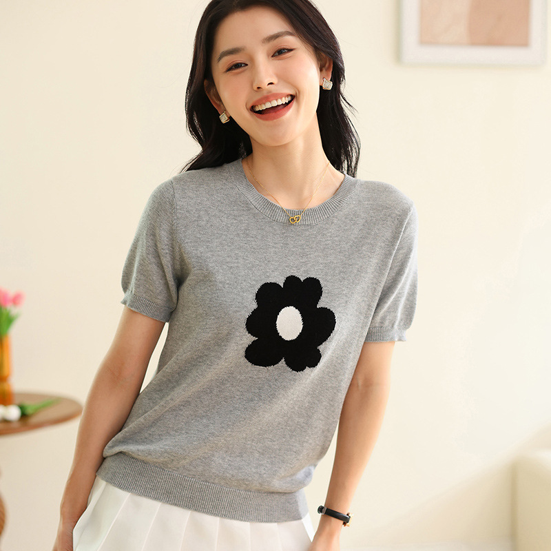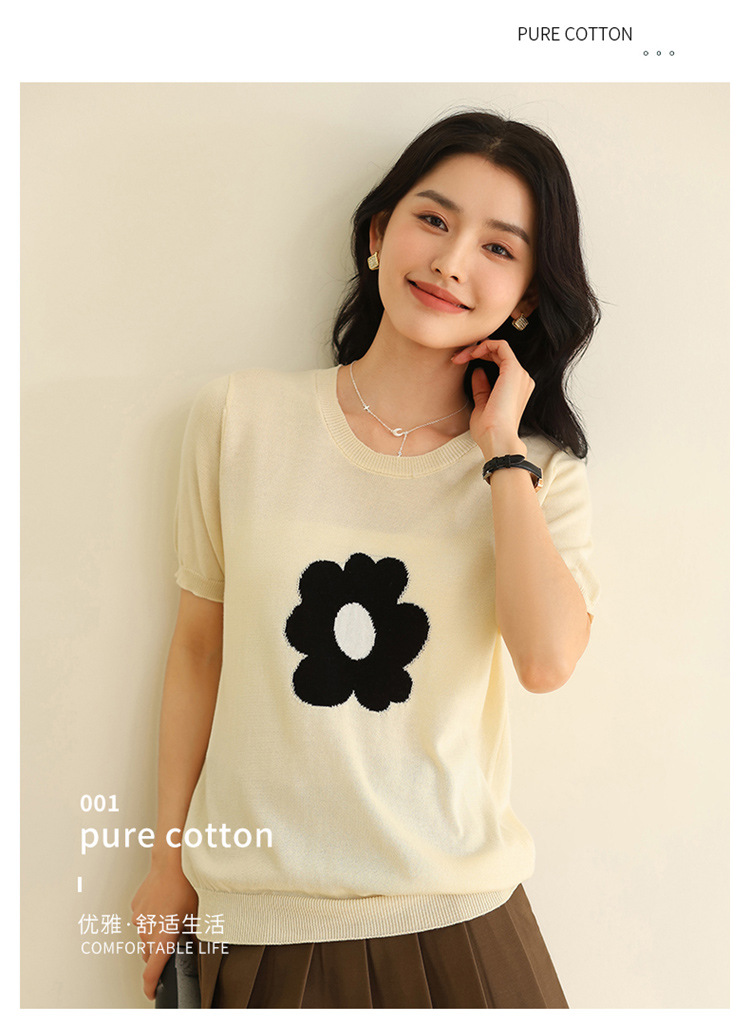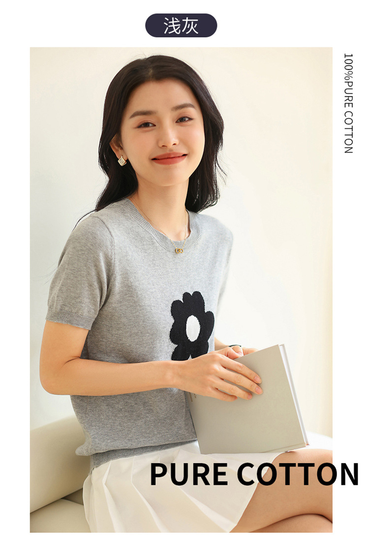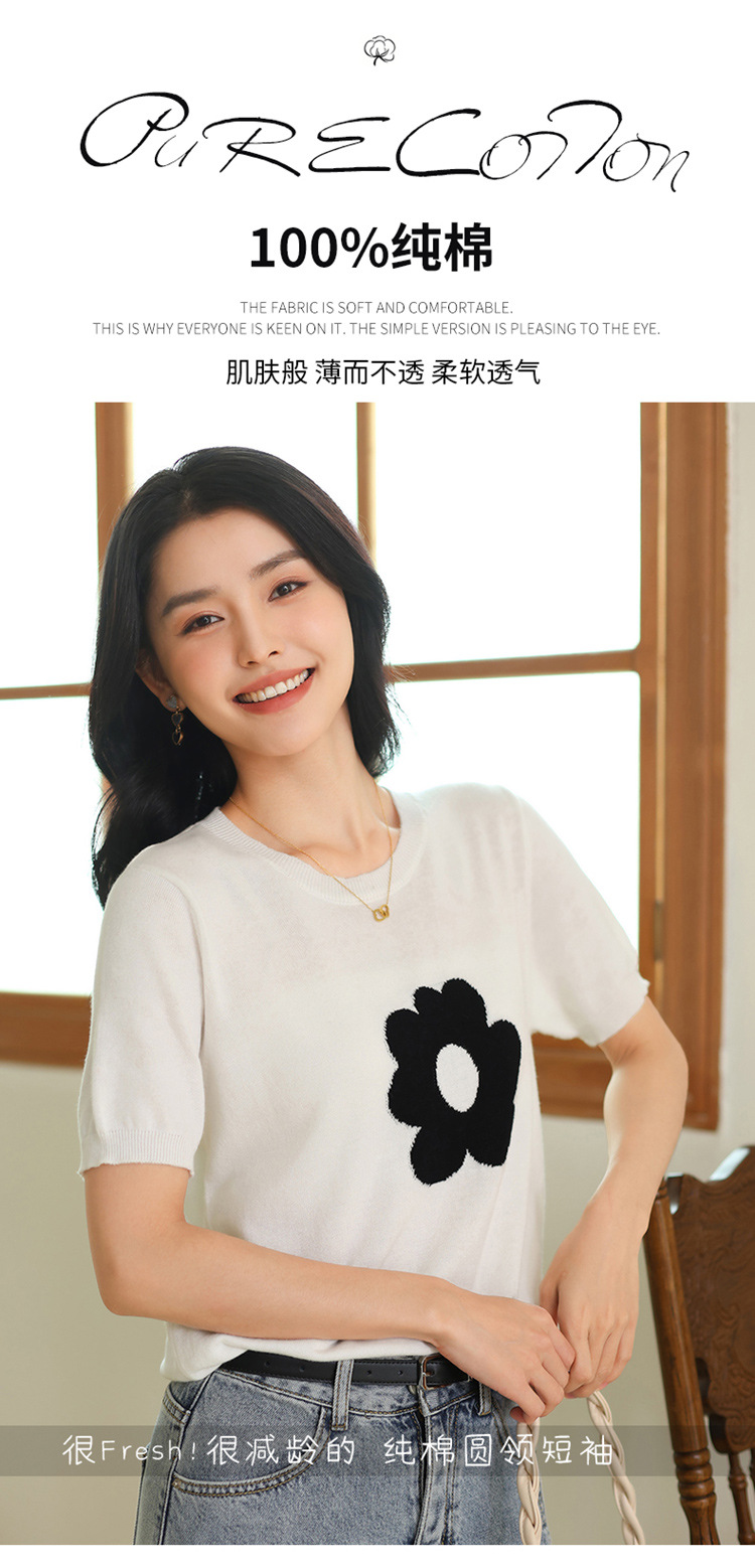 2026년 여름 신상 얇은 순면 라운드넥 우아한 해바라기 티셔츠 여성용 루즈핏 다용도 반팔 티셔츠 니트웨어스토어 가기
