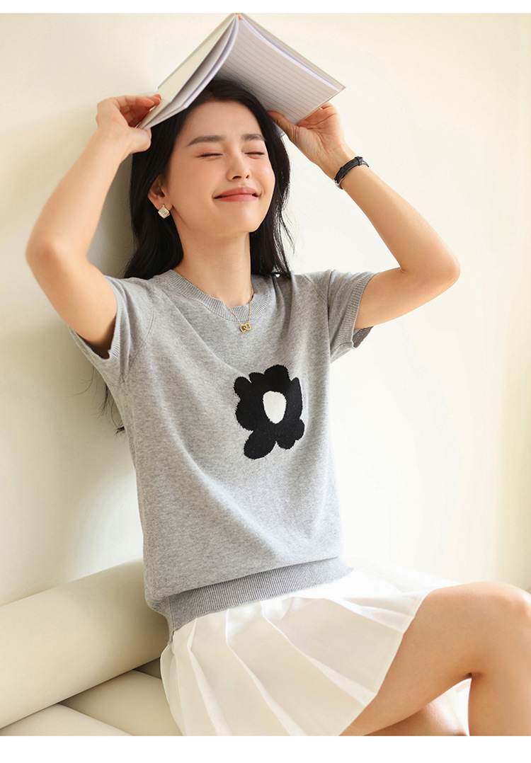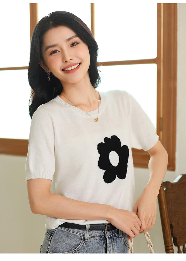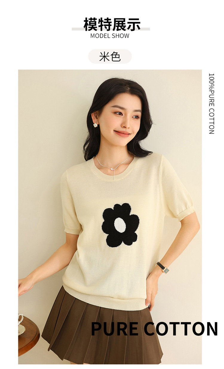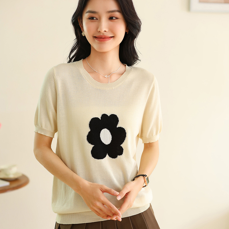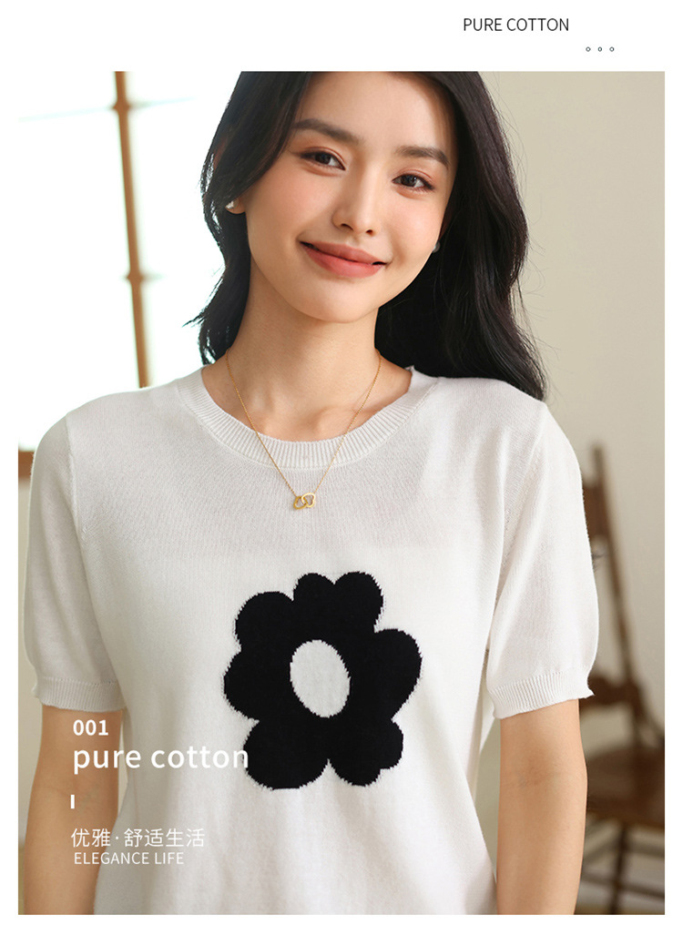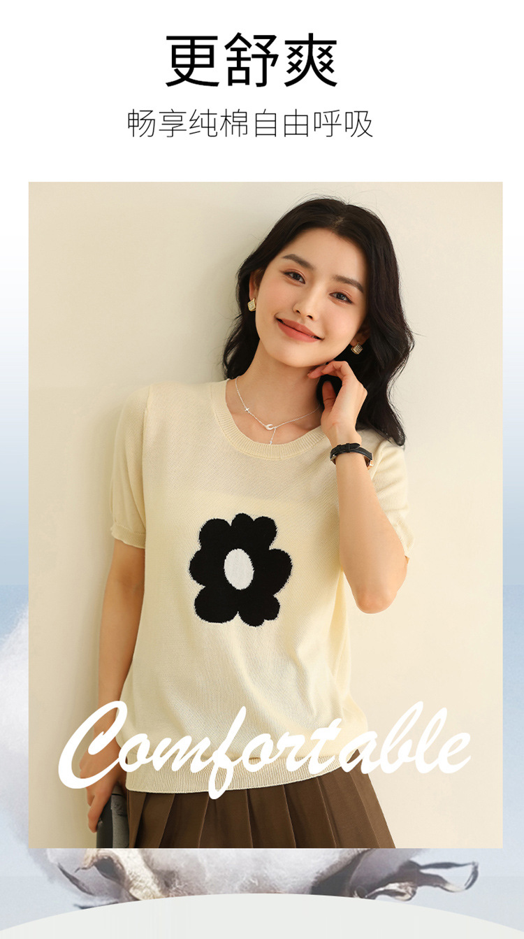 2026년 여름 신상 얇은 순면 라운드넥 우아한 해바라기 티셔츠 여성용 루즈핏 다용도 반팔 티셔츠 니트웨어스토어 가기