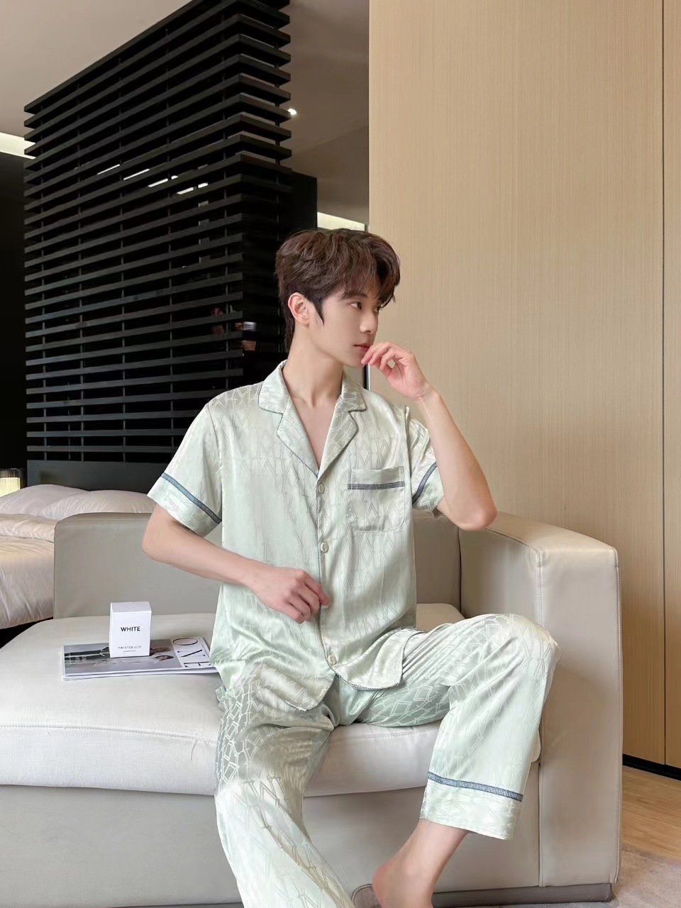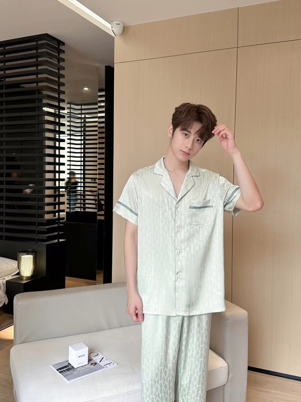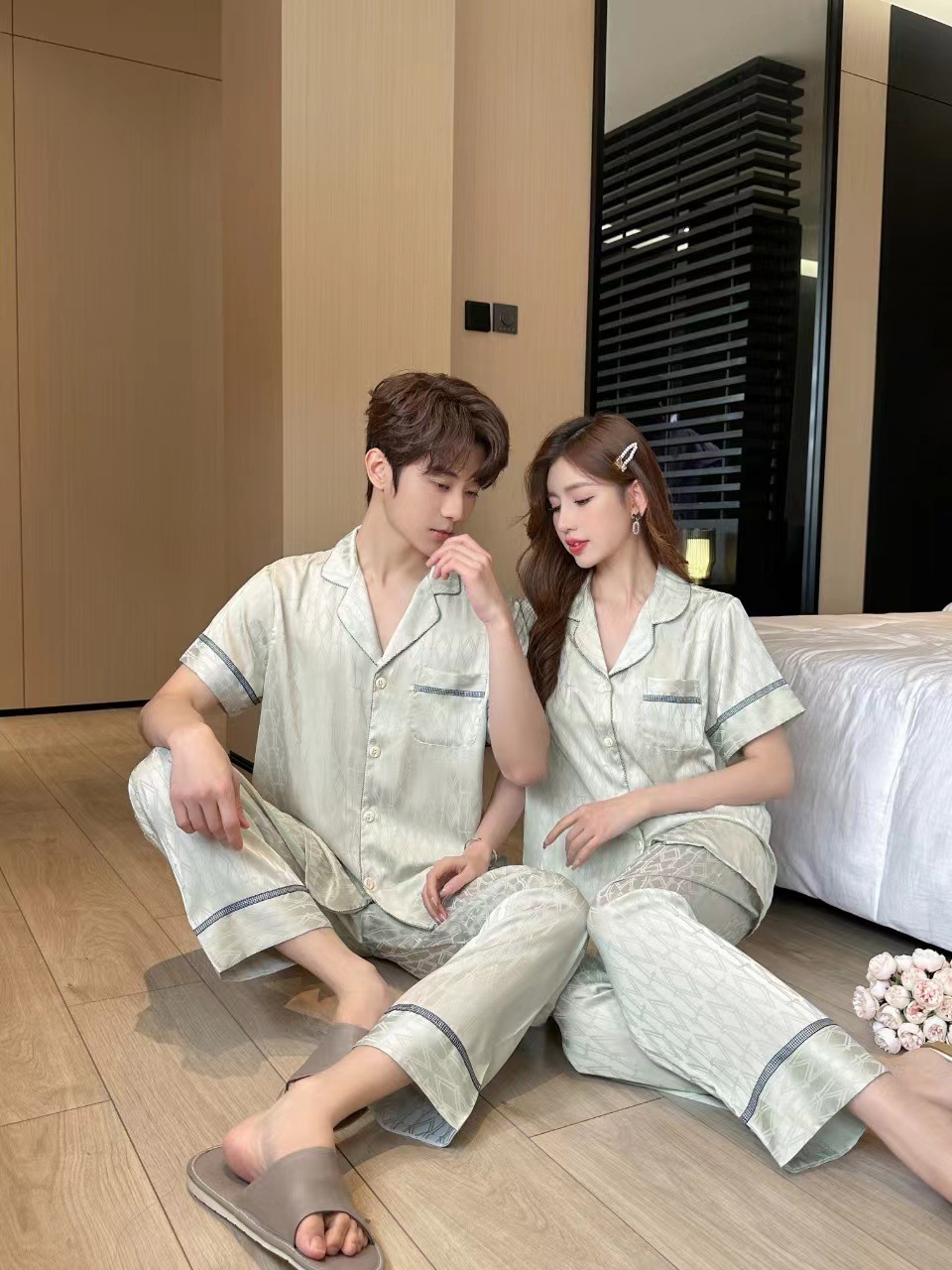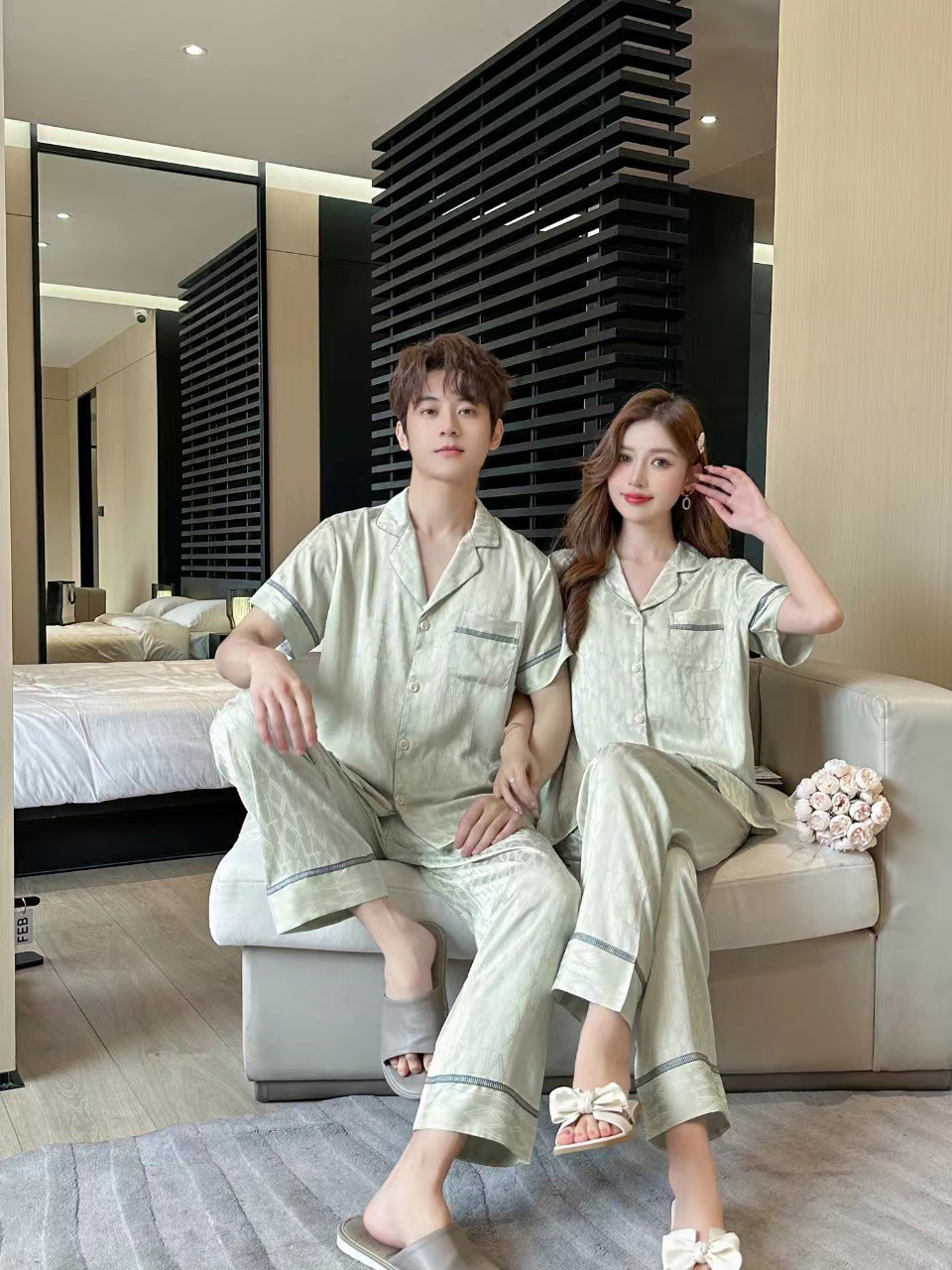 20242024 여름 새 커플 잠옷 여성의 아이스 실크 인쇄 하이 엔드 감각 남성 캐주얼 반팔 바지 홈스토어 가기