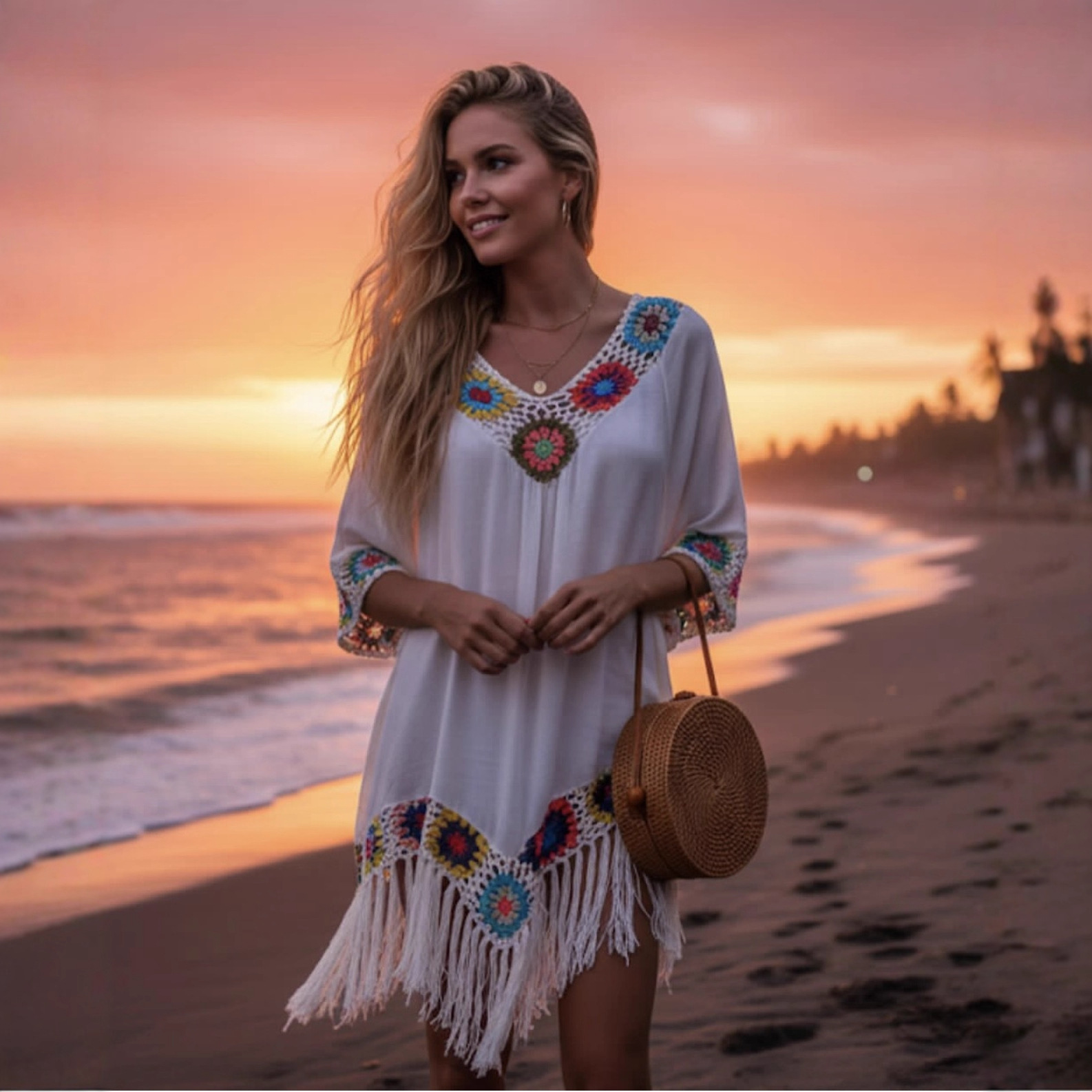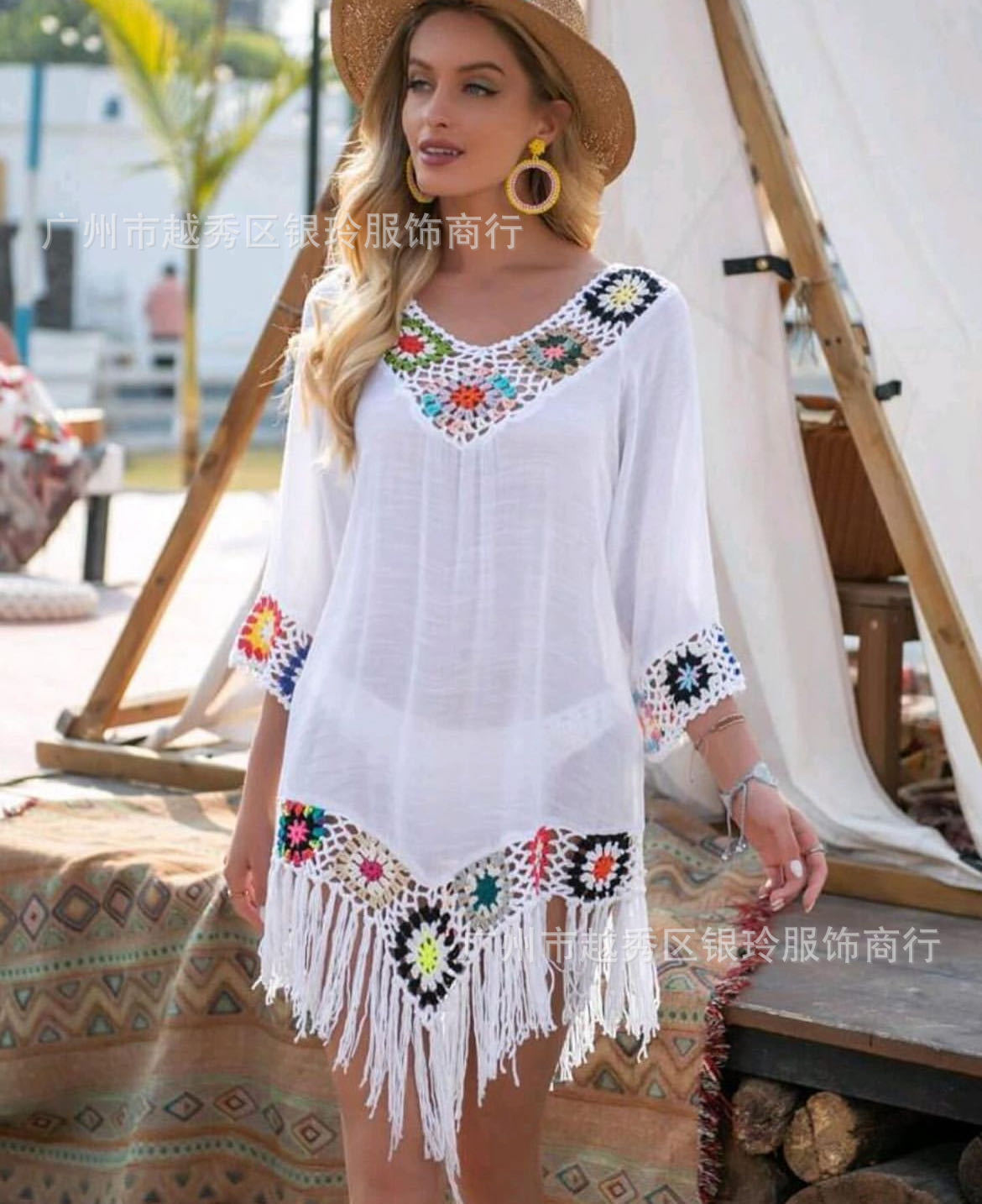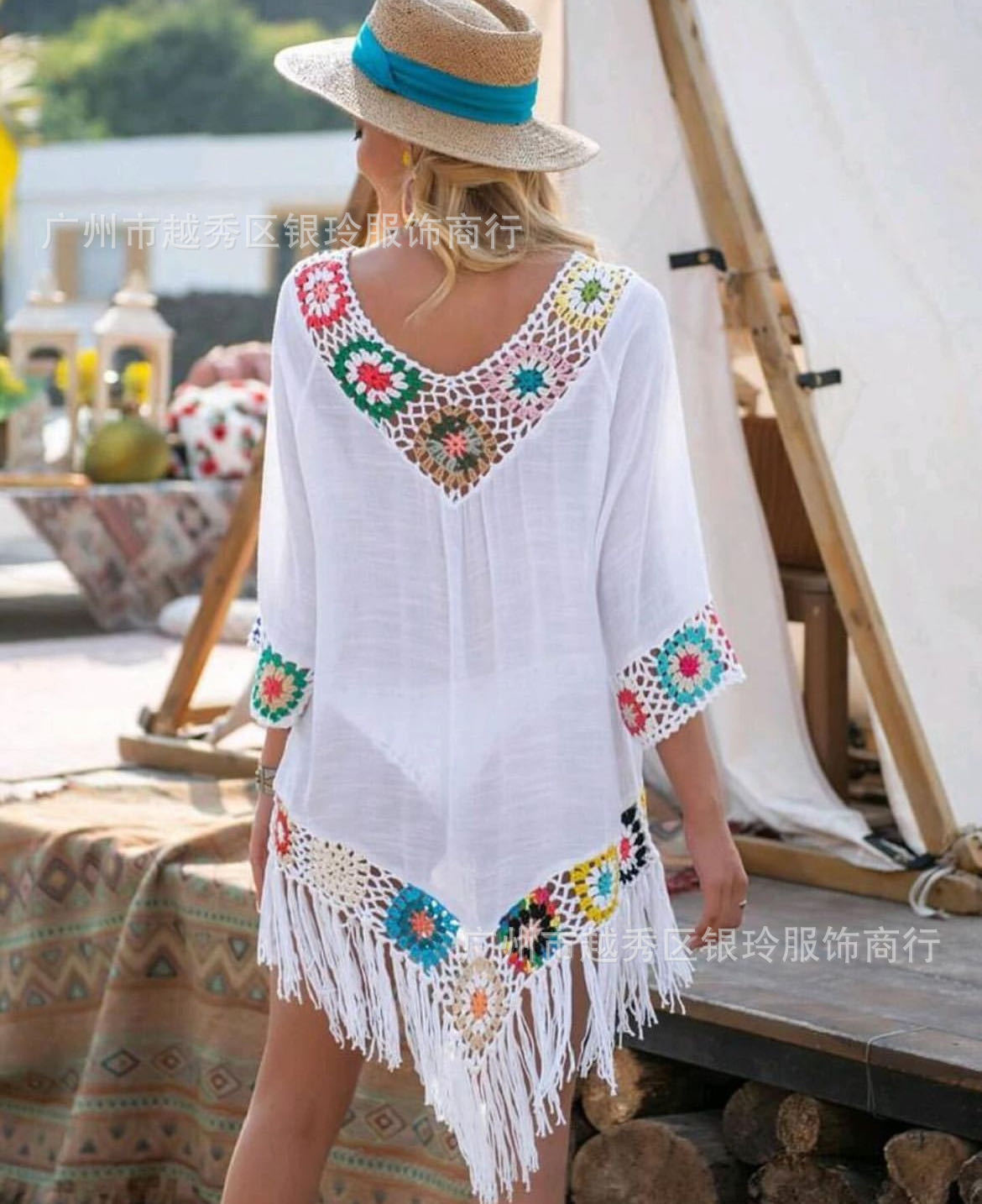 유럽과 미국의 보헤미안 스타일 핸드 훅 스티칭 슬럽 천 비치 수영복 빈 니트 블라우스 비키니 선 스크린