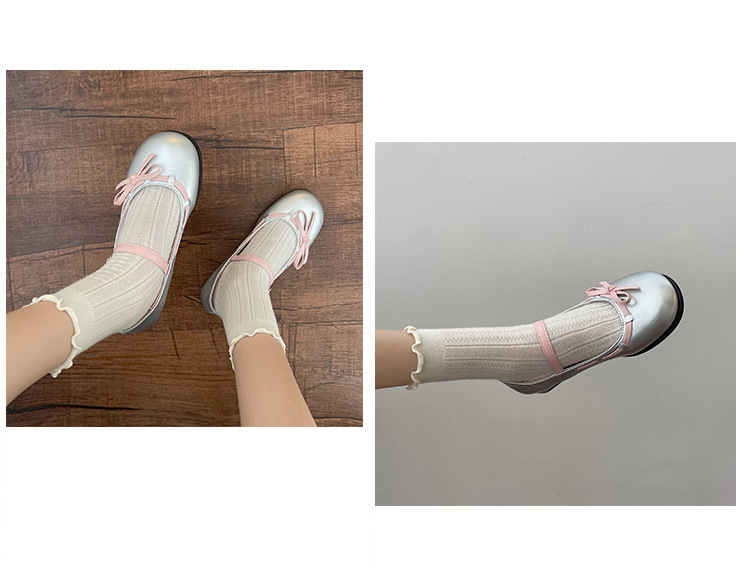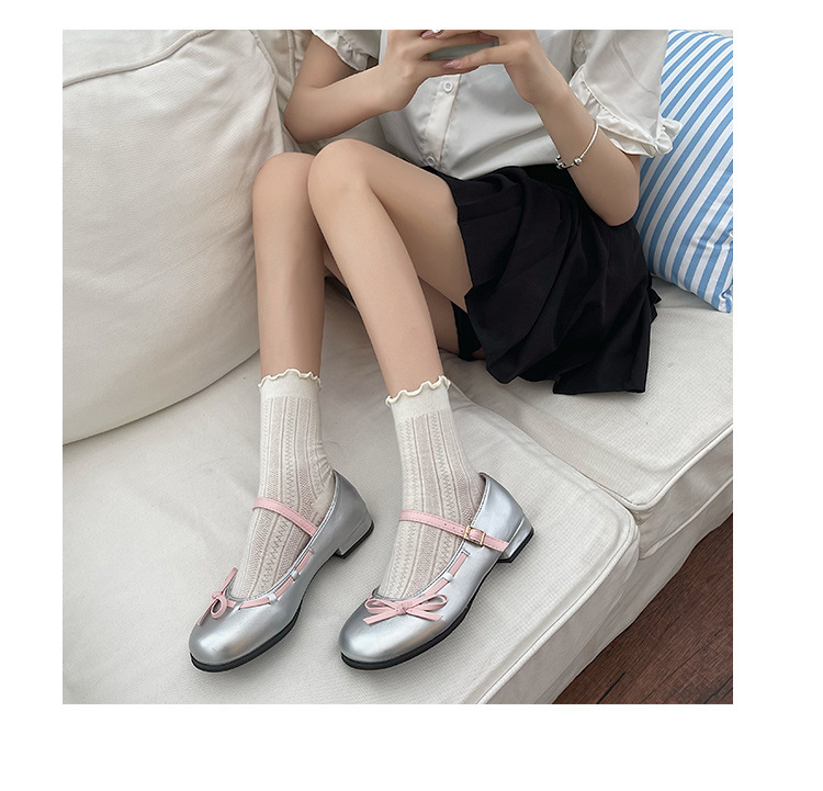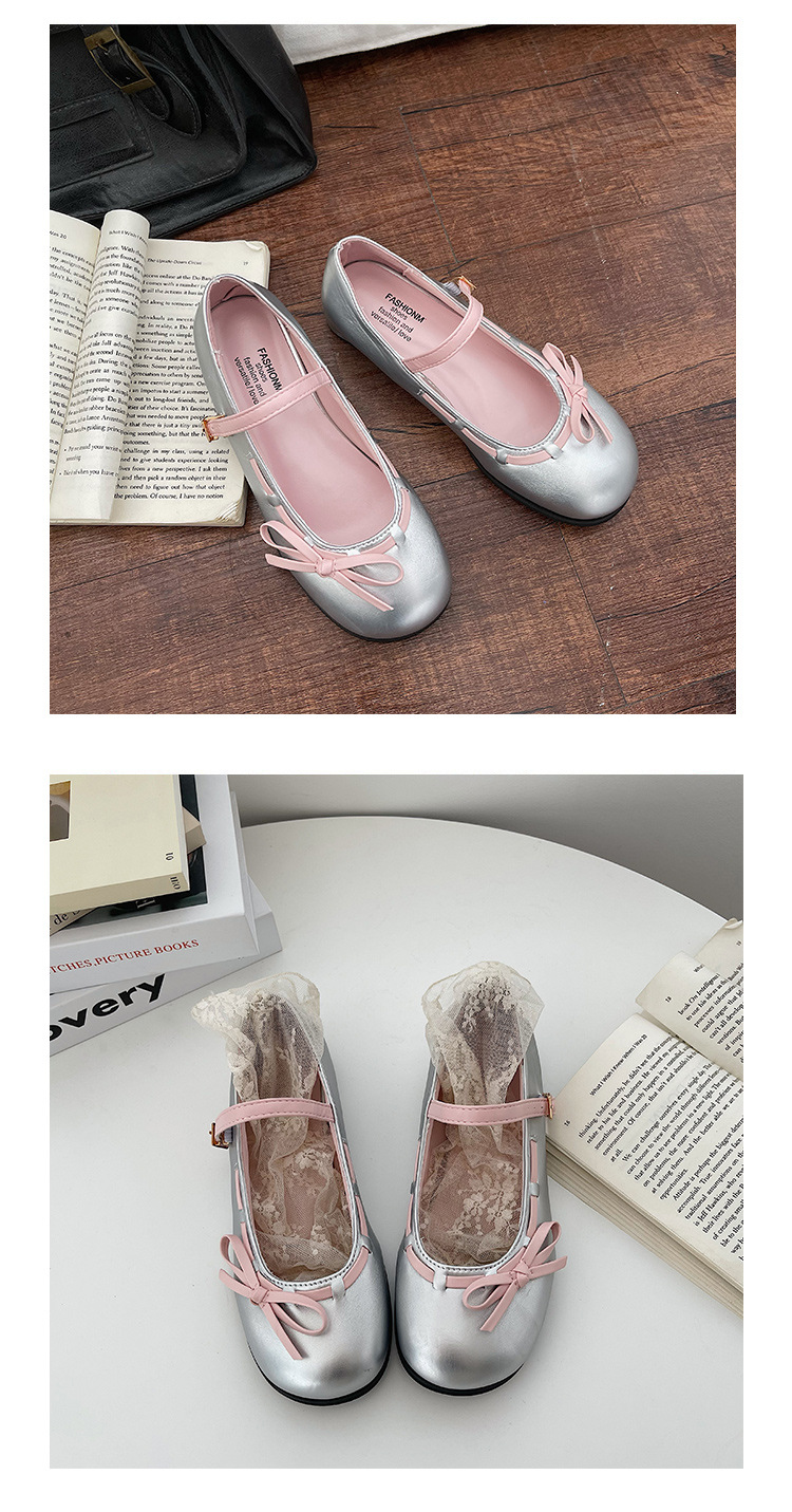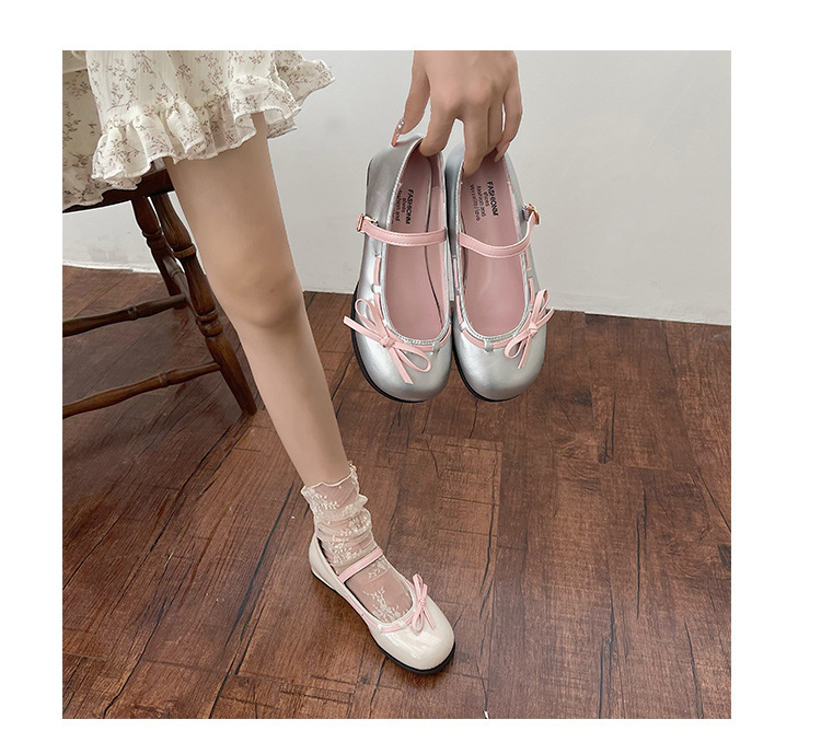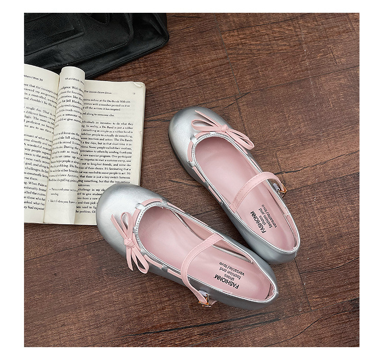 둥근 발가락 활 두꺼운 밑바닥 메리 제인 가죽 신발 여성의 여름 2024 새로운 프랑스 얕은 입 실버 신발
