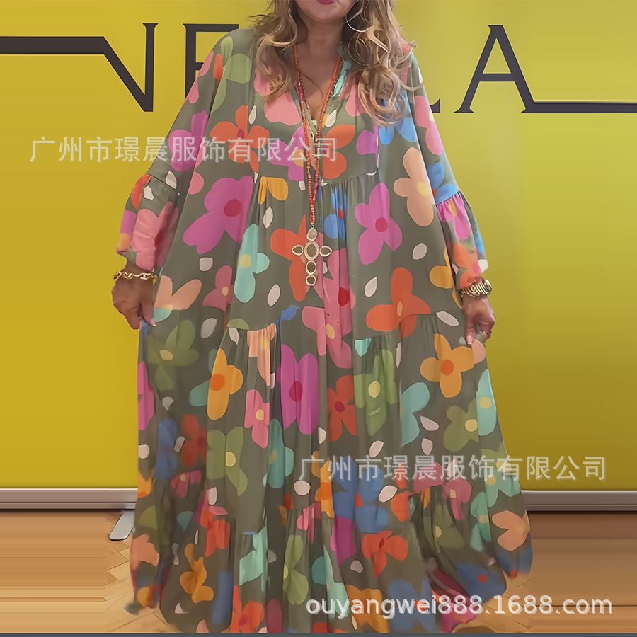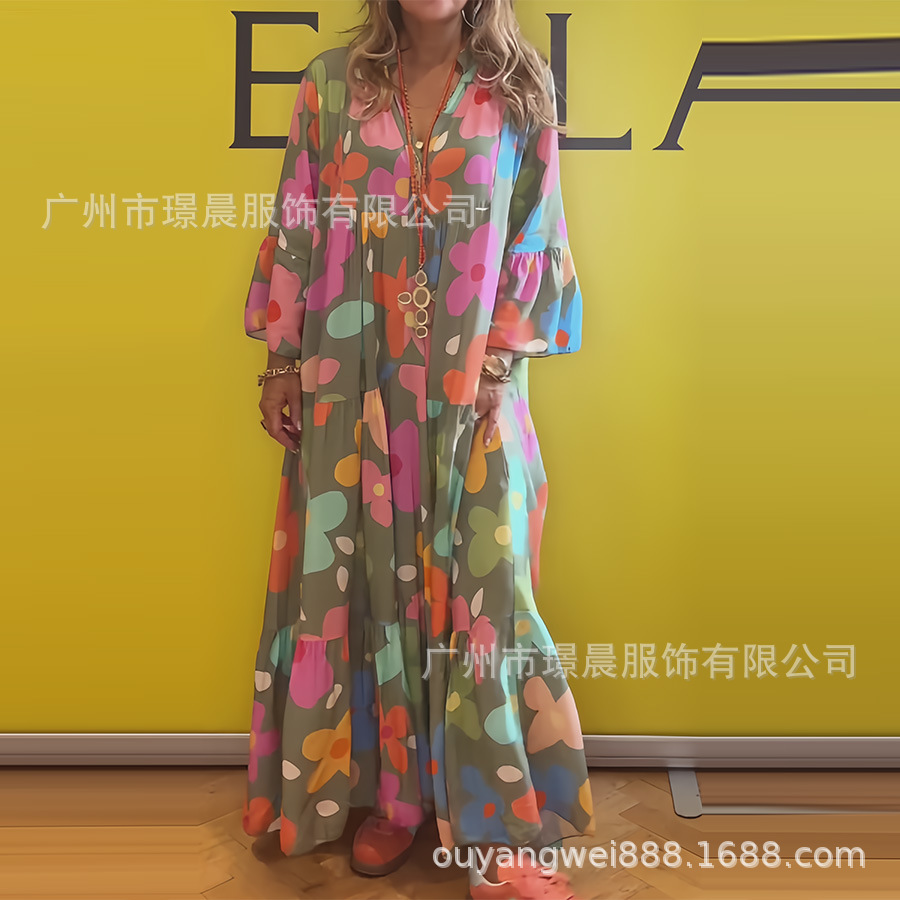 아마존 2024 여름 새로운 느슨한 인쇄 원피스 패션 국경 대외 무역 여성의 긴 소매 원피스