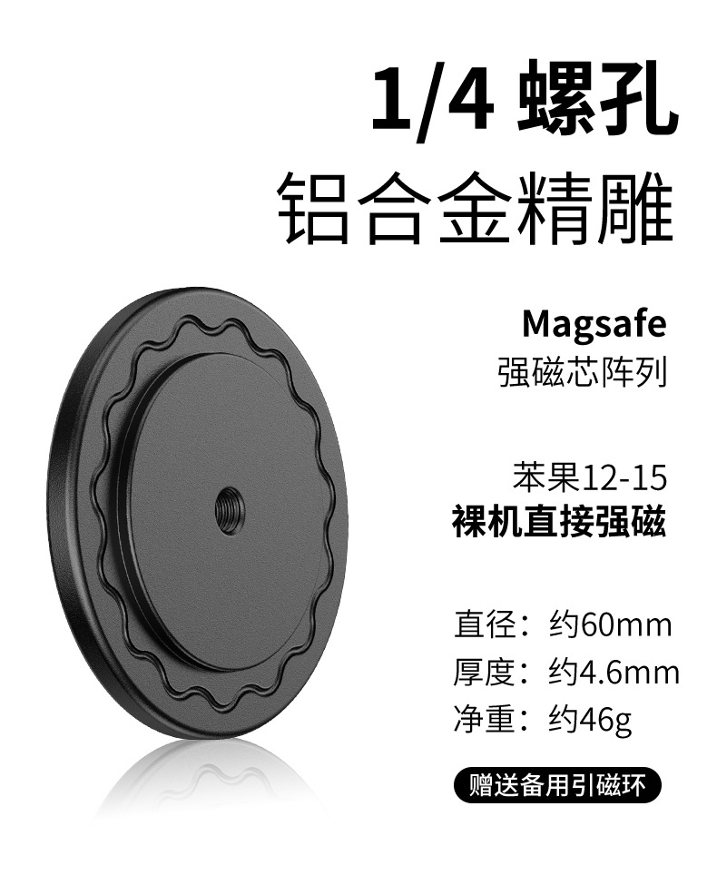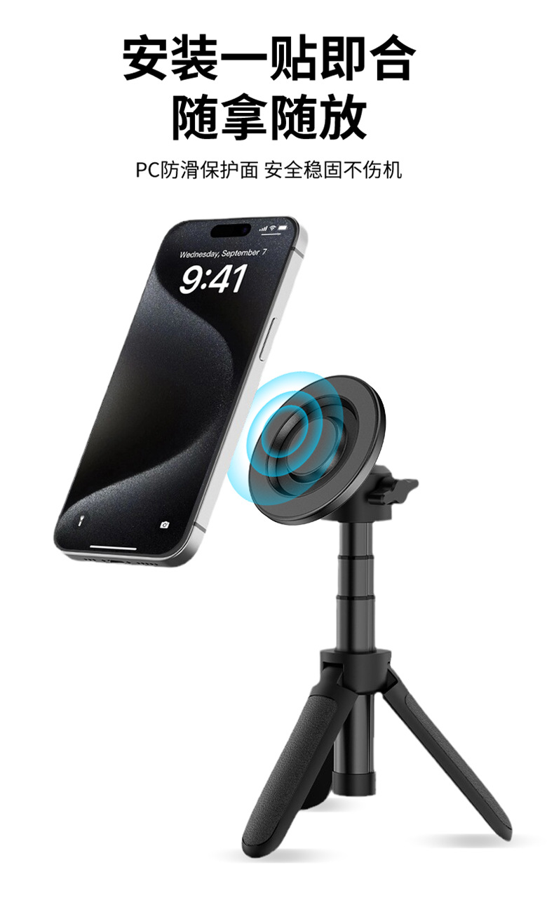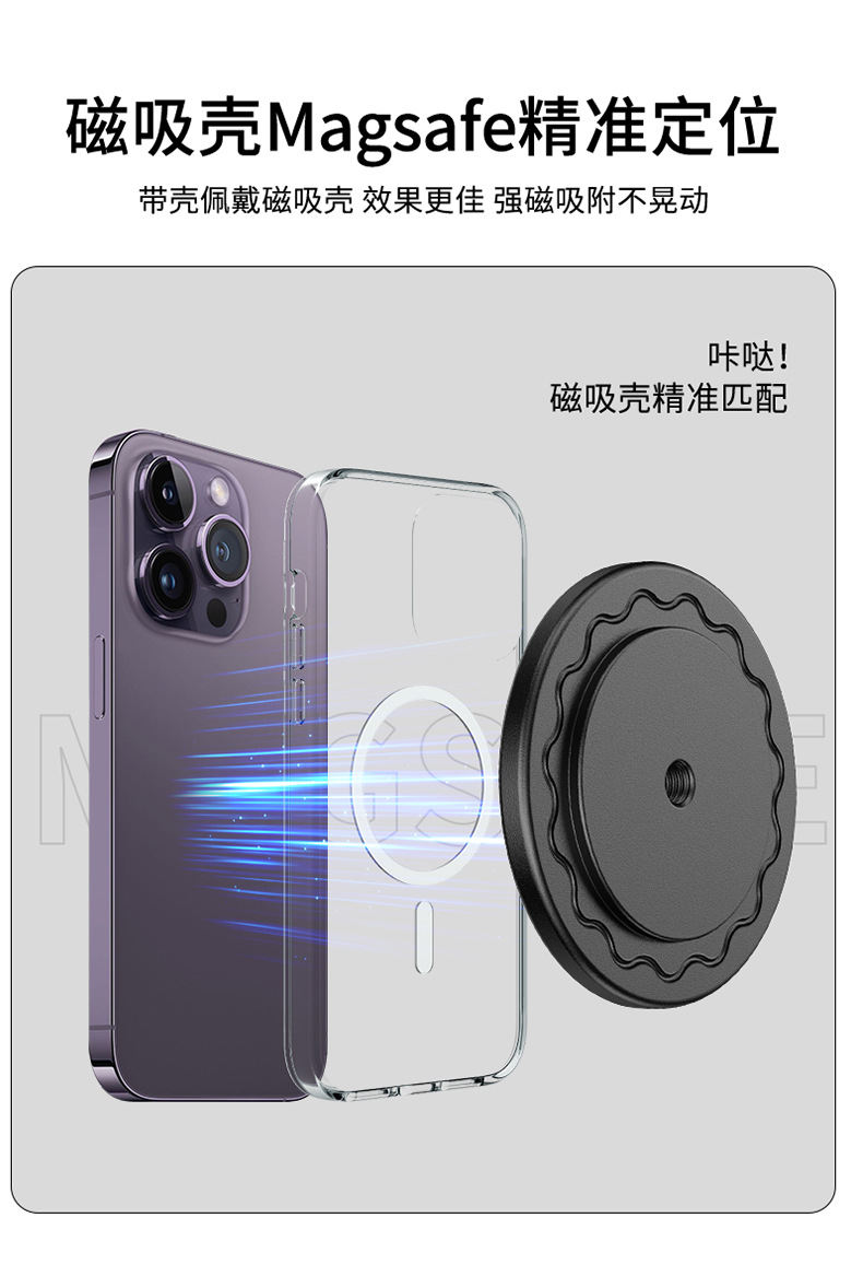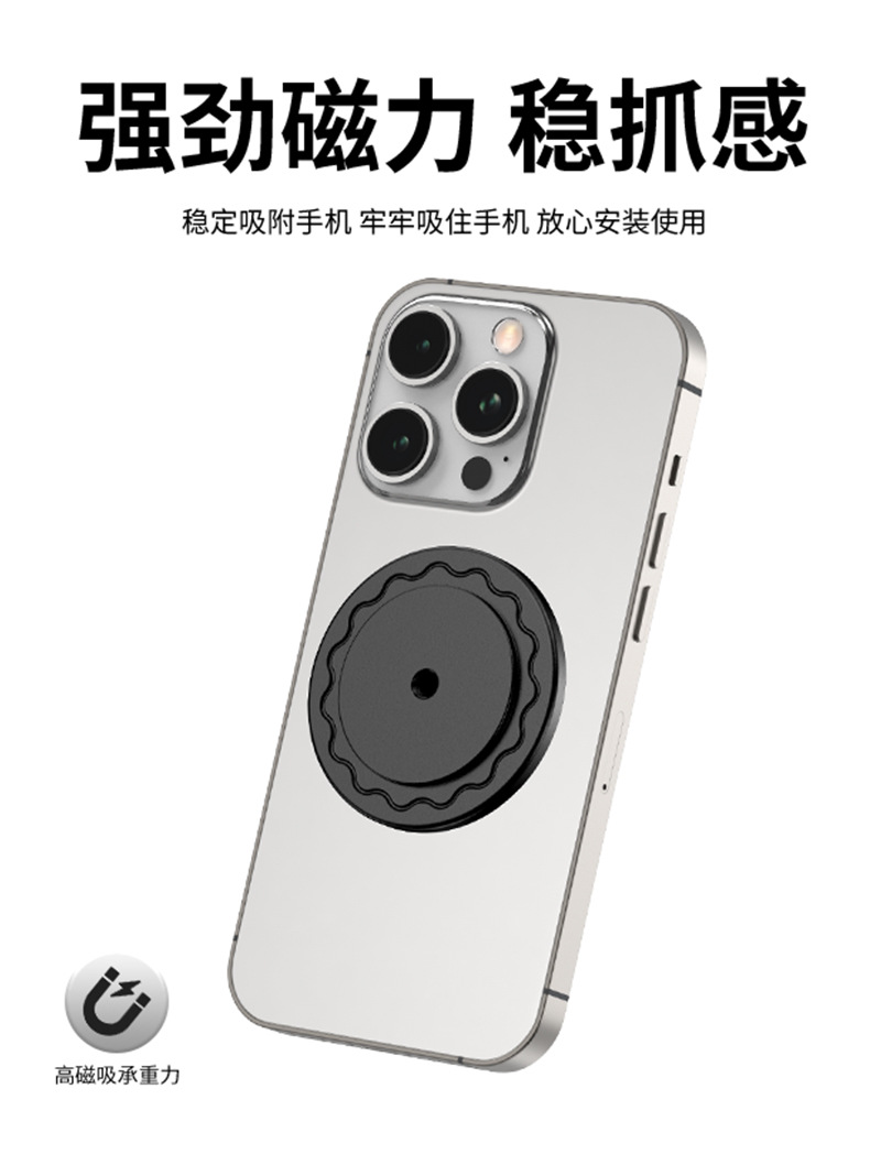 本产品采用铝合金材质打造,CNC机加工处理,精密度高,外观氧化工艺,倒边圆润手感好,更具高级质感,内部采用N52铷强磁铁,PC材质接触面,防滑防刮花设备,磁吸式单手取放手机,更方便。