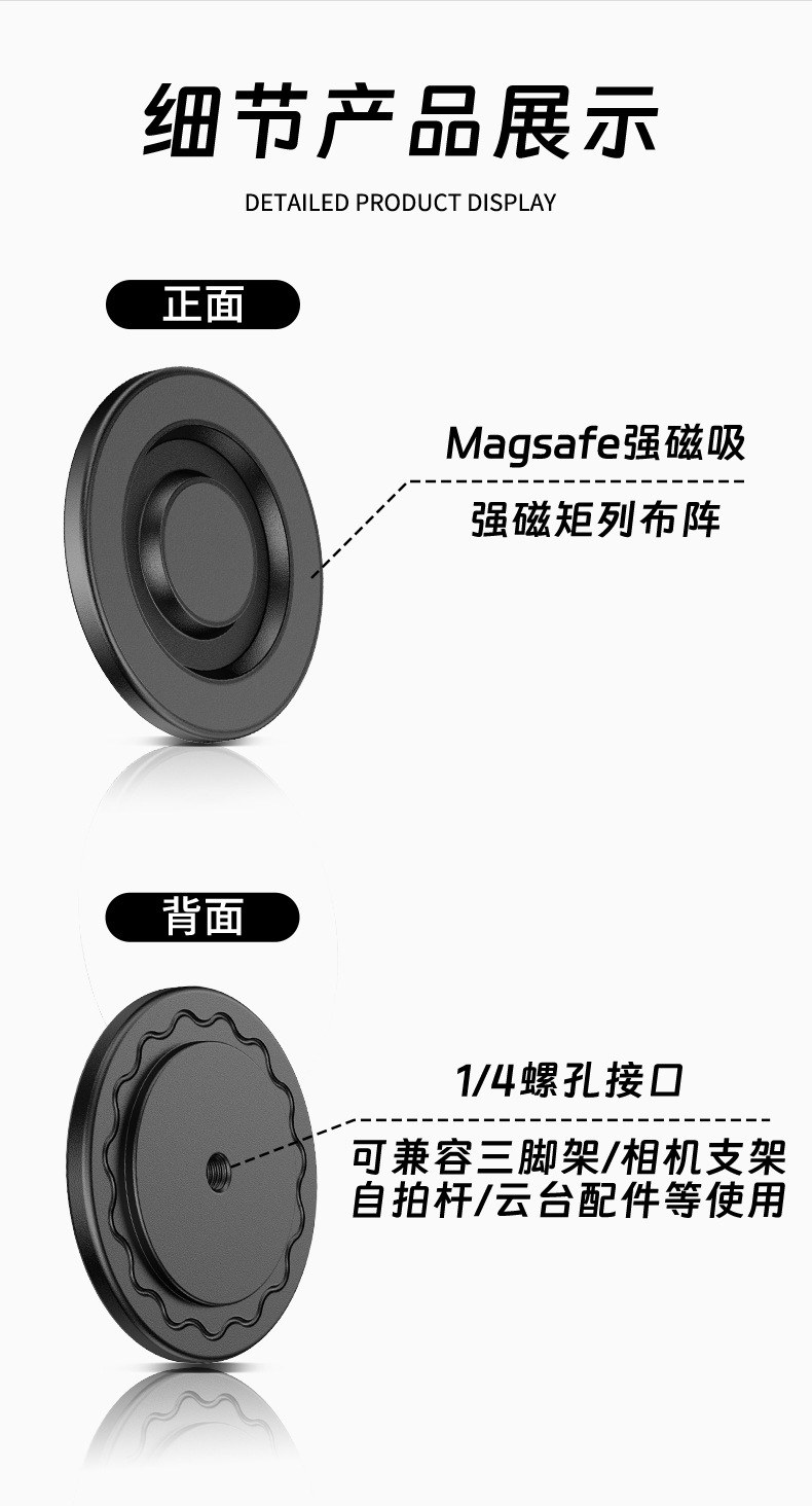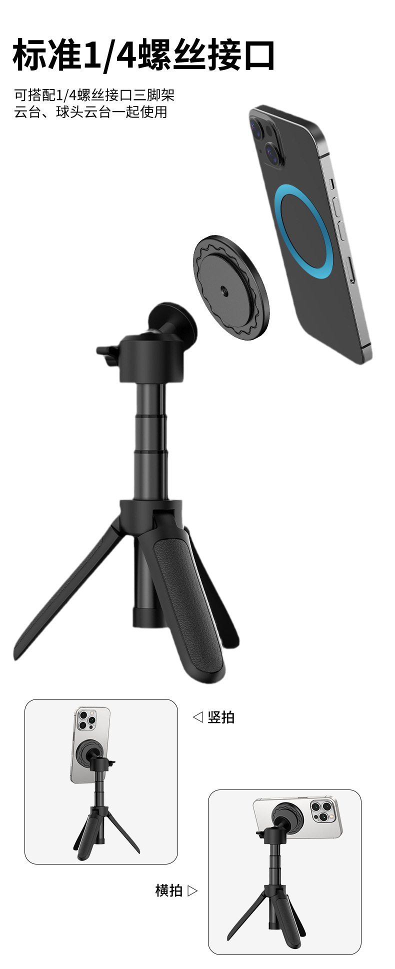 ①:1/4螺丝孔,通用1/4螺丝,适配桌面/车载,直播等支架...