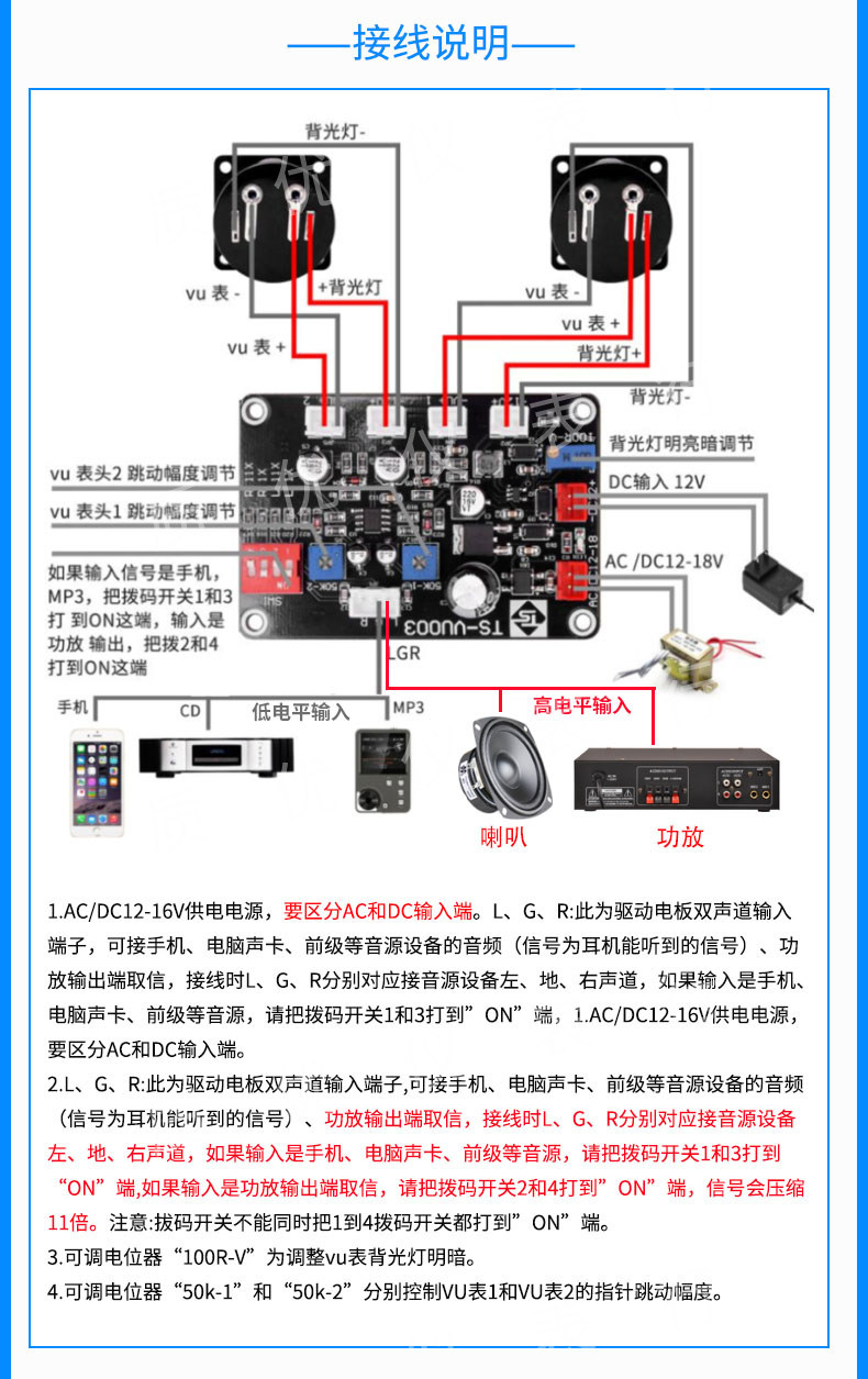 빛과 어두운 백라이트 DB 전력 증폭기 담즙 기계 섀시 VU 레벨 미터 헤드 드라이버 보드의 조정으로 고주파 및 저주파 액세스를 지원합니다.스토어 가기