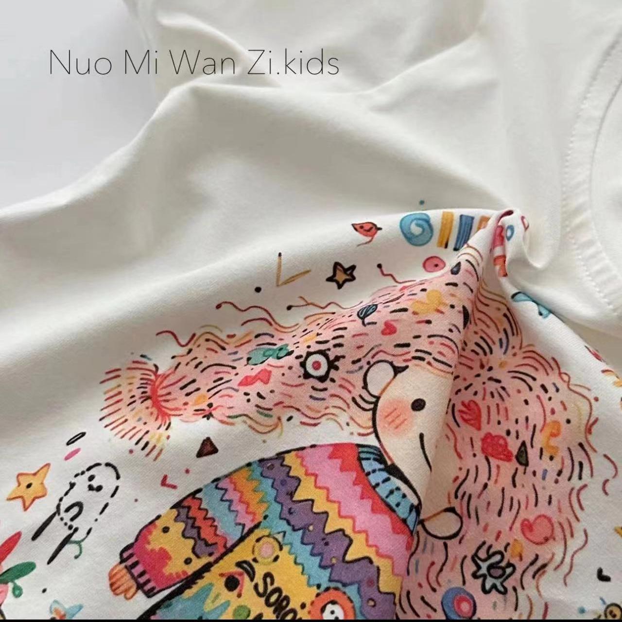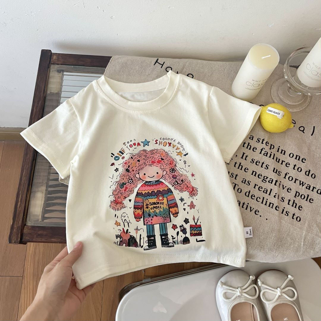 100 면 어린이 착용 2024 여름 새로운 소녀 아기 짧은 소매 티셔츠 만화 인쇄 캐주얼 기본 탑