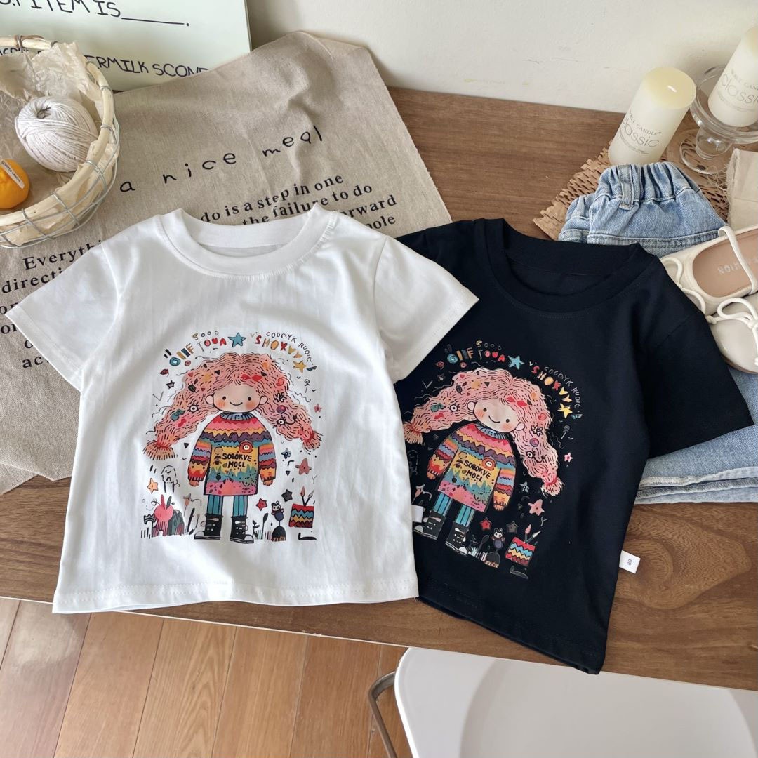 100 면 어린이 착용 2024 여름 새로운 소녀 아기 짧은 소매 티셔츠 만화 인쇄 캐주얼 기본 탑스토어 가기