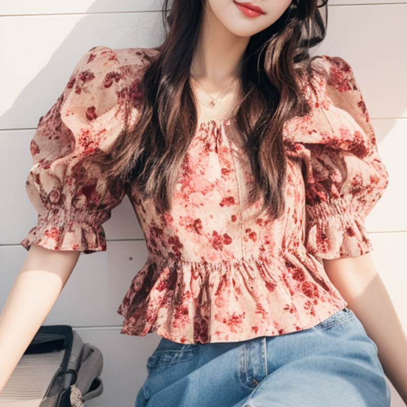 프랑스 스타일 드라이 로즈 플로랄 버블 슬리브 셔츠 2024 새로운 스타일 독특한 세련된 탑 달콤한 시대 감소스토어 가기