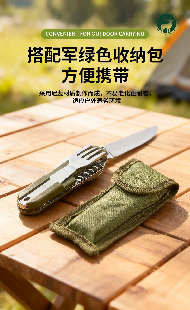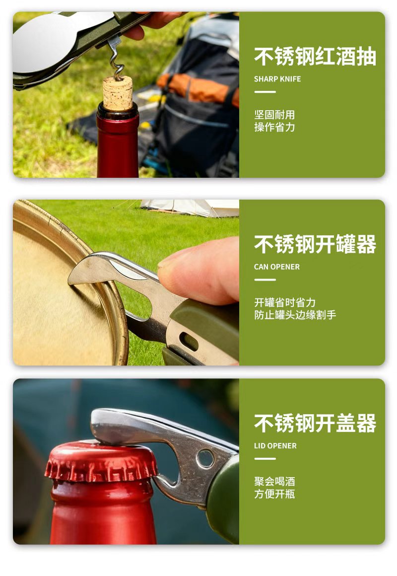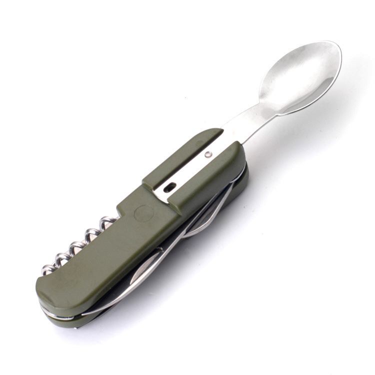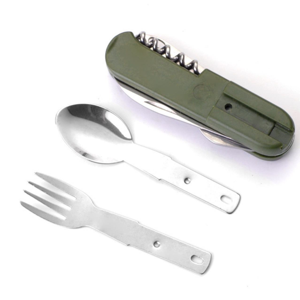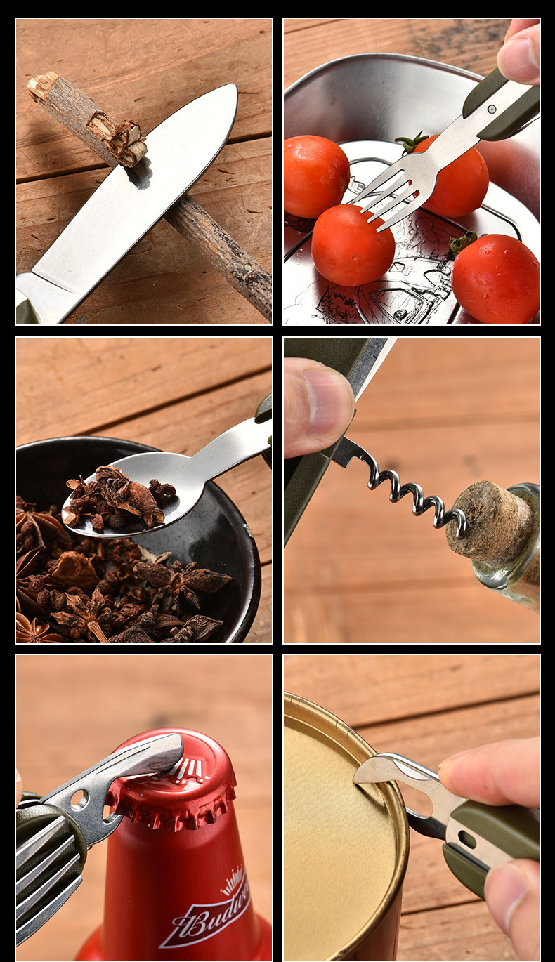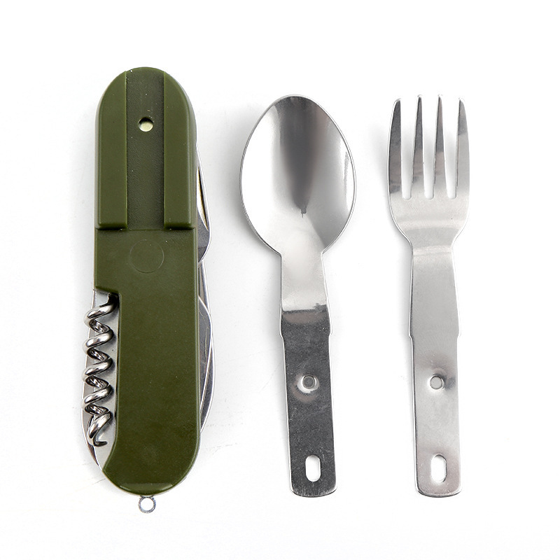 야외 피크닉 휴대용 식기 캠핑 접이식 스테인리스 나이프 포크 스푼 병따개 다기능 야생 생존 장비