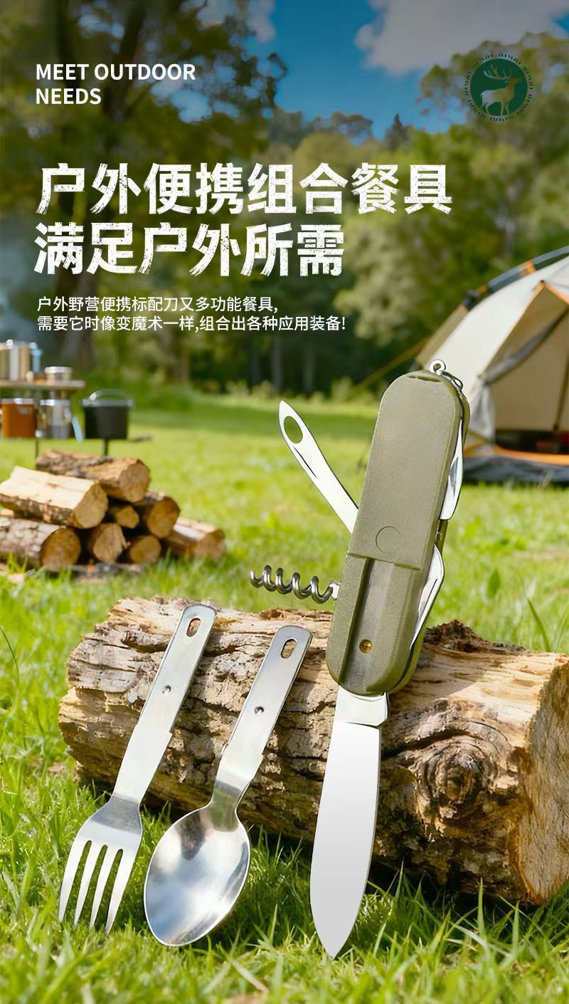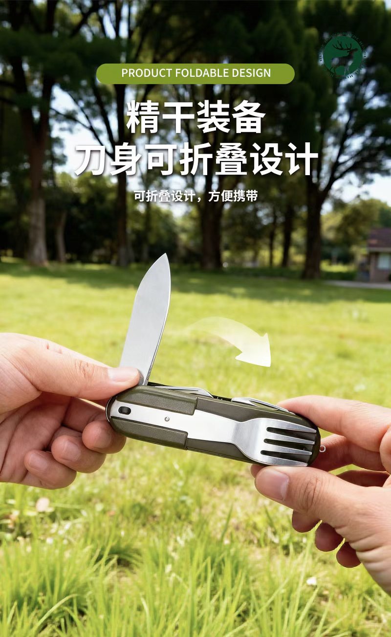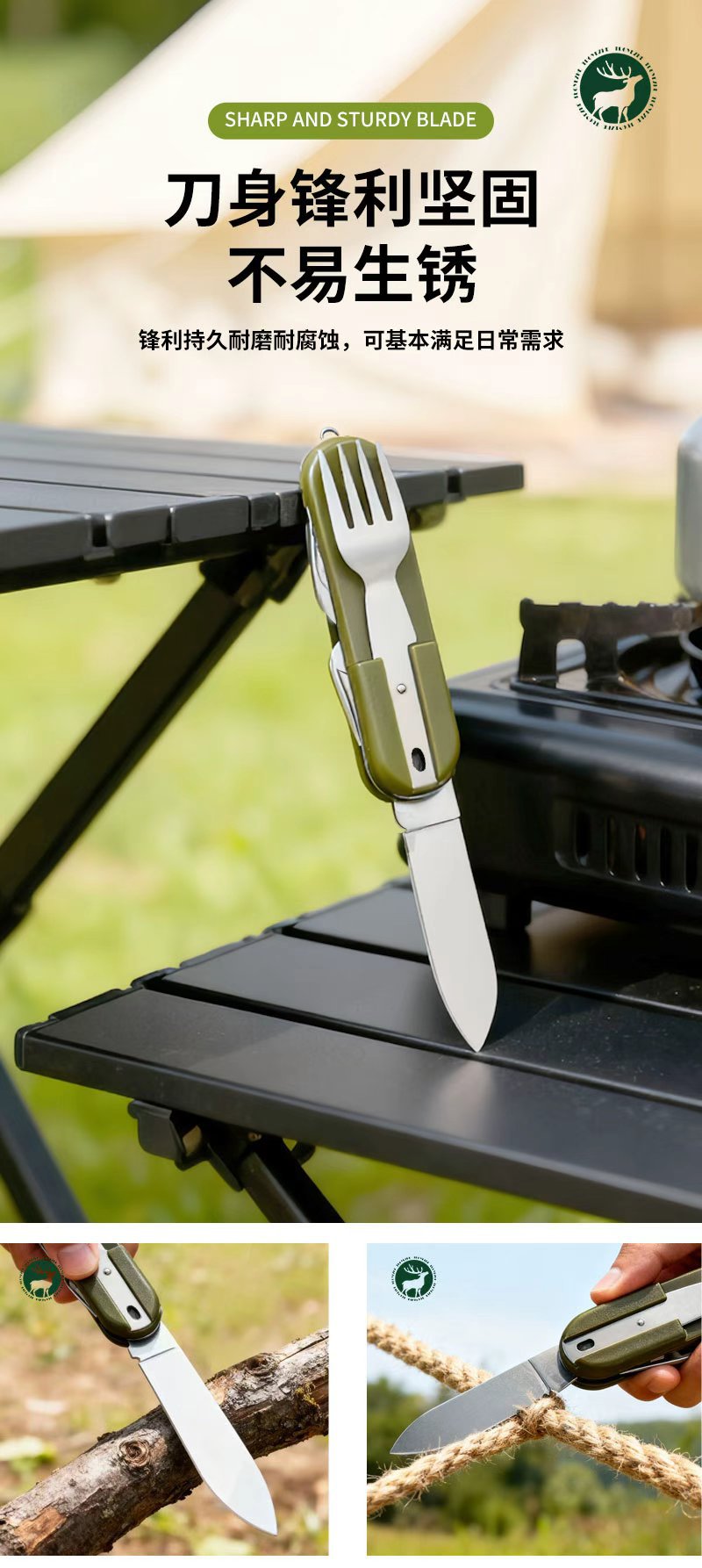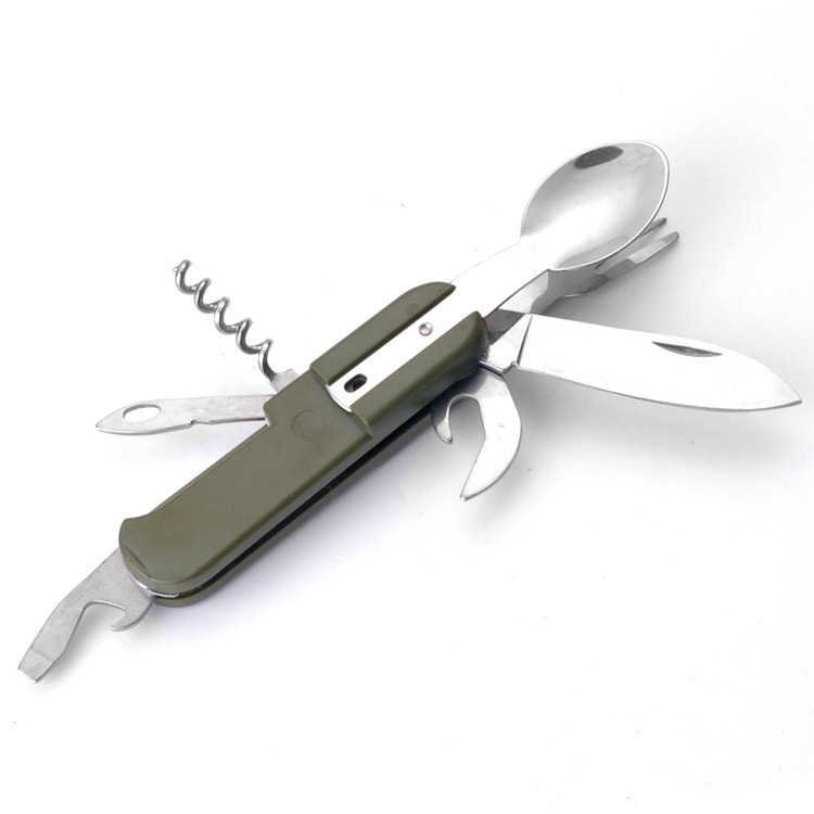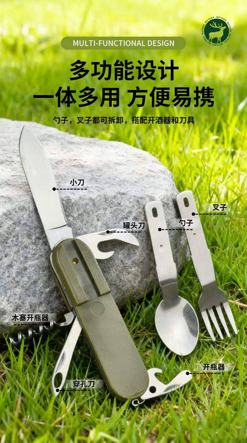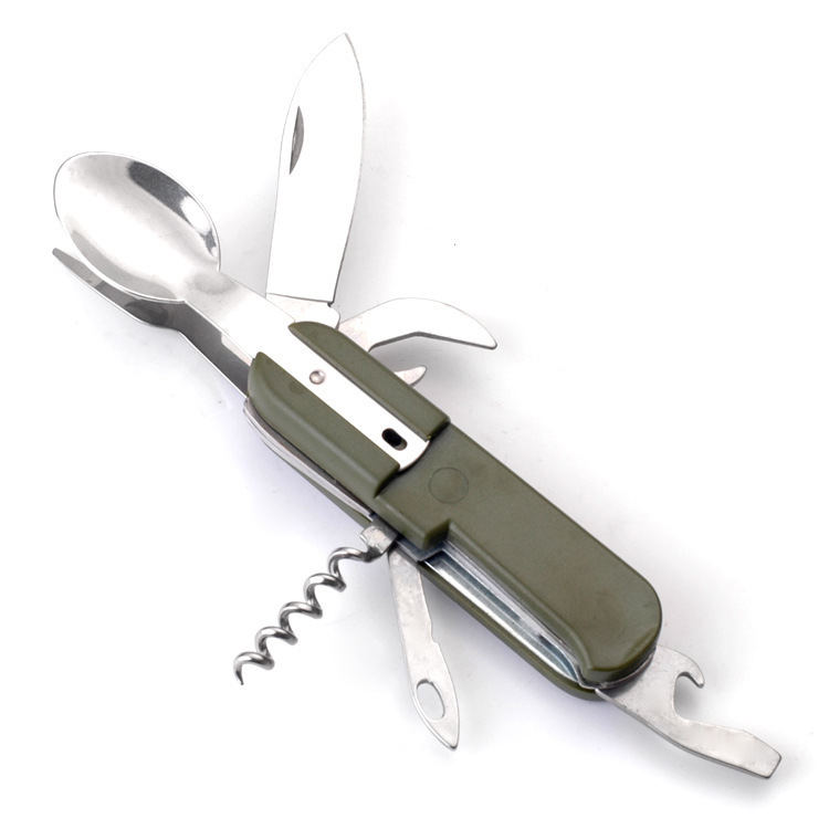 야외 피크닉 휴대용 식기 캠핑 접이식 스테인리스 나이프 포크 스푼 병따개 다기능 야생 생존 장비