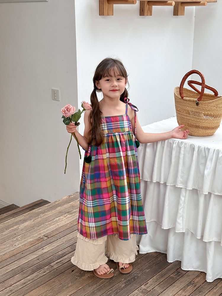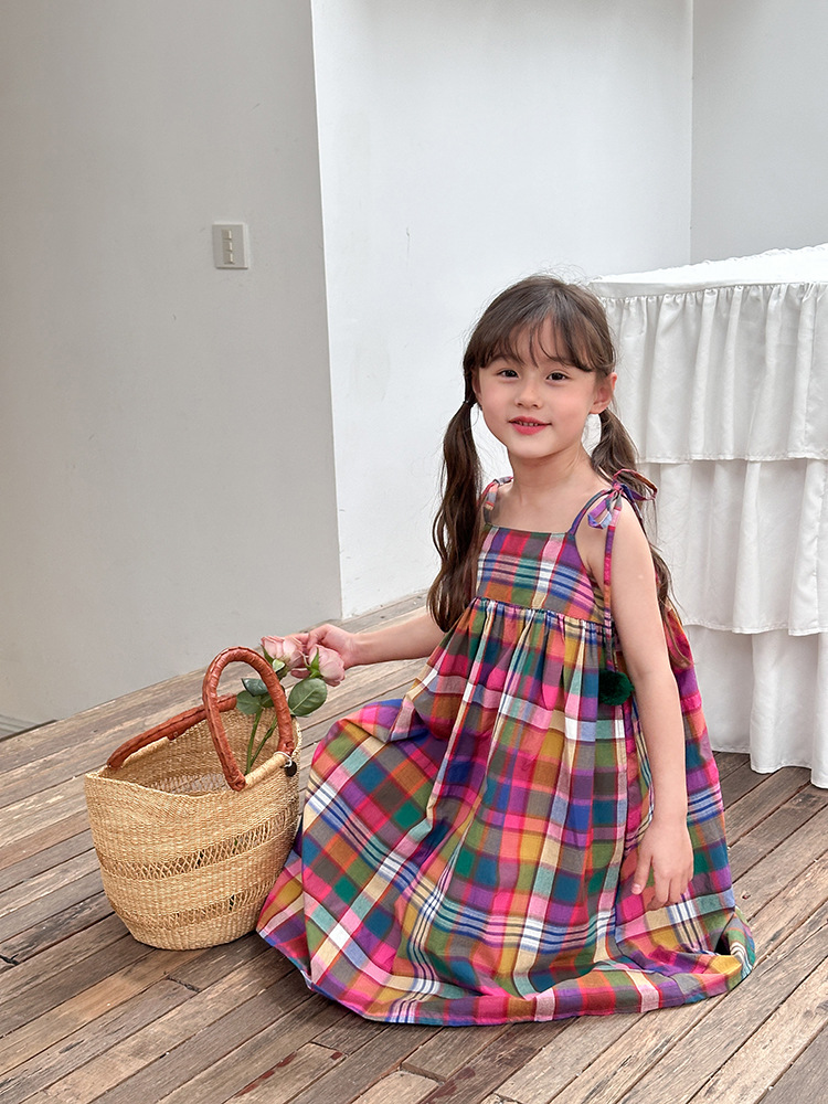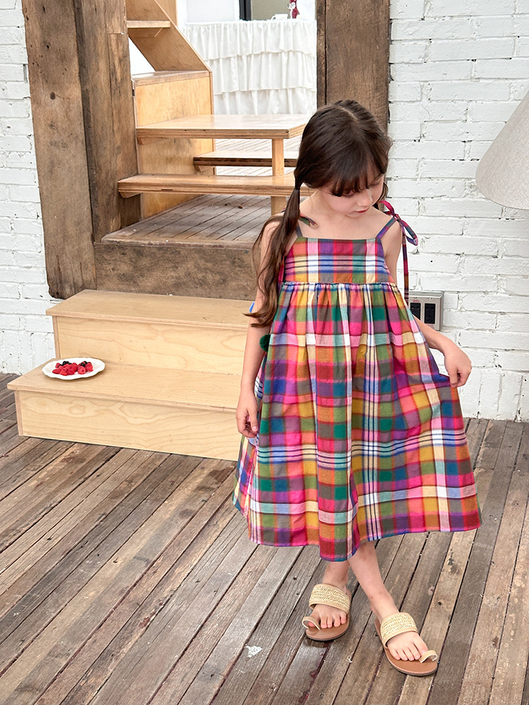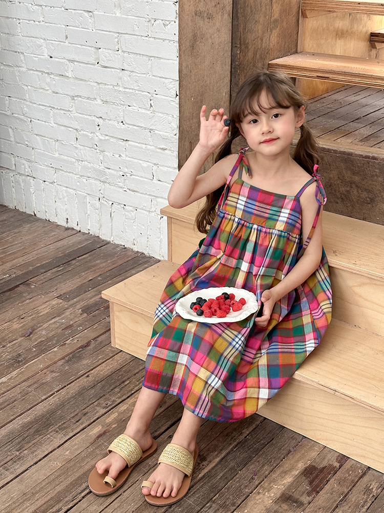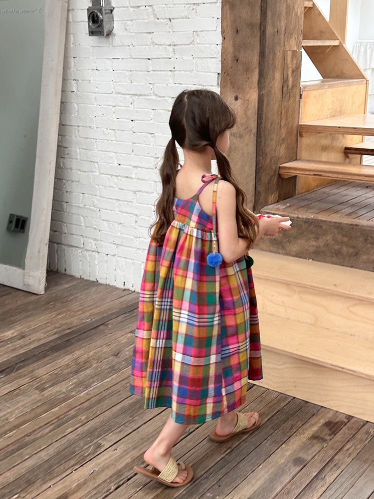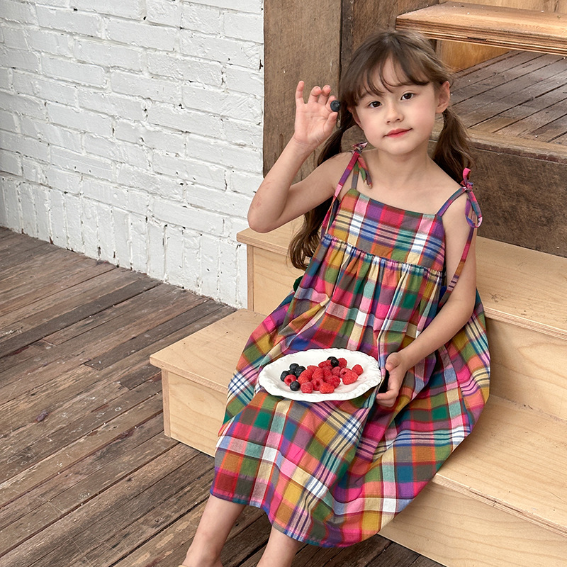 아기의 한국 스타일 어린이 치마 소녀 휴가 스타일 큰 치마 공주 원피스 어린이 긴 격자 무늬 볼 슬립 스커트