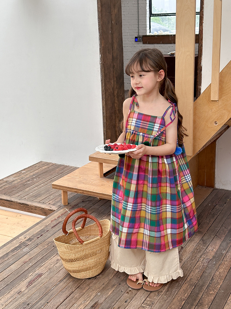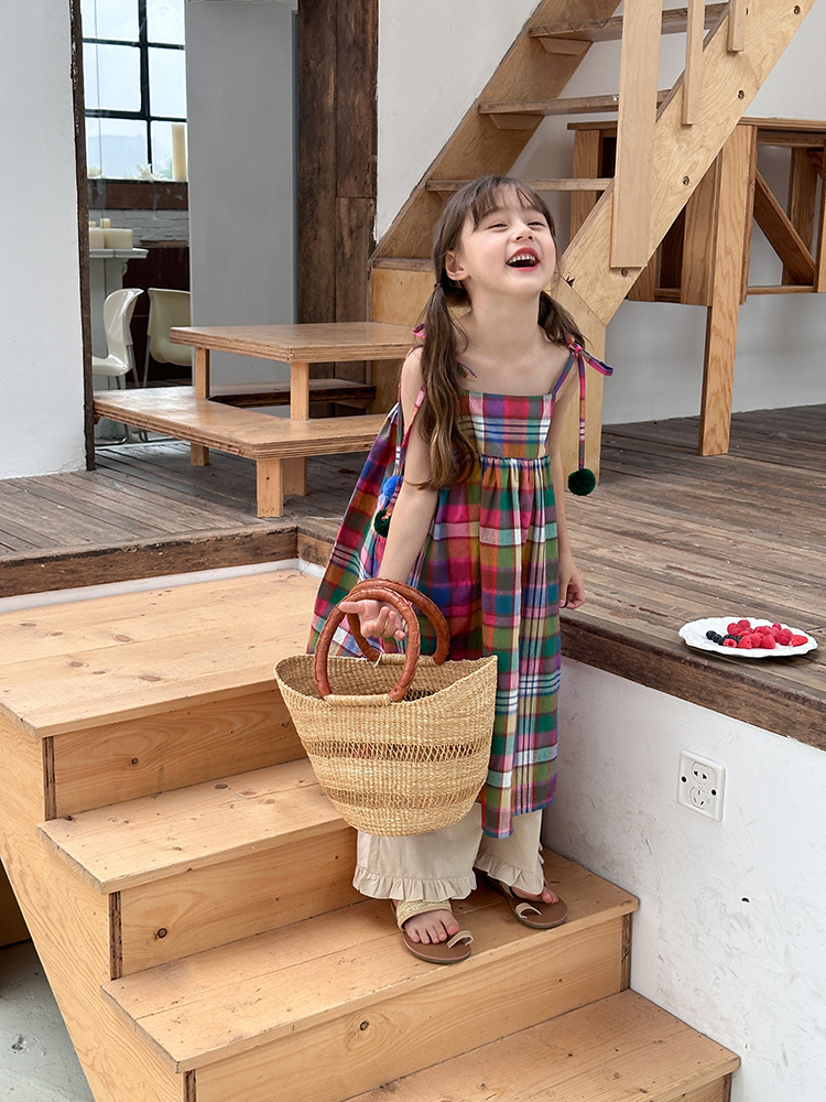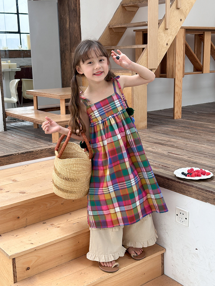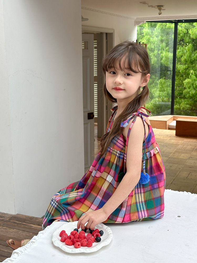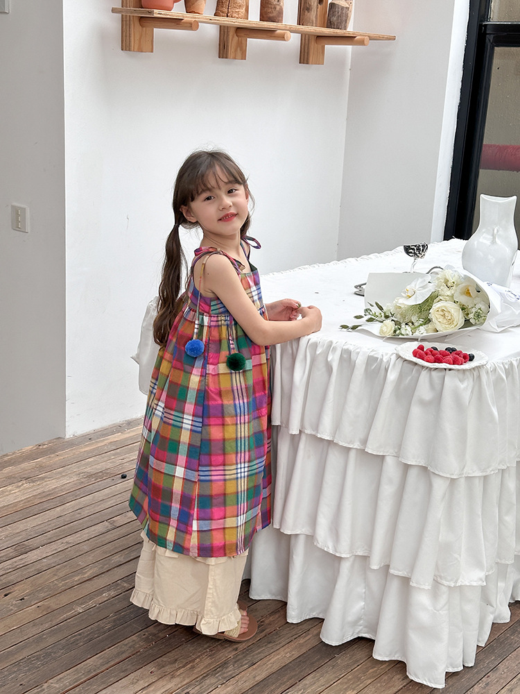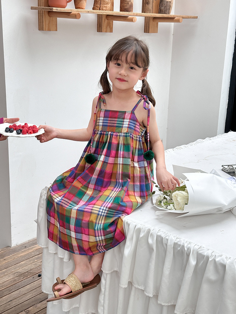 아기의 한국 스타일 어린이 치마 소녀 휴가 스타일 큰 치마 공주 원피스 어린이 긴 격자 무늬 볼 슬립 스커트