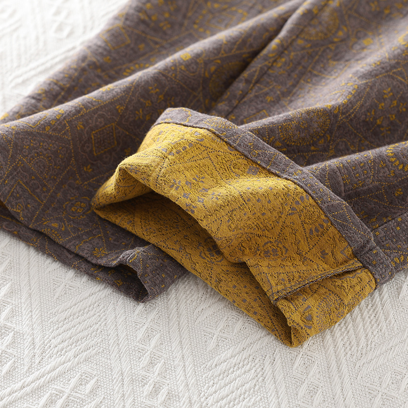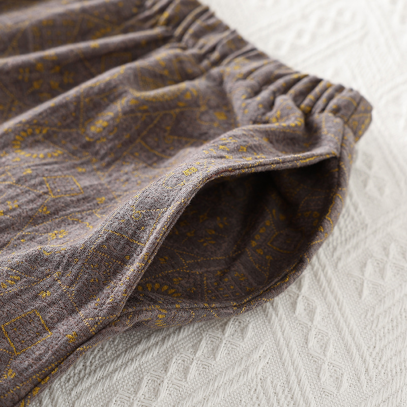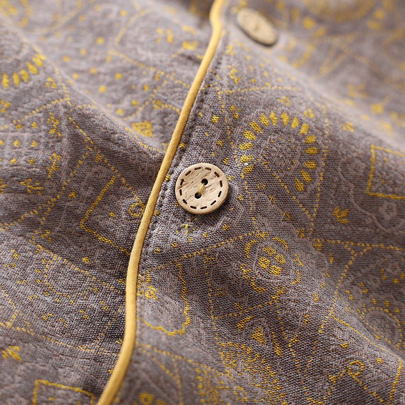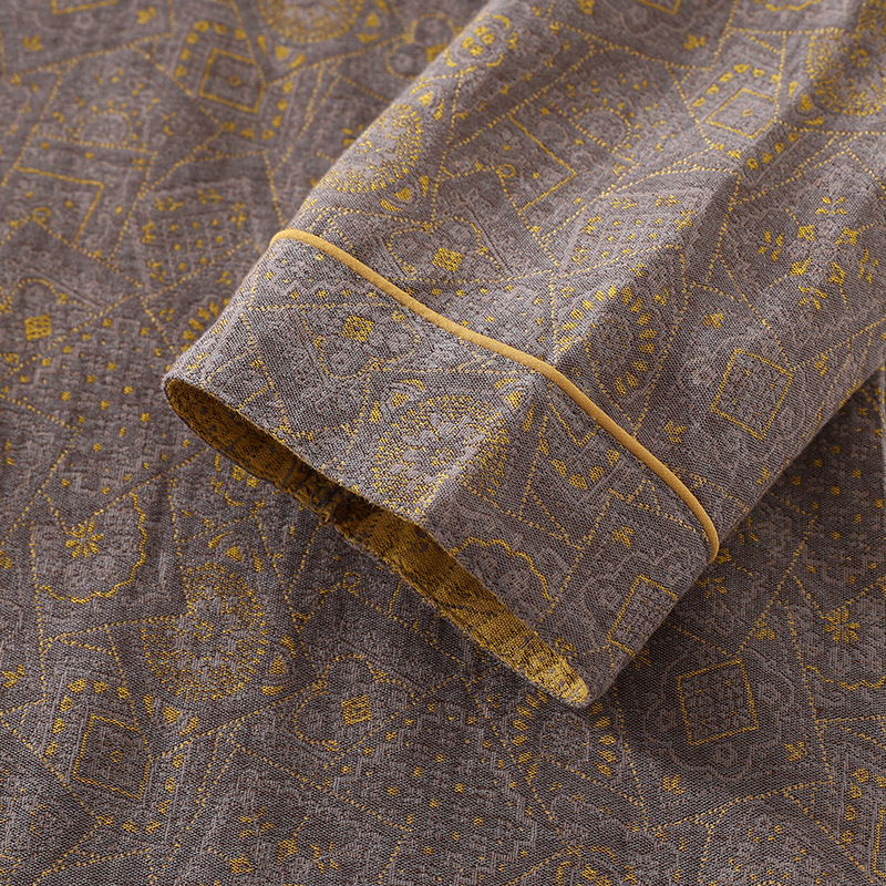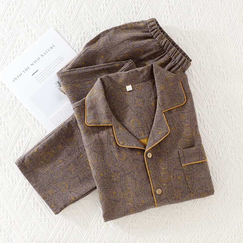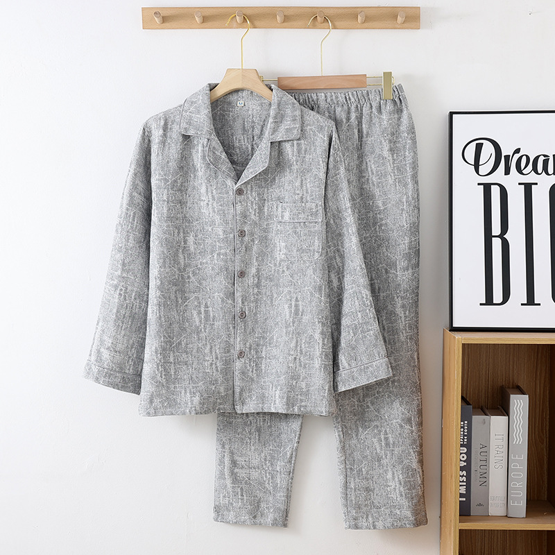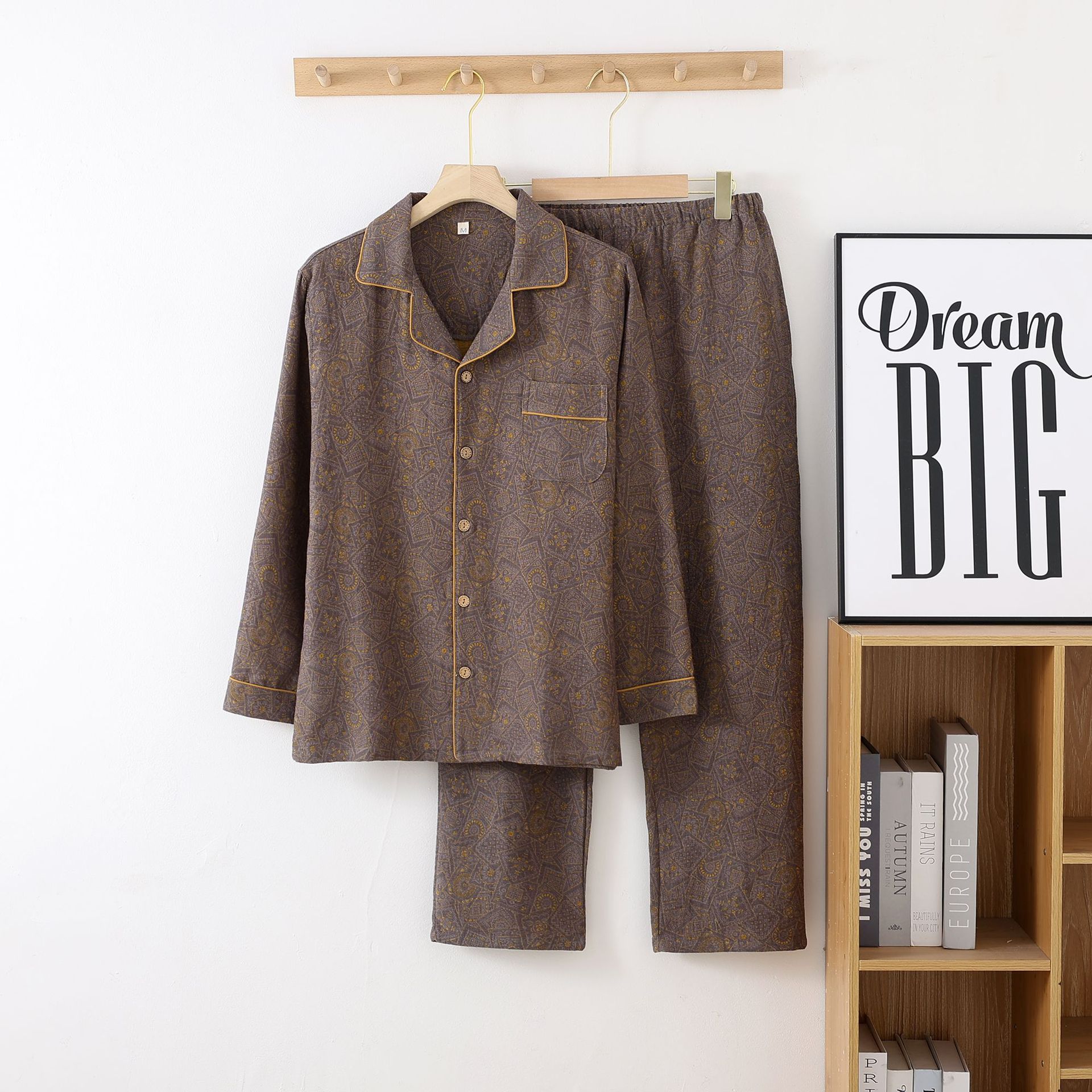 새로운 원사 염색 코튼 더블 레이어 거즈 남성 잠옷 봄과 가을 얇은 긴팔 느슨한 겉옷 홈 의류 도매스토어 가기