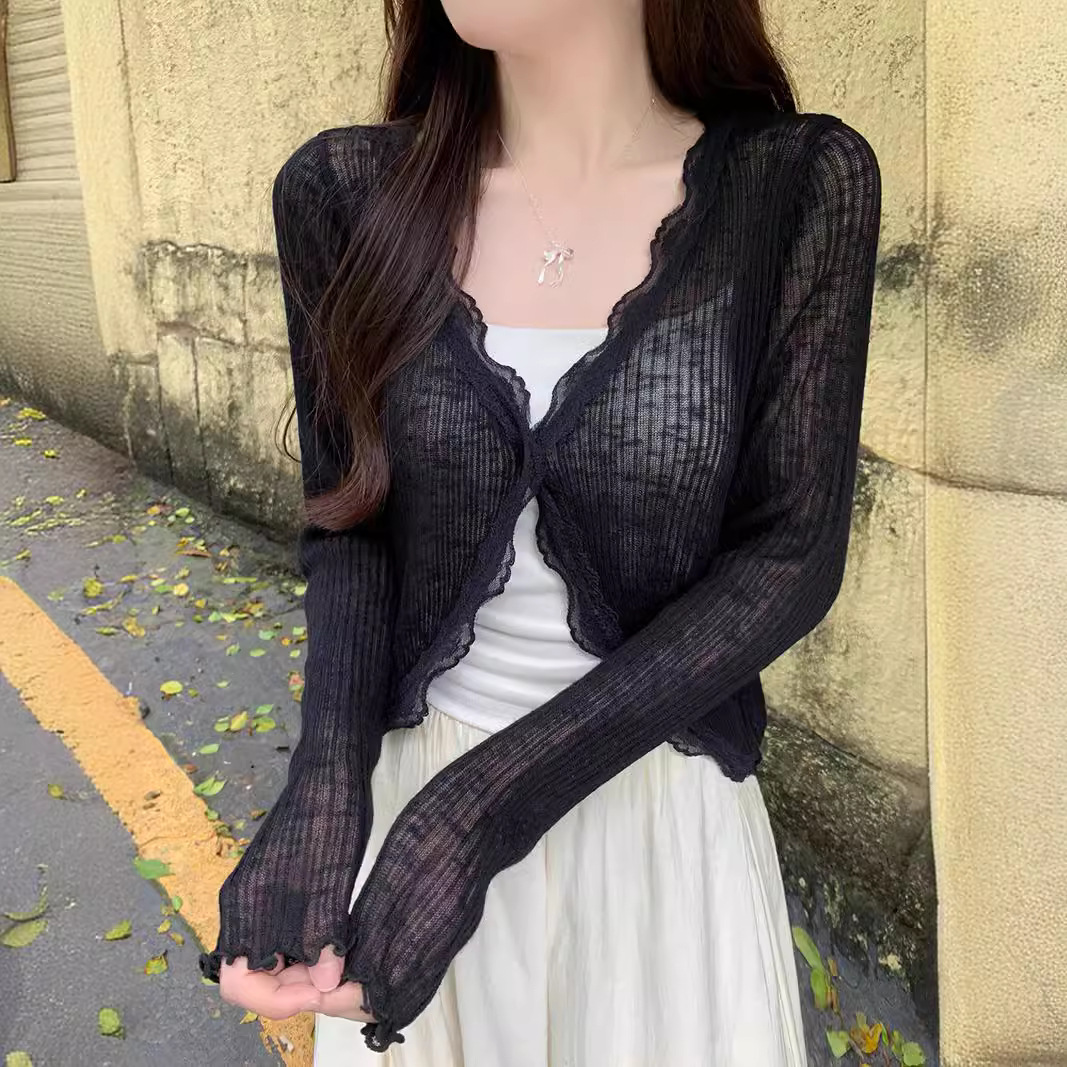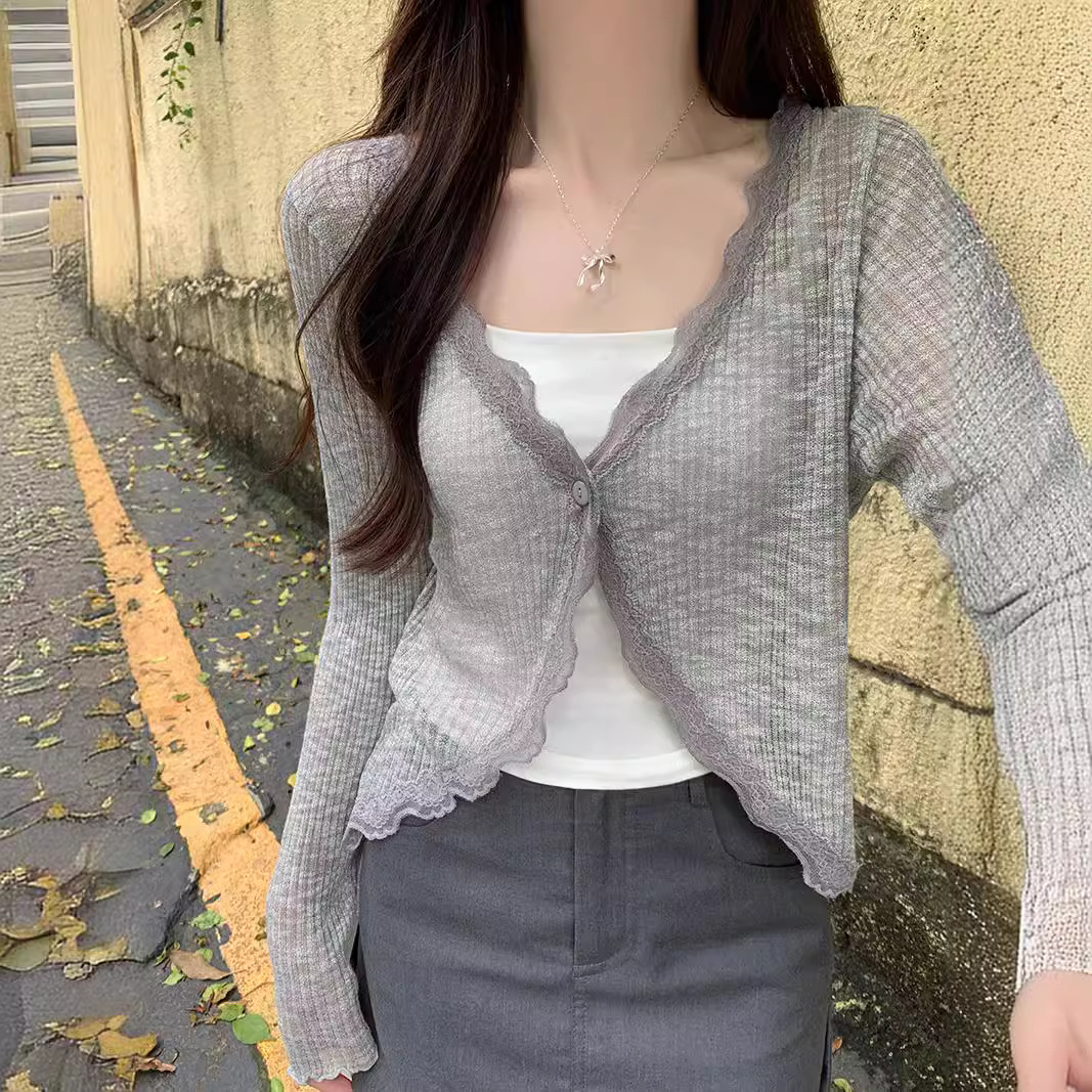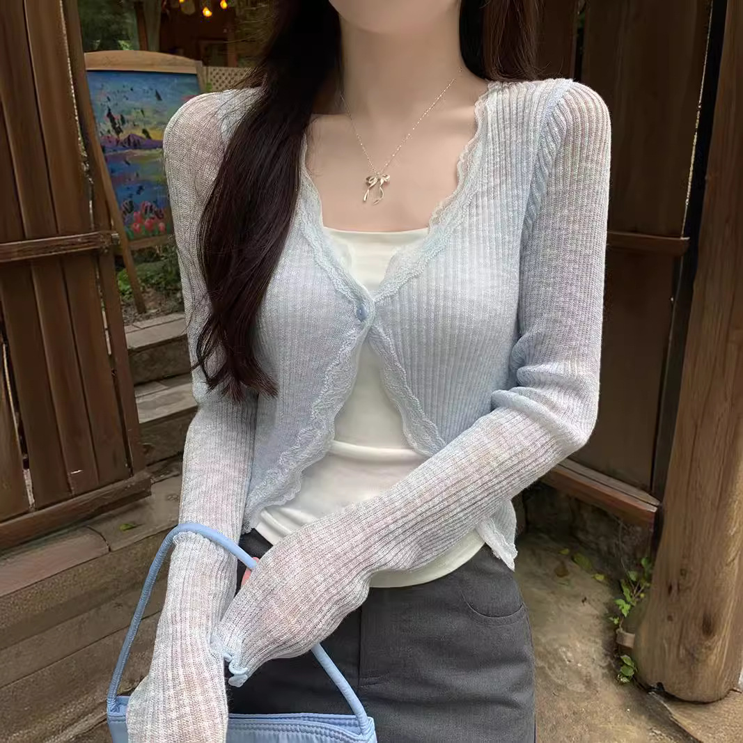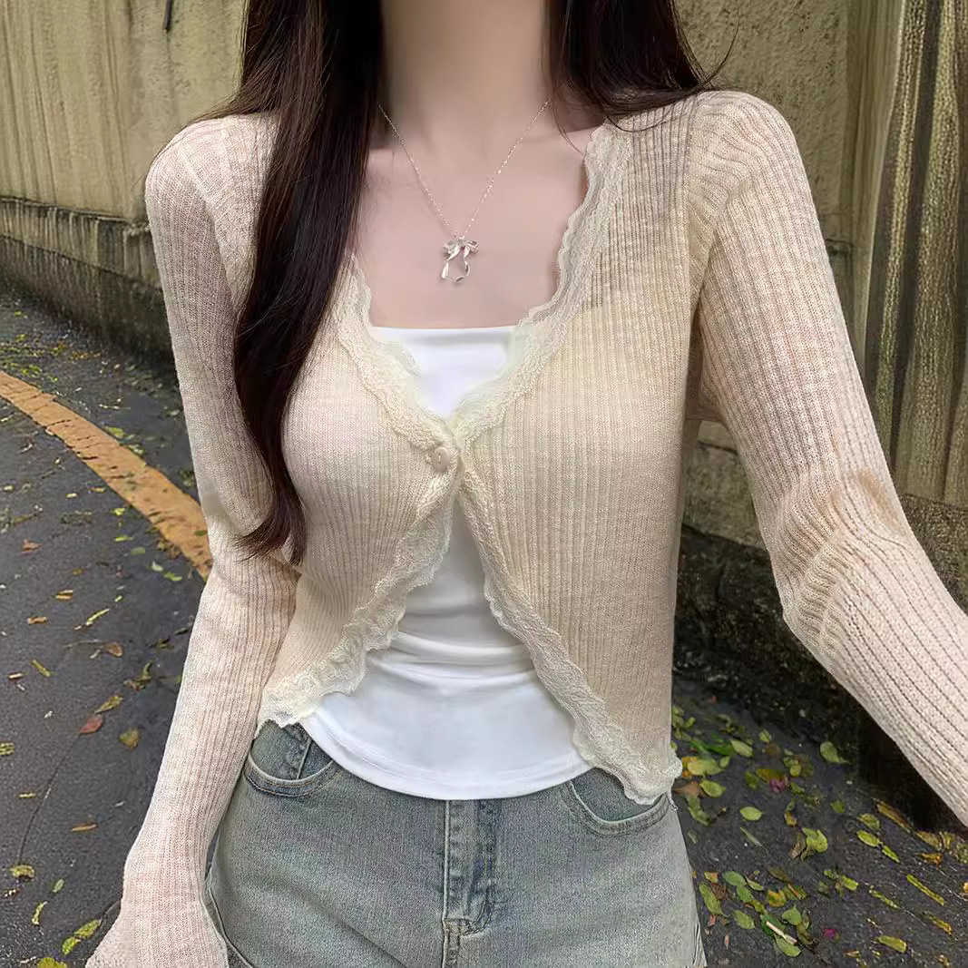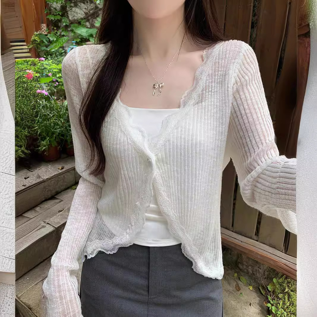 레이스 V 넥 선스크린 니트 카디건 여성 여름 한국 스타일 세련된 얇은 외부 탑 에어컨 셔츠 재킷