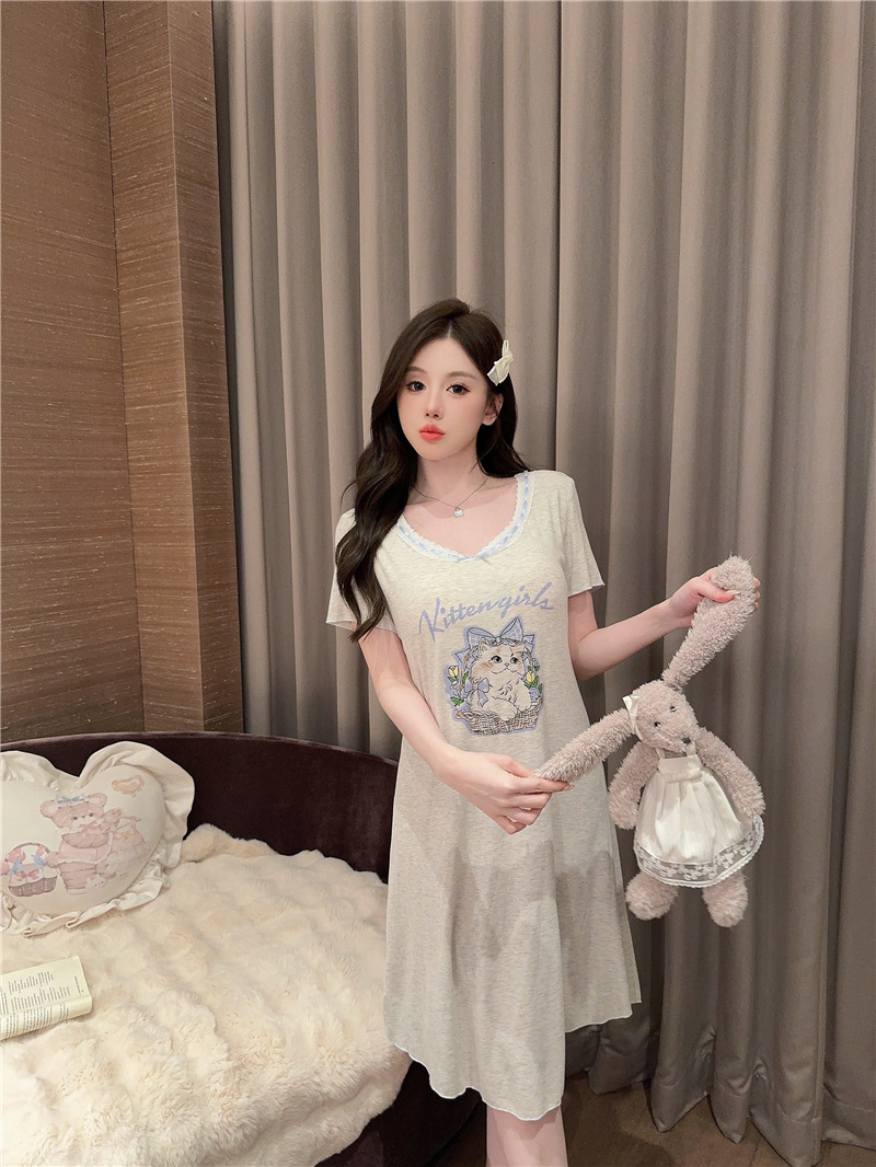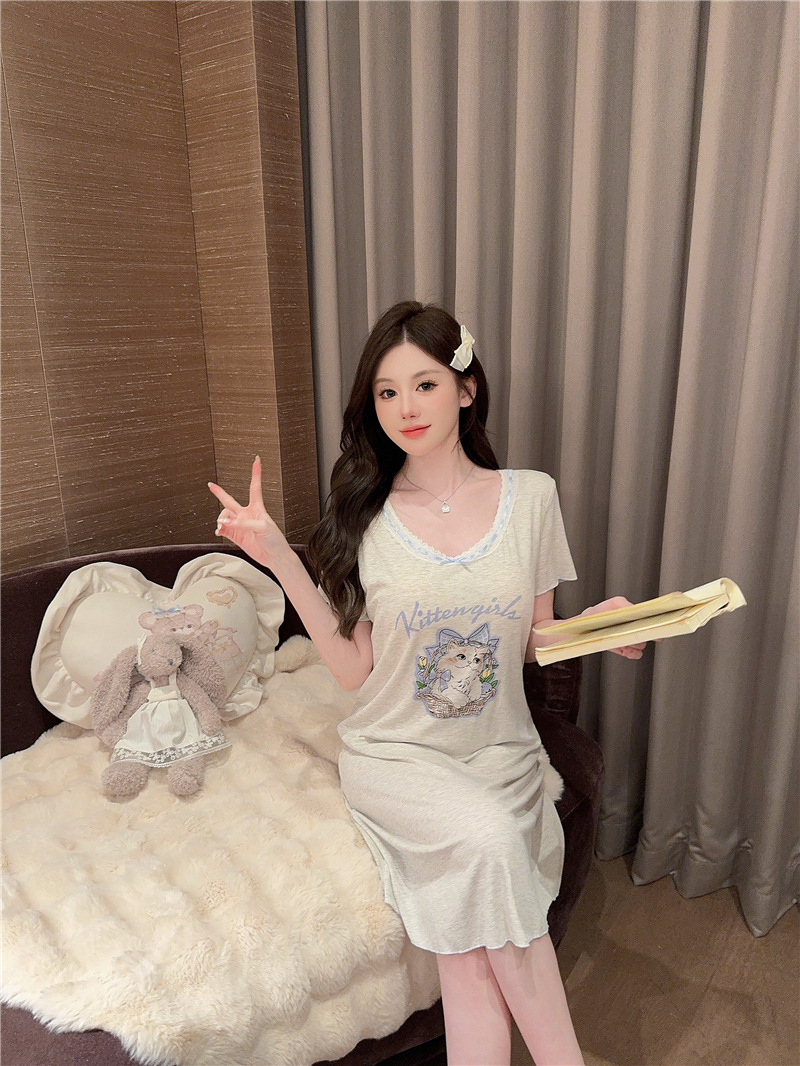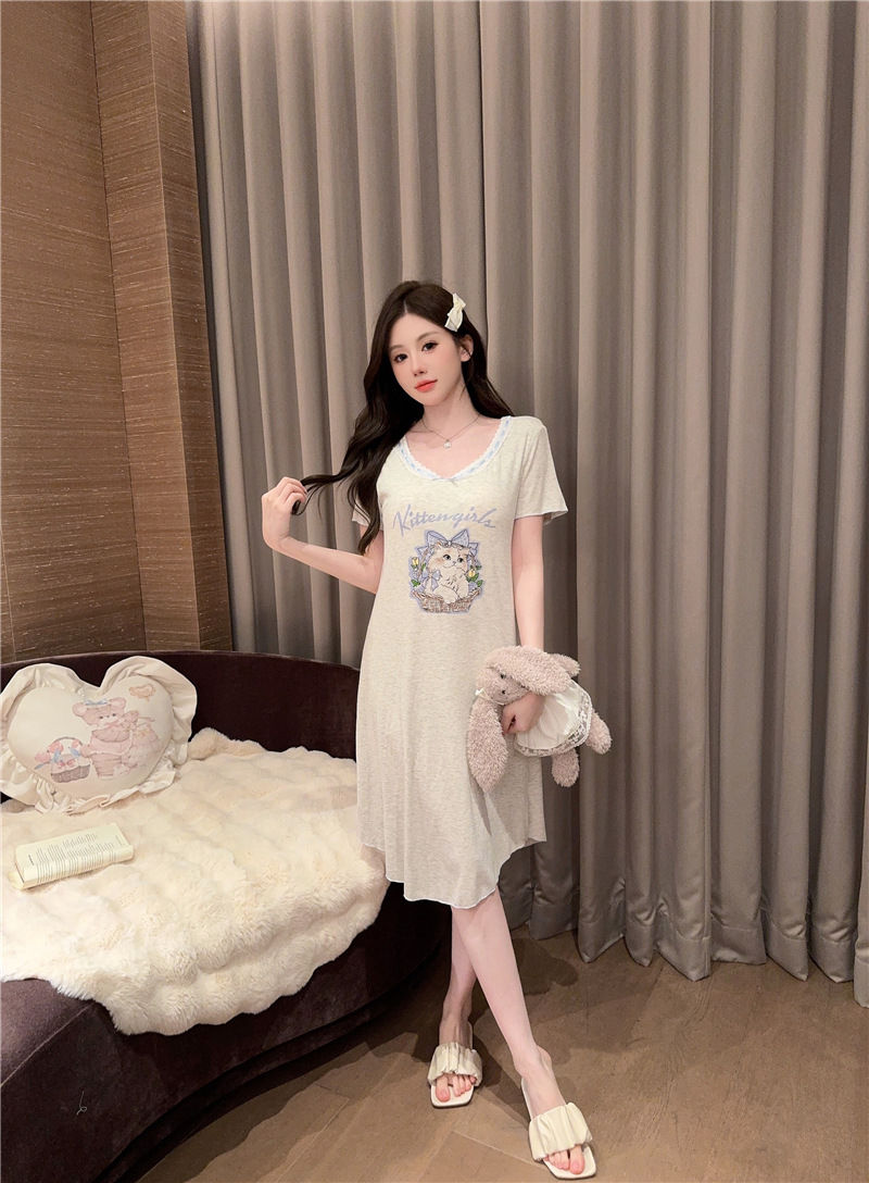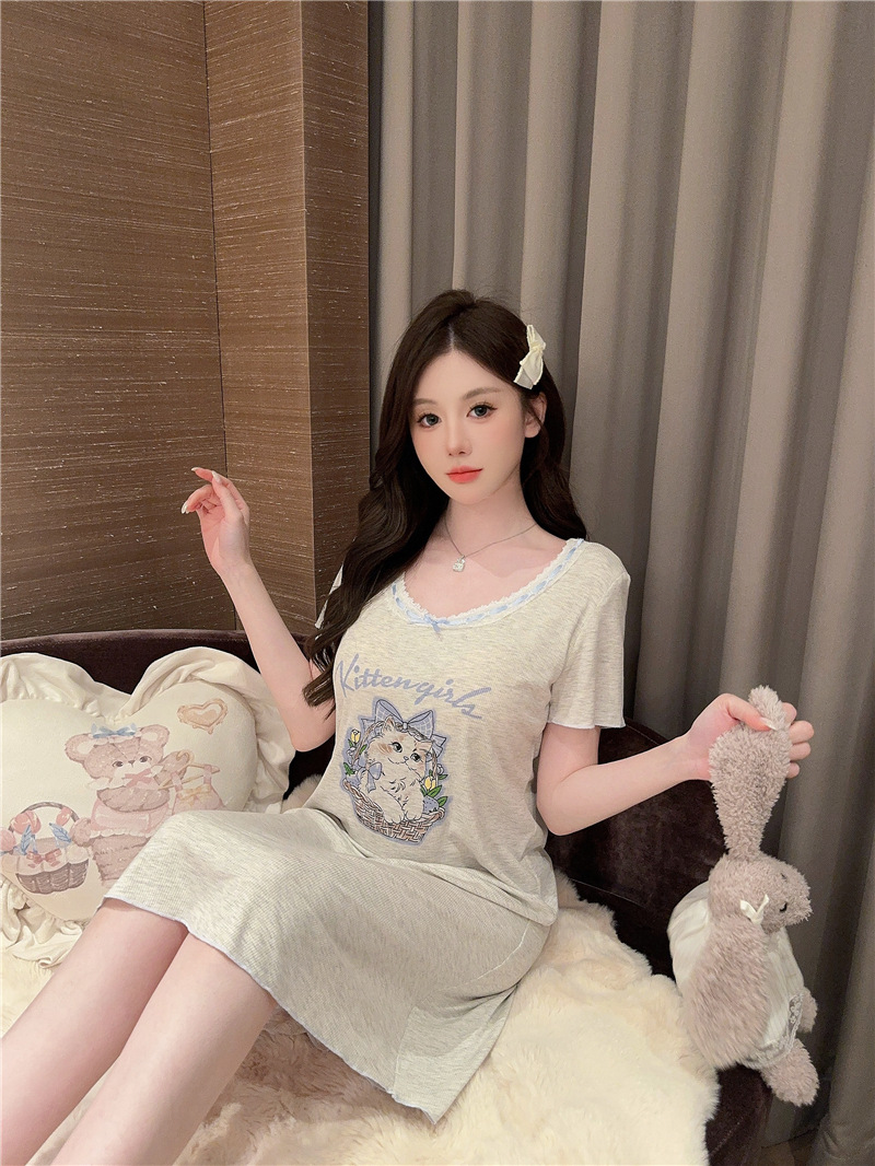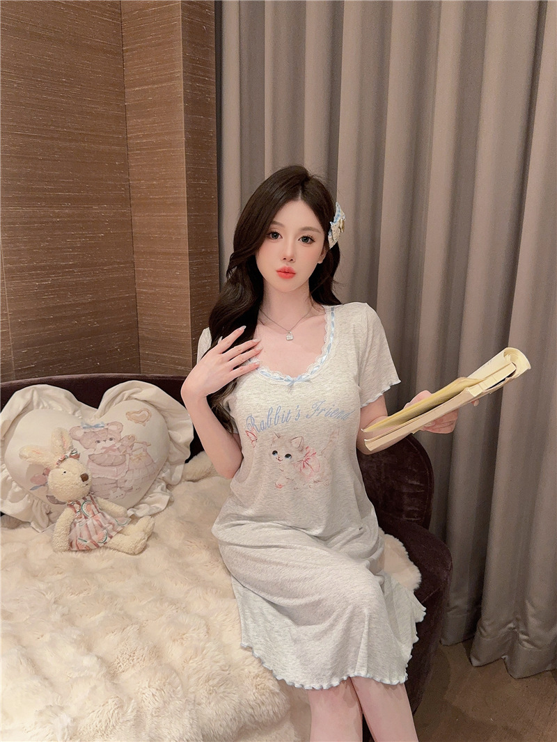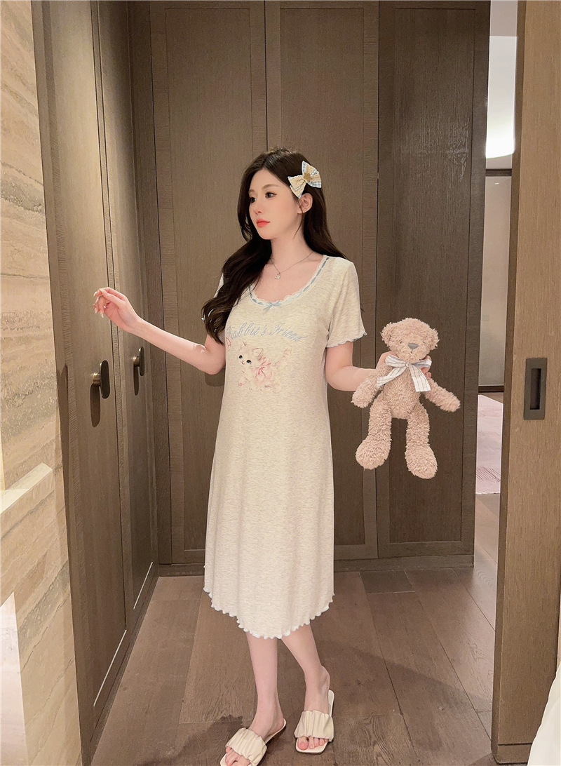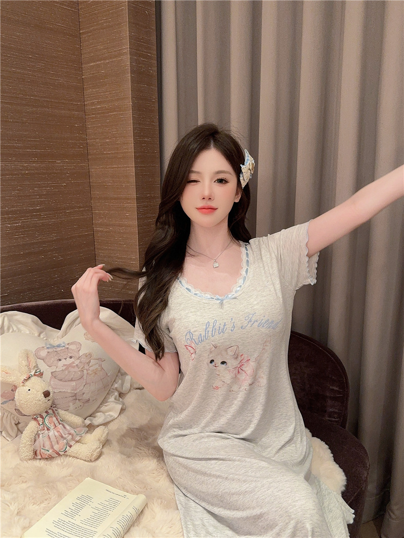 나이트 가운 여성의 여름 모달 면화 토끼 고양이 스프레이 페인트 유방 면화 홈 옷을 입은 느슨한 반팔 잠옷