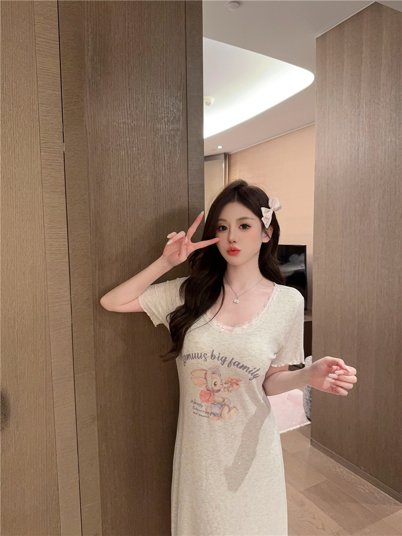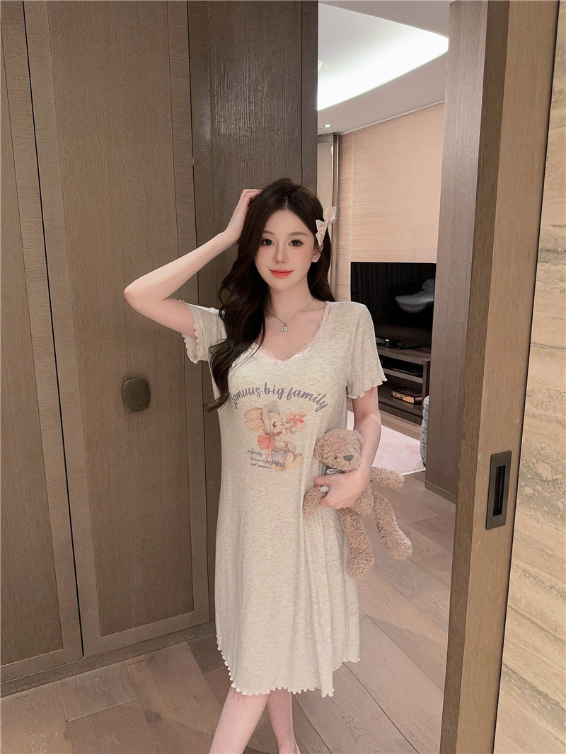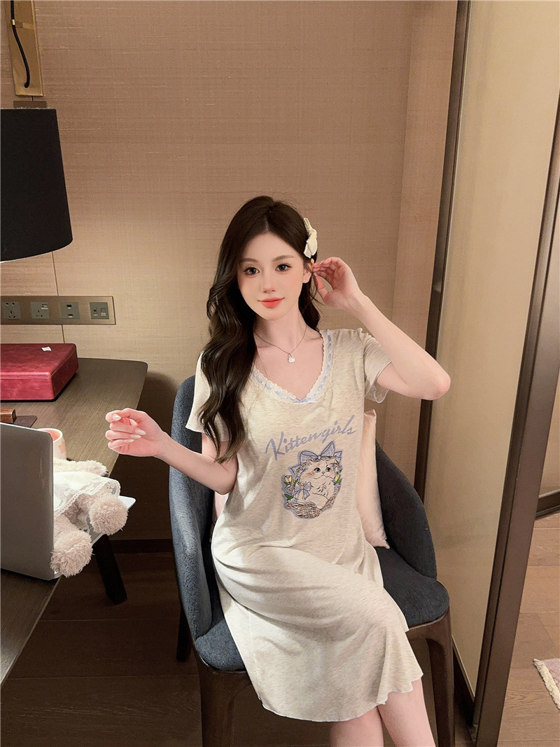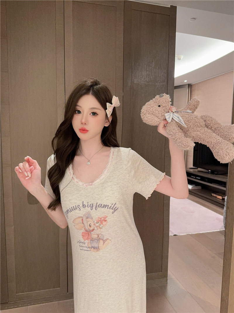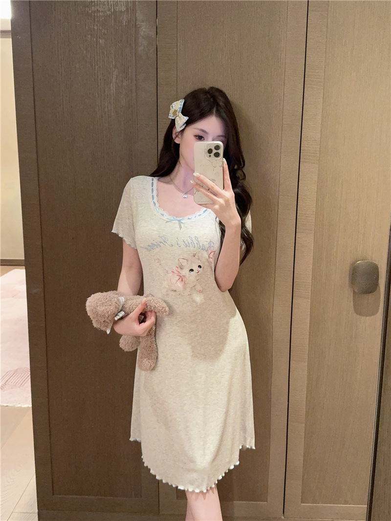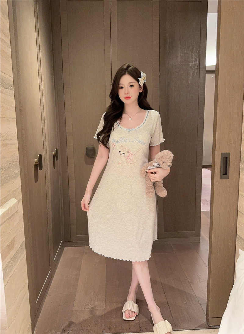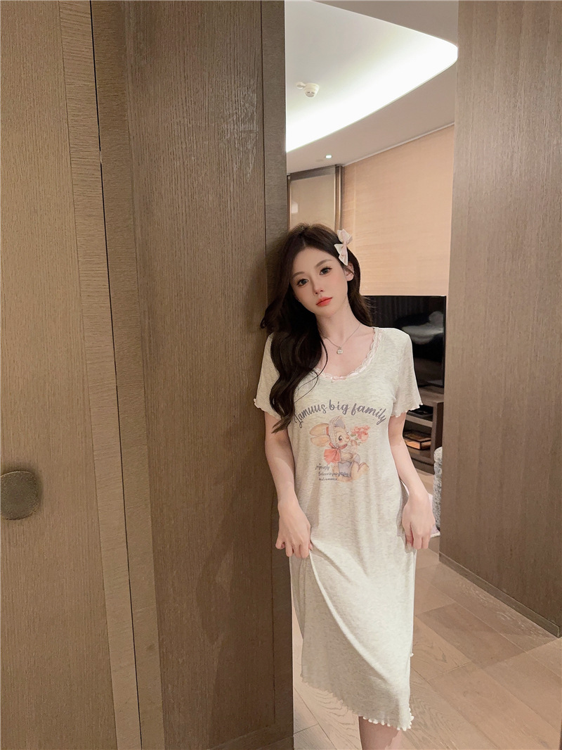 나이트 가운 여성의 여름 모달 면화 토끼 고양이 스프레이 페인트 유방 면화 홈 옷을 입은 느슨한 반팔 잠옷