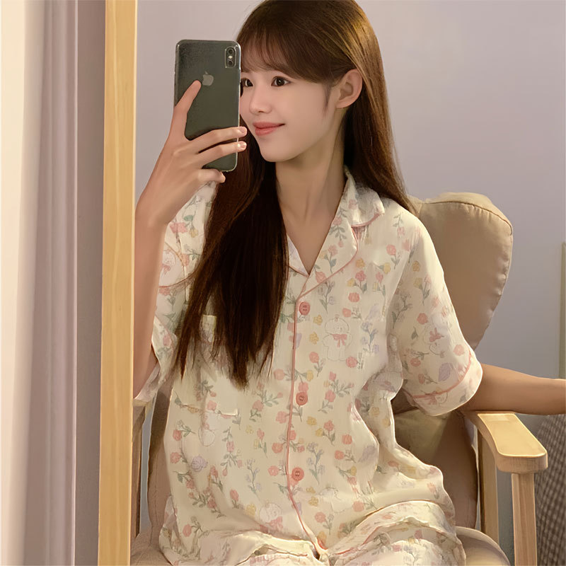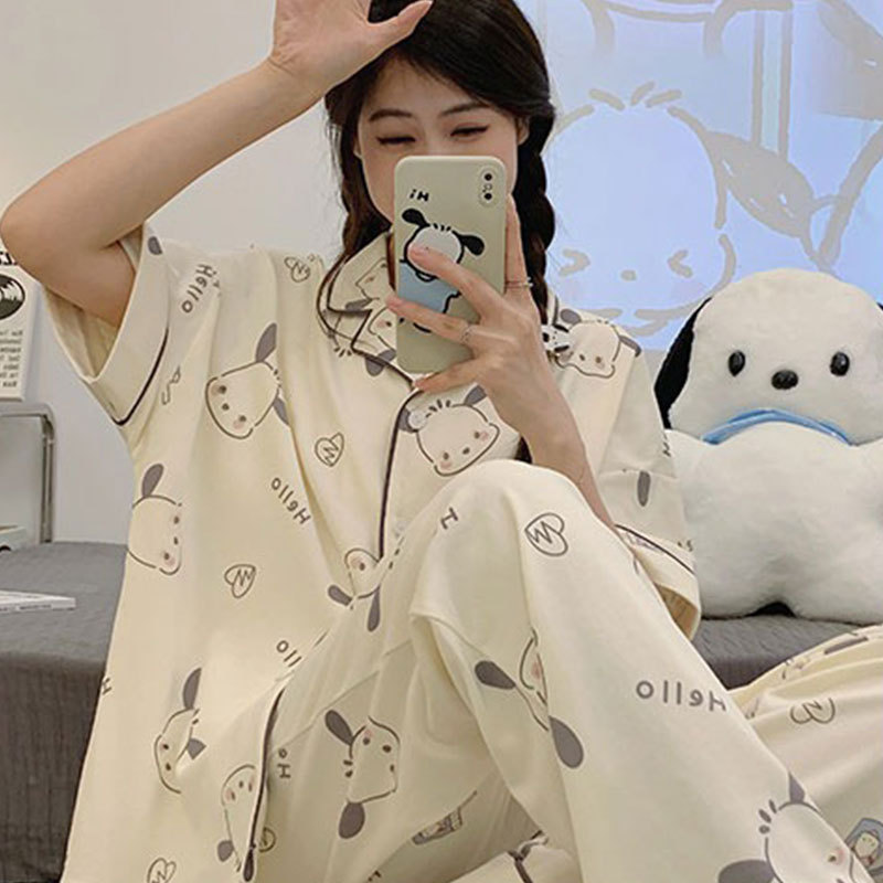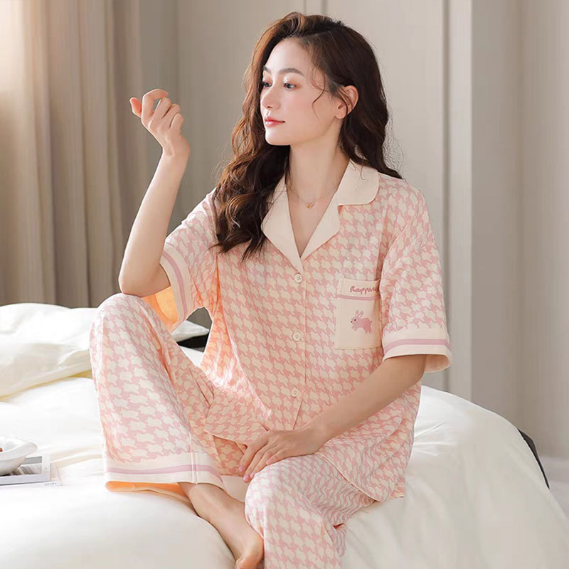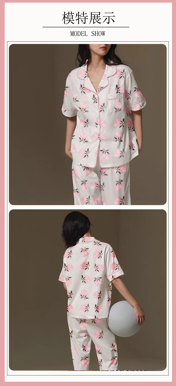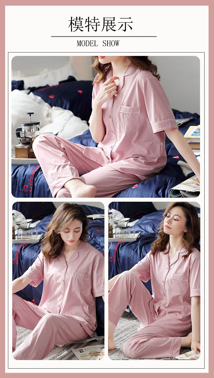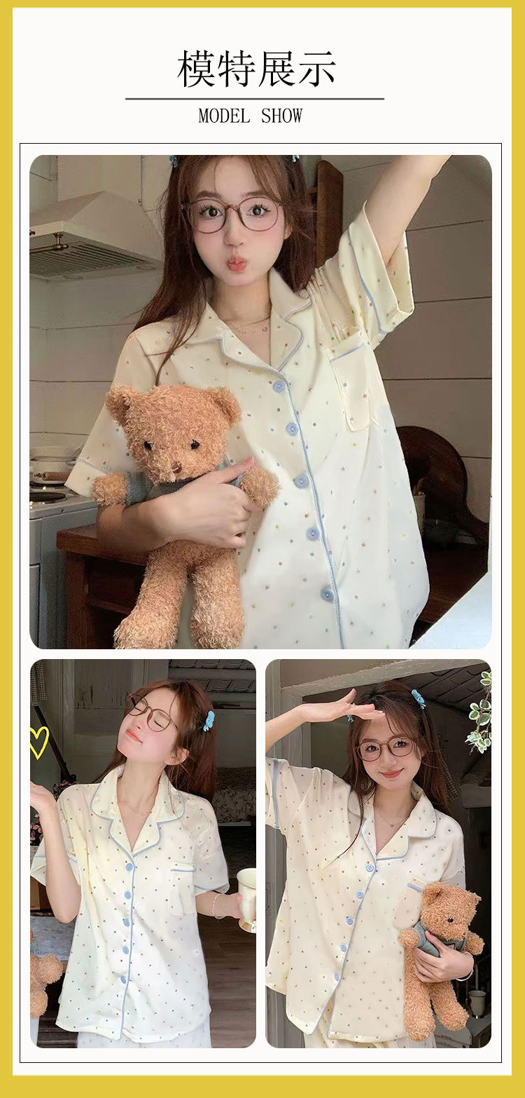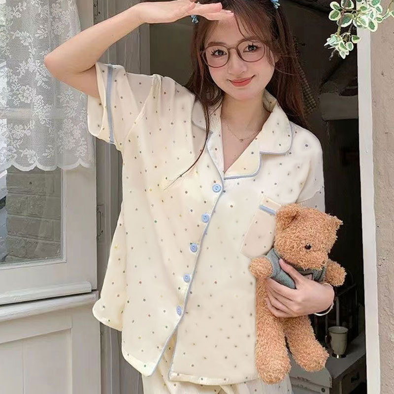 새로운 여성용 수출 잠옷, 달콤하고 귀여운 스타일의 핑크 물방울 무늬 가디건, 면 반팔 긴바지 홈웨어 세트스토어 가기