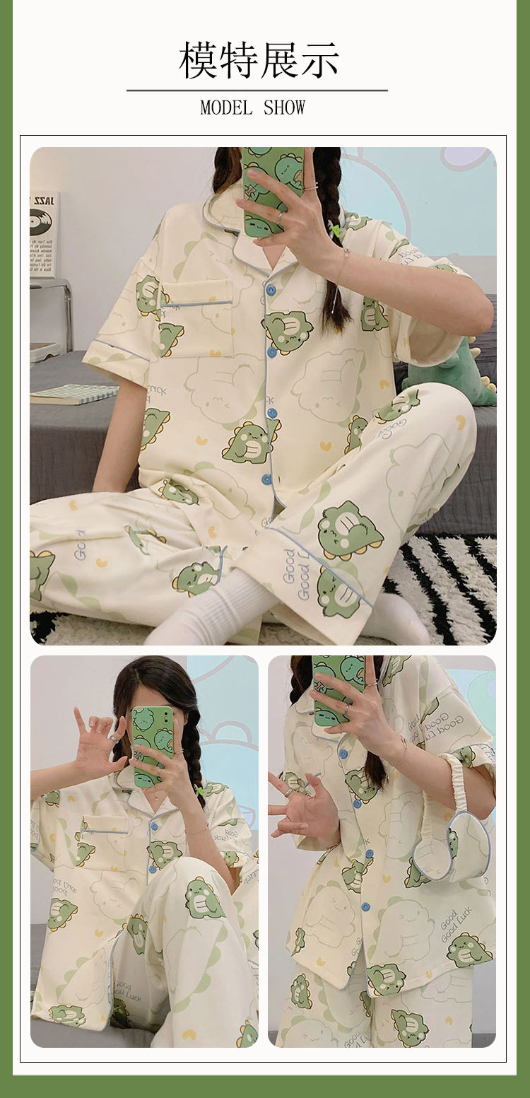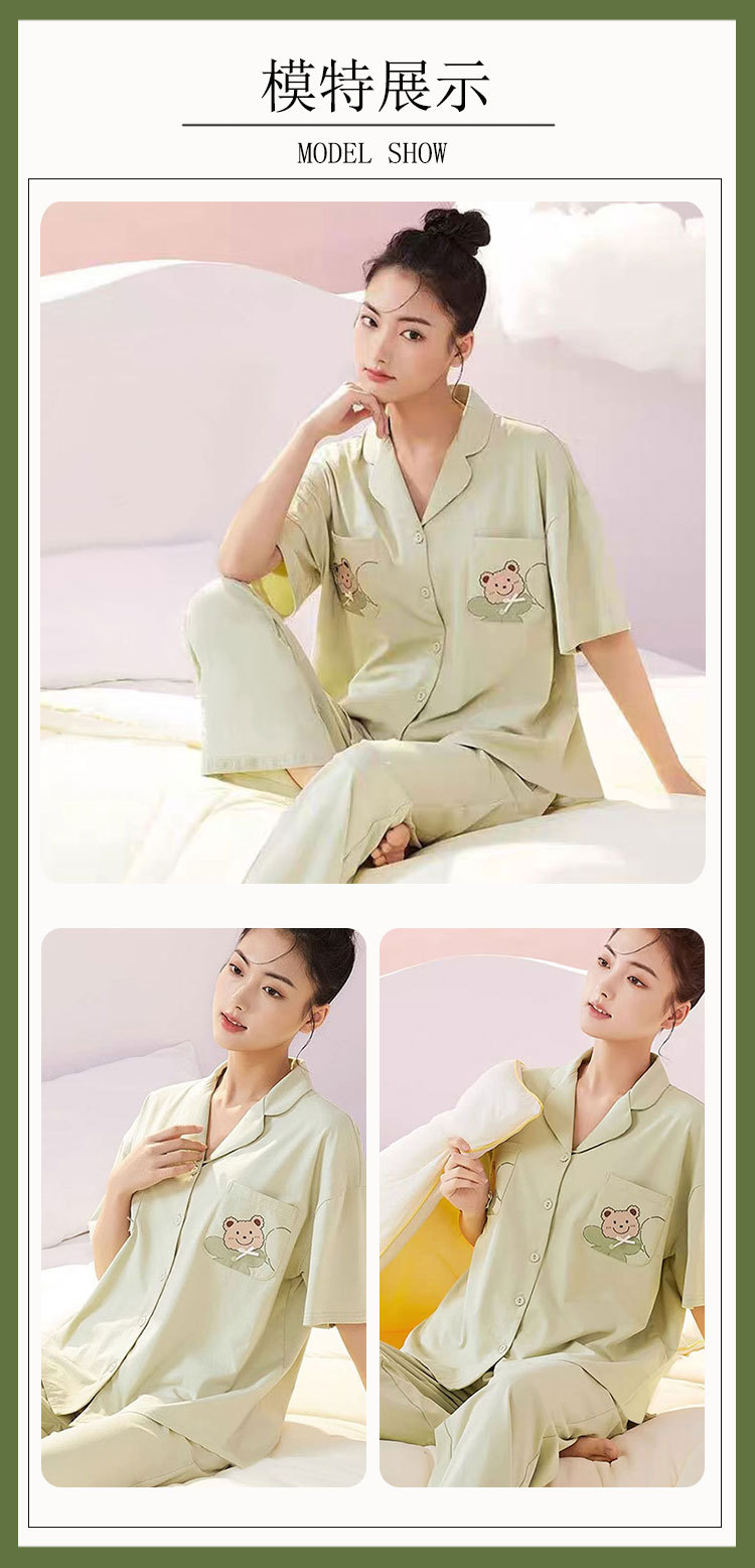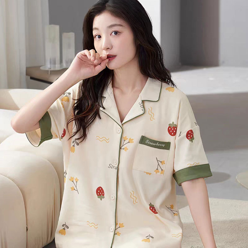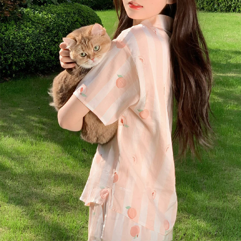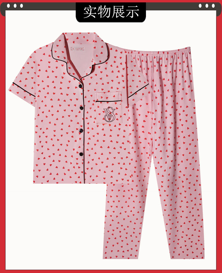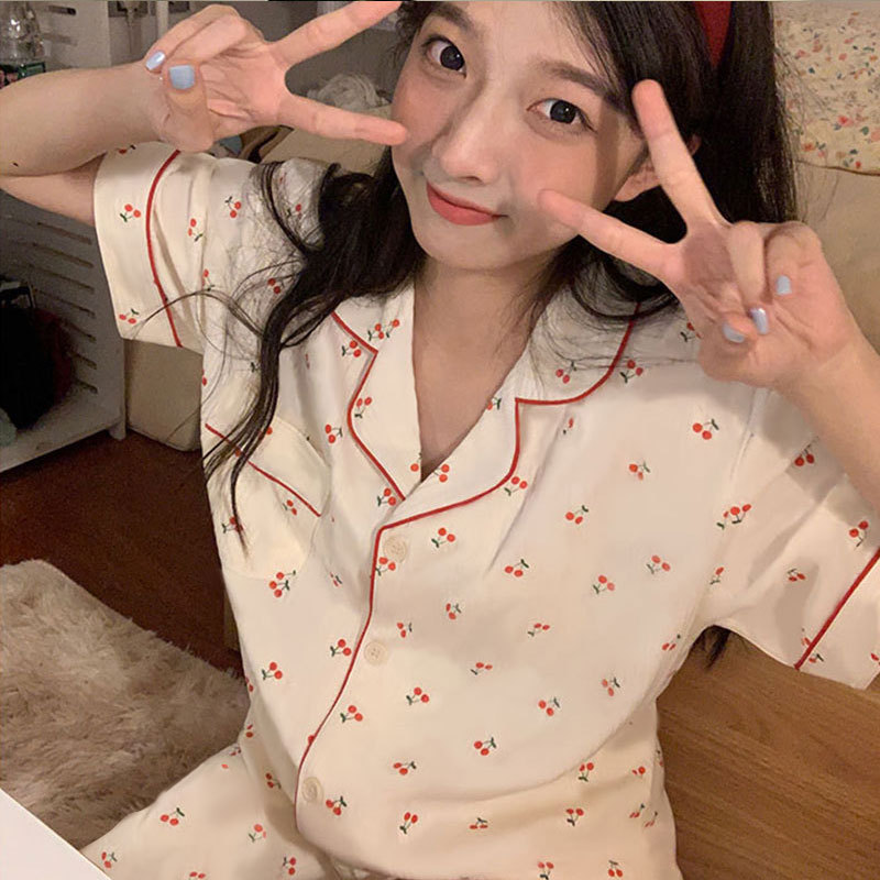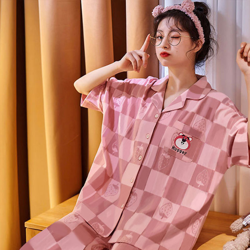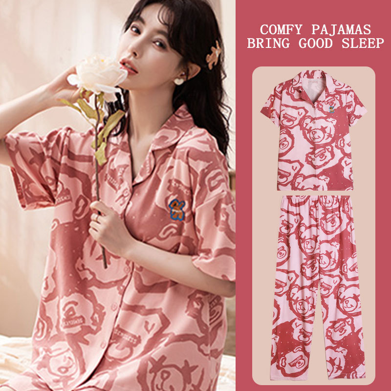 새로운 여성용 수출 잠옷, 달콤하고 귀여운 스타일의 핑크 물방울 무늬 가디건, 면 반팔 긴바지 홈웨어 세트스토어 가기