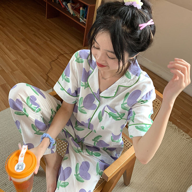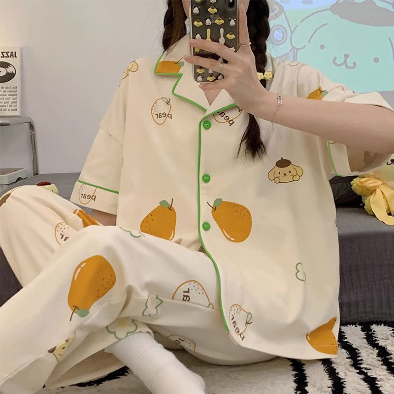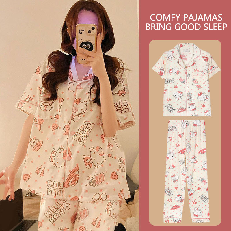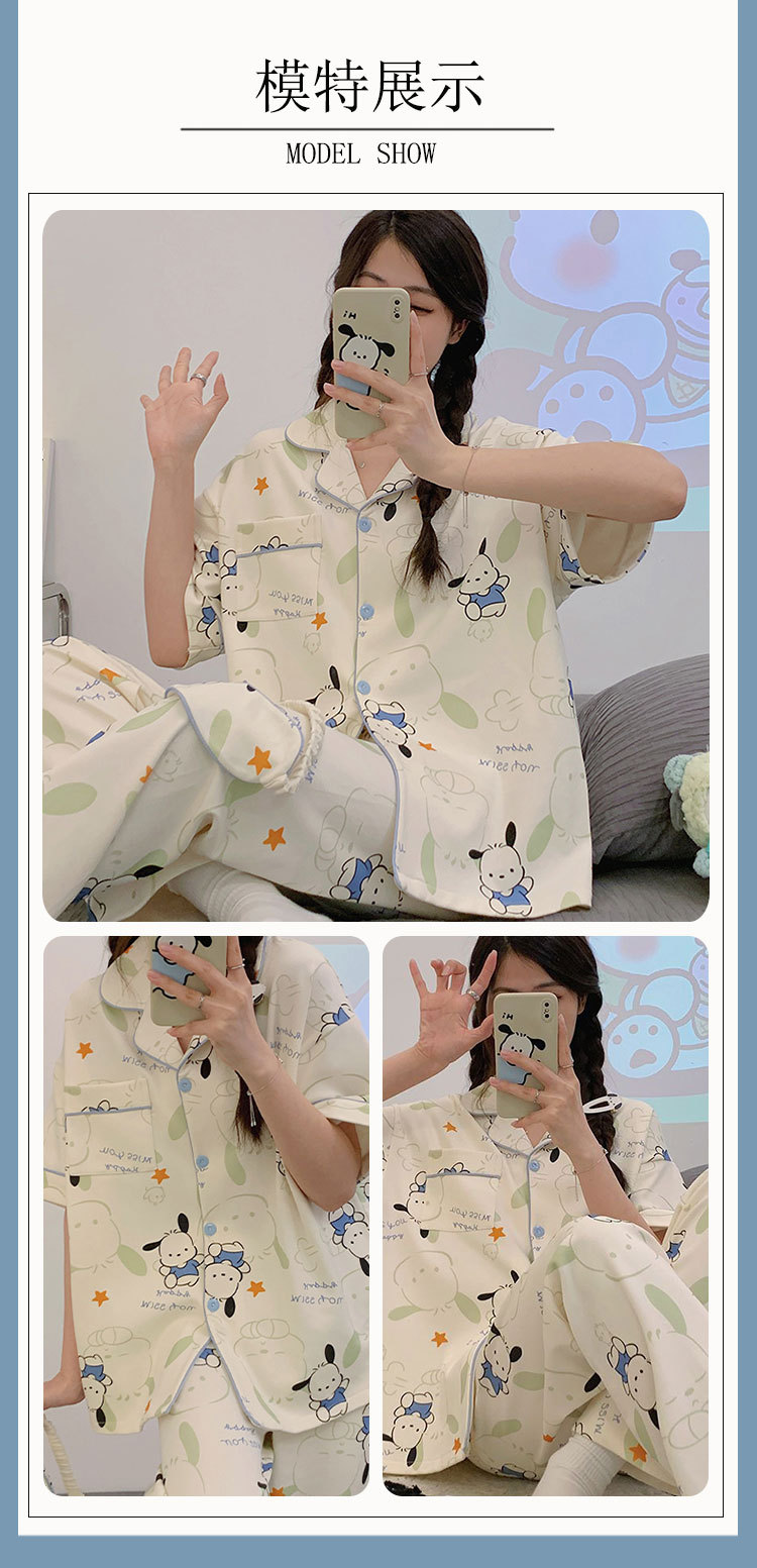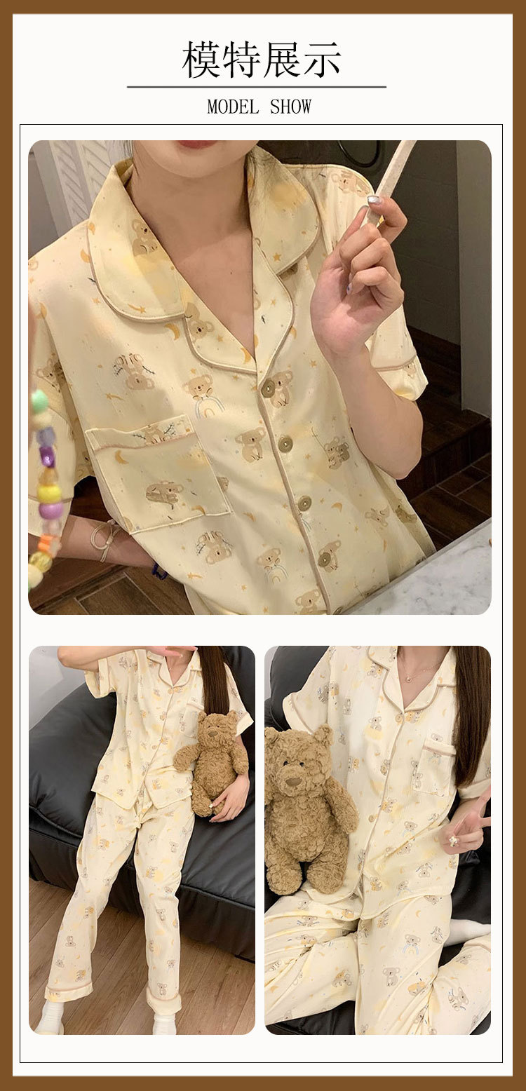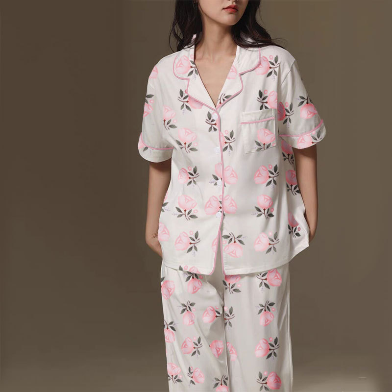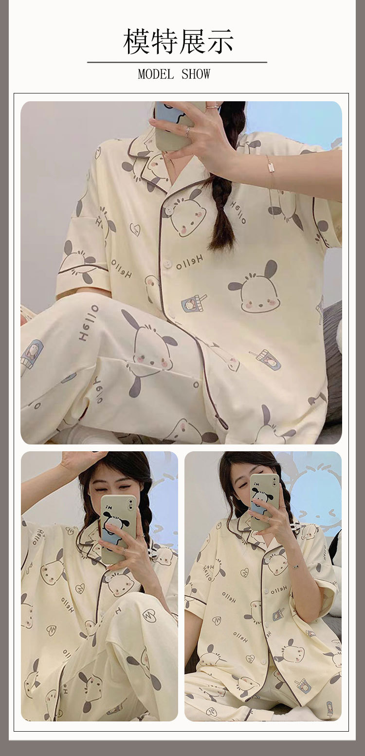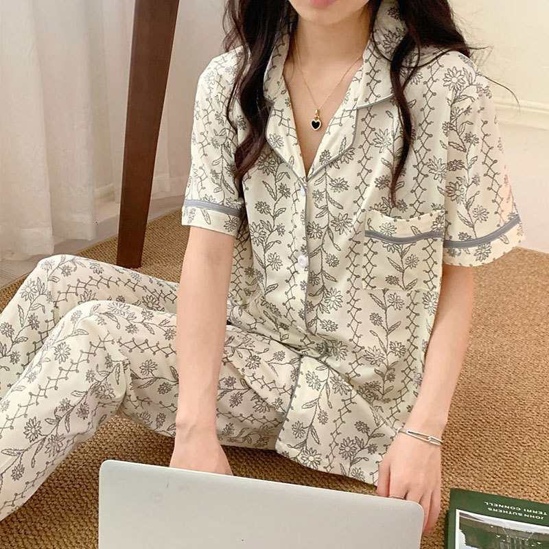 새로운 여성용 수출 잠옷, 달콤하고 귀여운 스타일의 핑크 물방울 무늬 가디건, 면 반팔 긴바지 홈웨어 세트스토어 가기