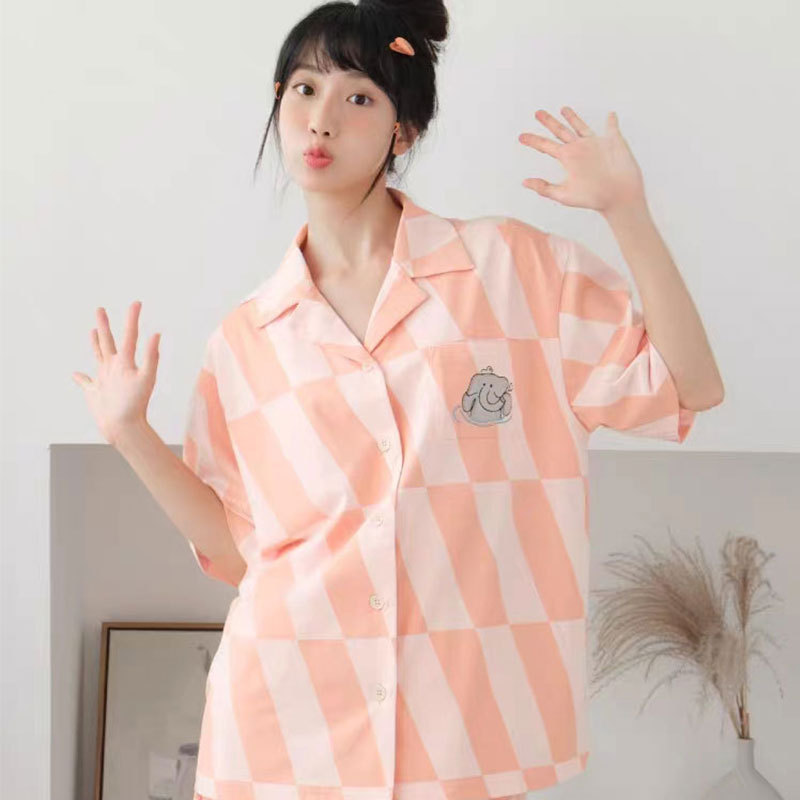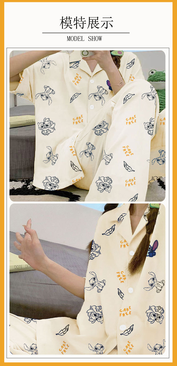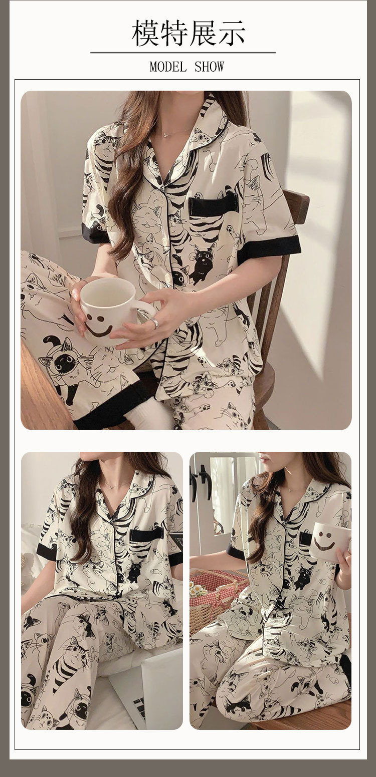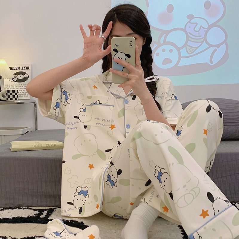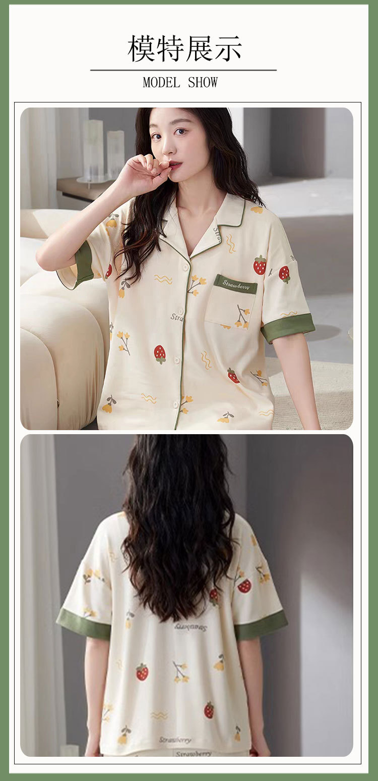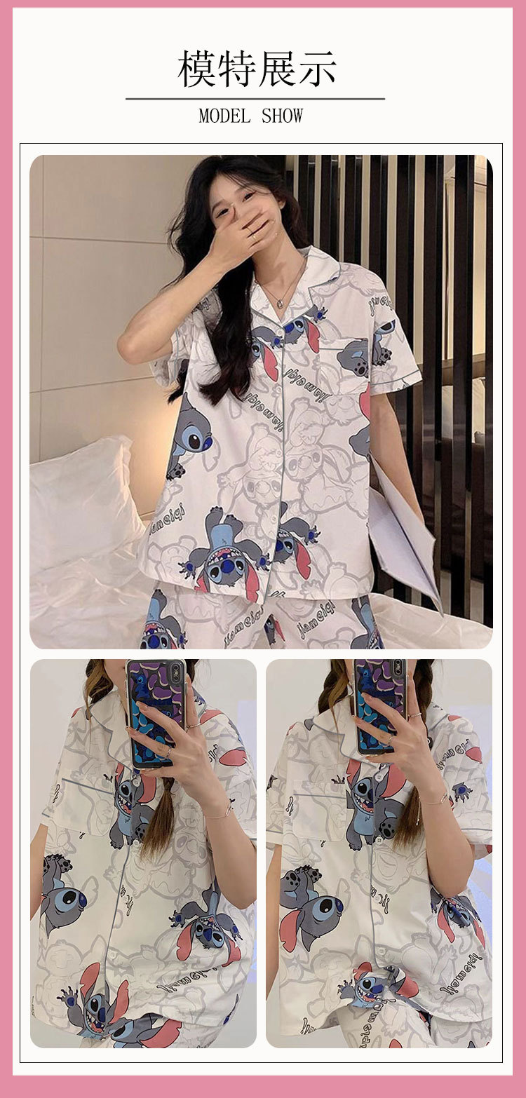 새로운 여성용 수출 잠옷, 달콤하고 귀여운 스타일의 핑크 물방울 무늬 가디건, 면 반팔 긴바지 홈웨어 세트스토어 가기