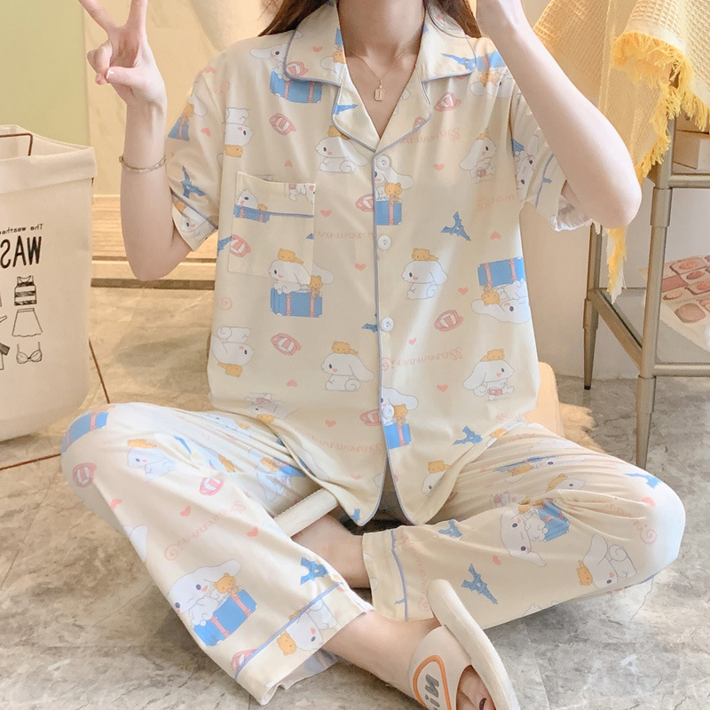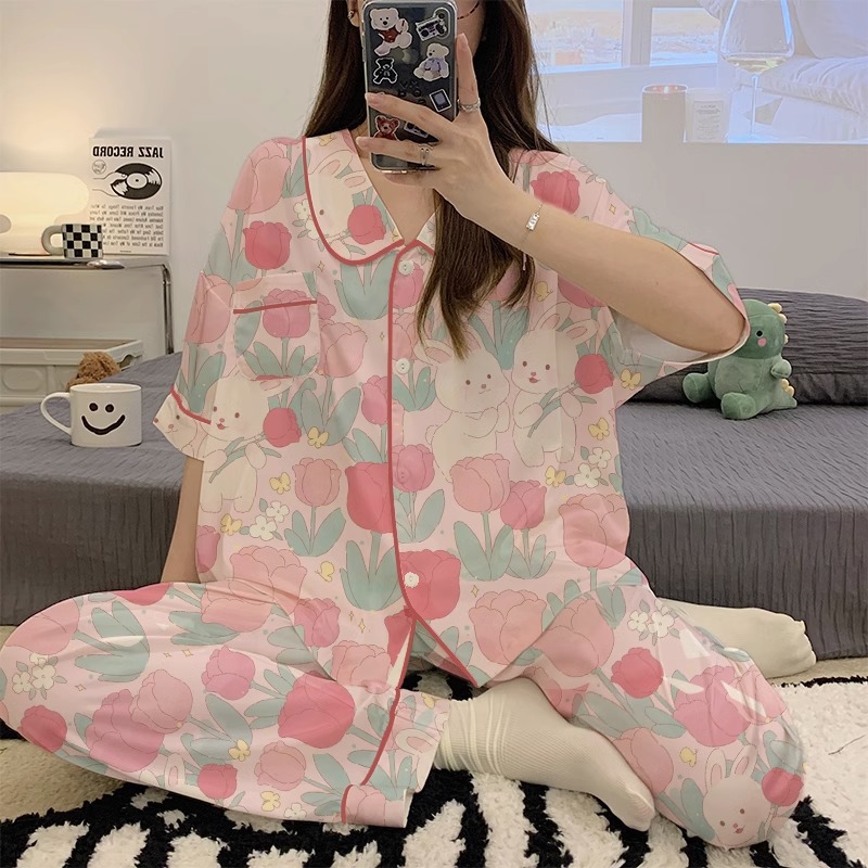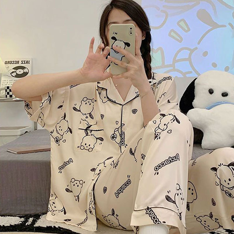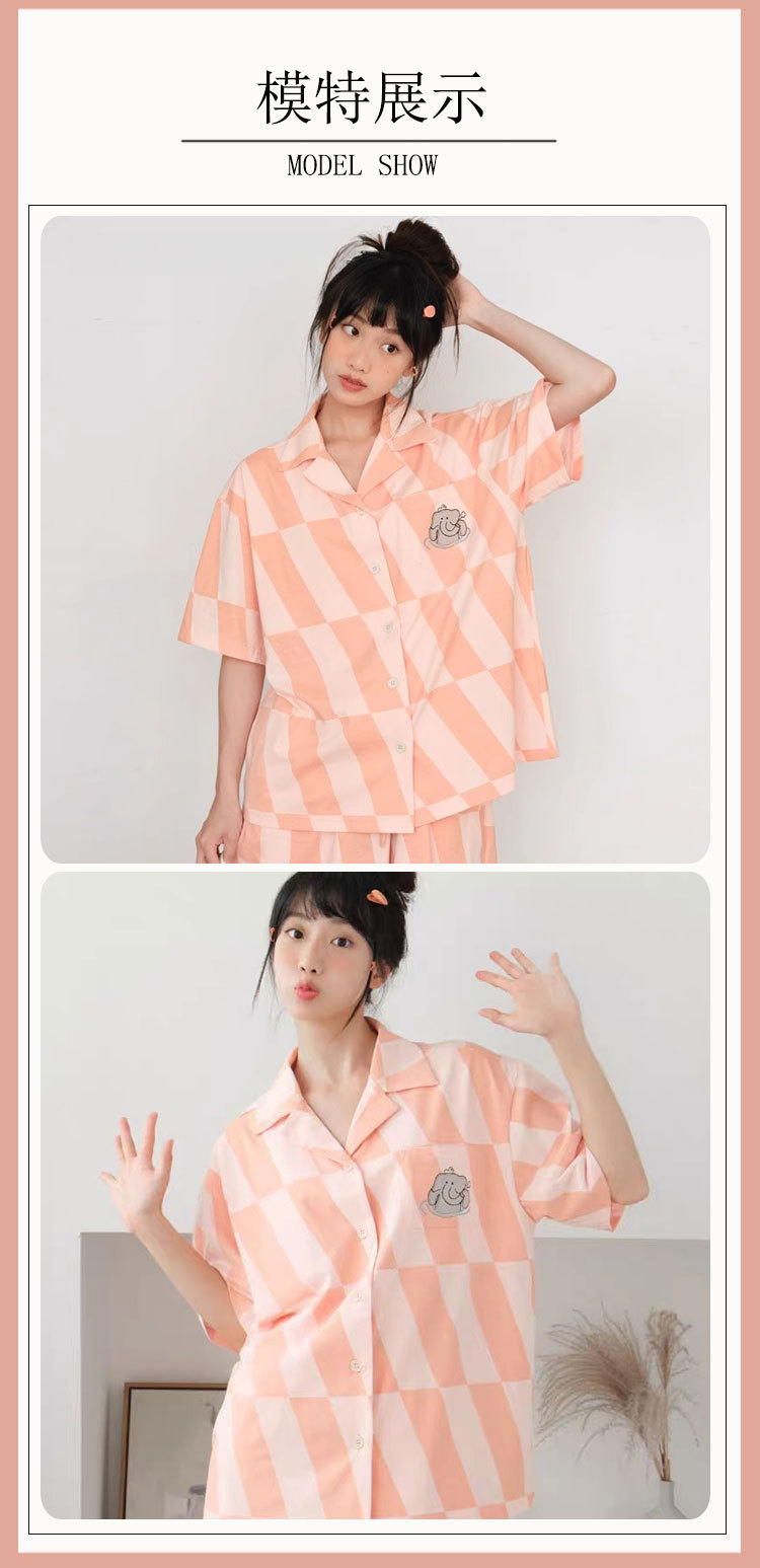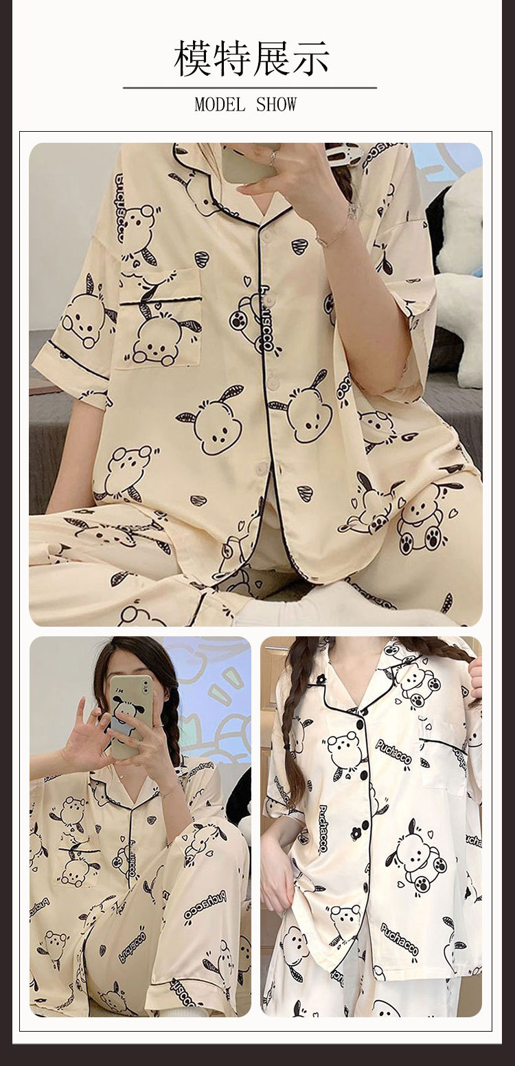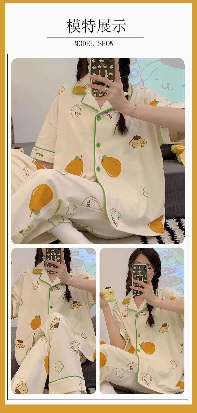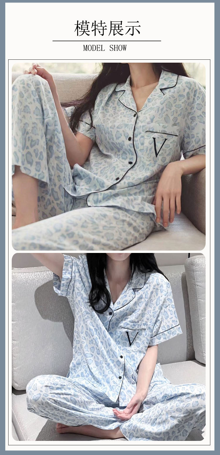 새로운 여성용 수출 잠옷, 달콤하고 귀여운 스타일의 핑크 물방울 무늬 가디건, 면 반팔 긴바지 홈웨어 세트스토어 가기