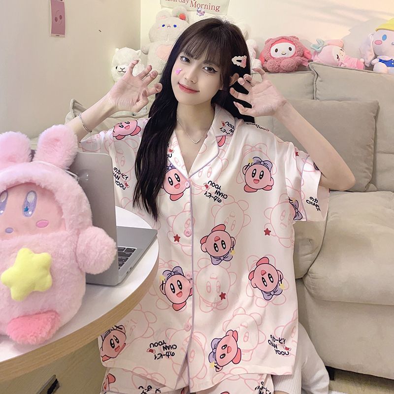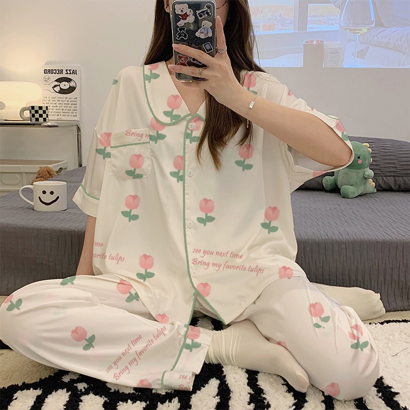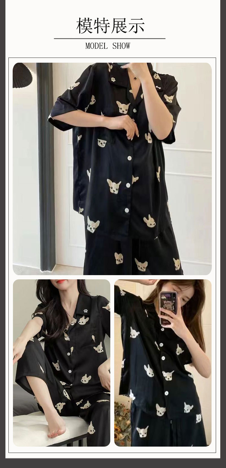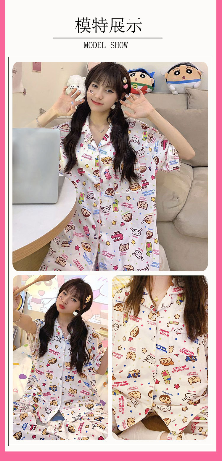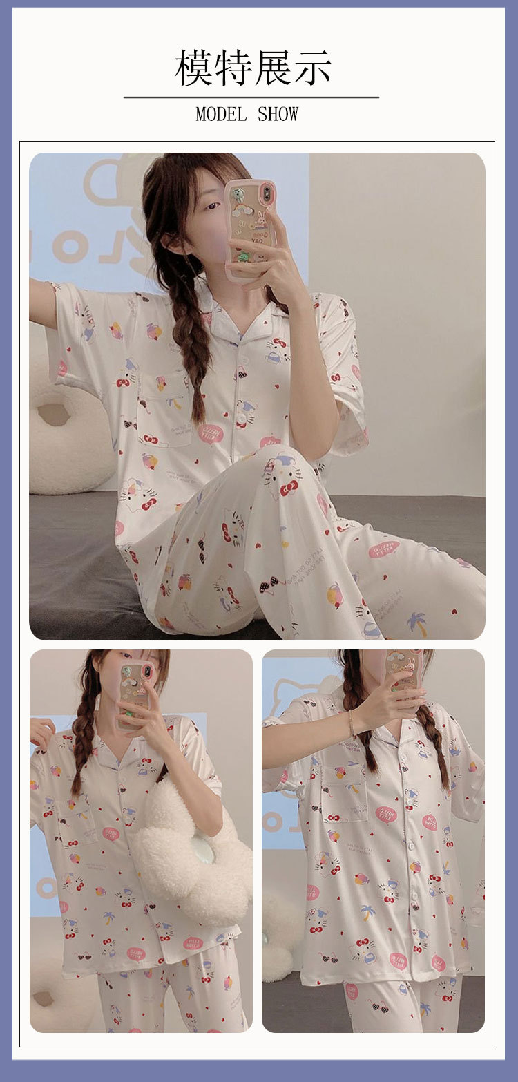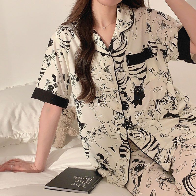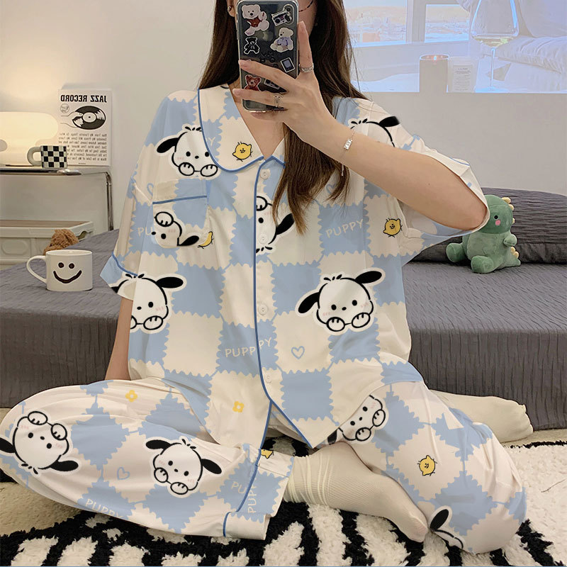 새로운 여성용 수출 잠옷, 달콤하고 귀여운 스타일의 핑크 물방울 무늬 가디건, 면 반팔 긴바지 홈웨어 세트스토어 가기