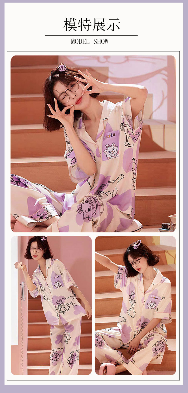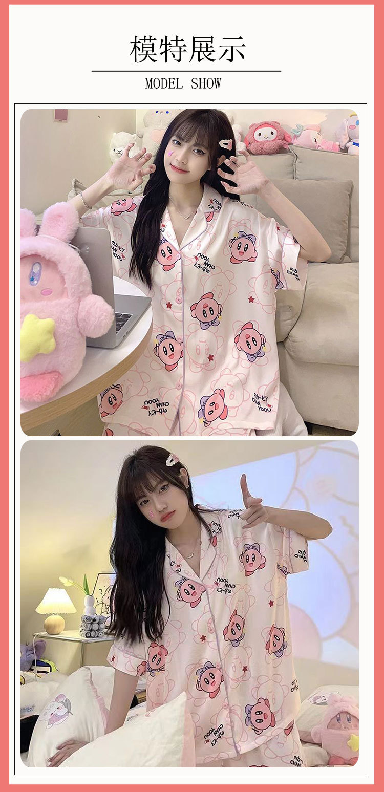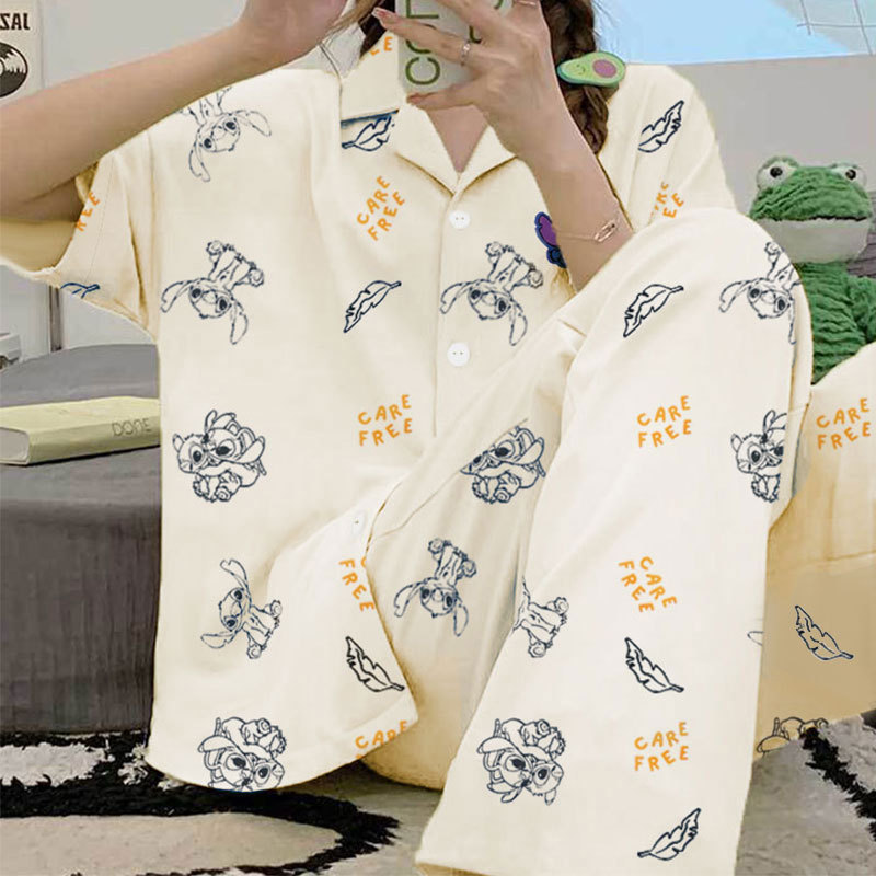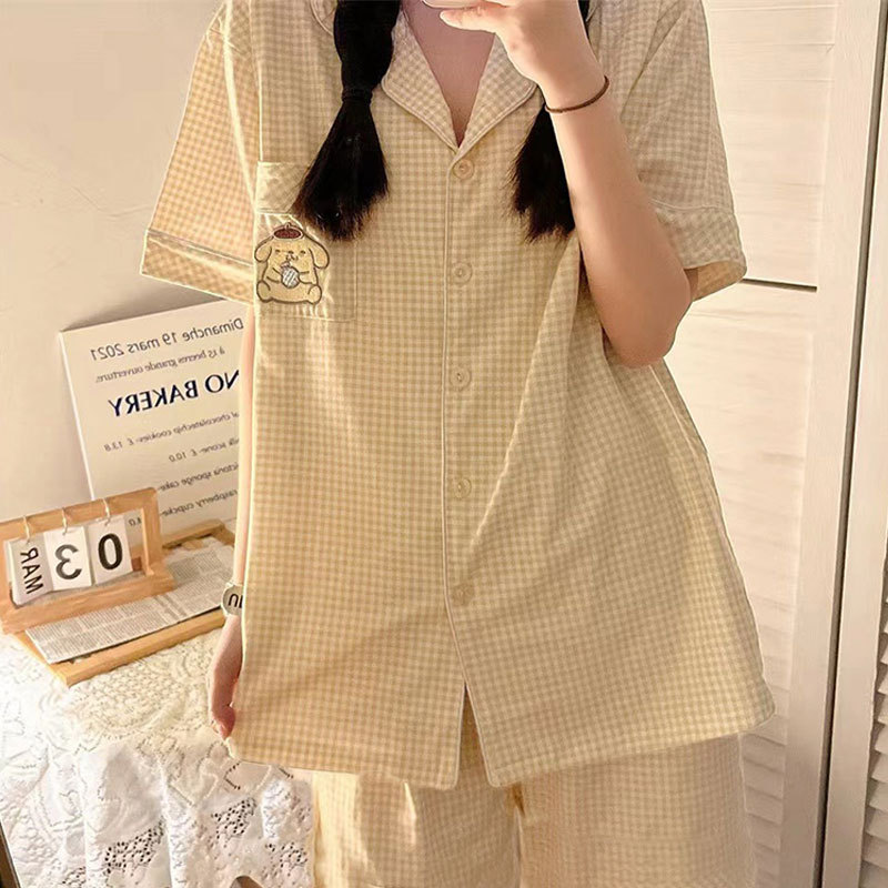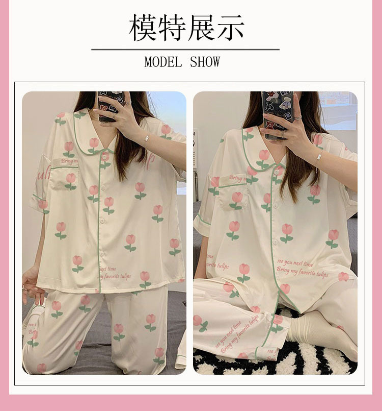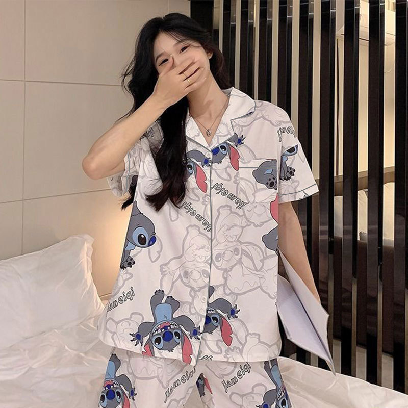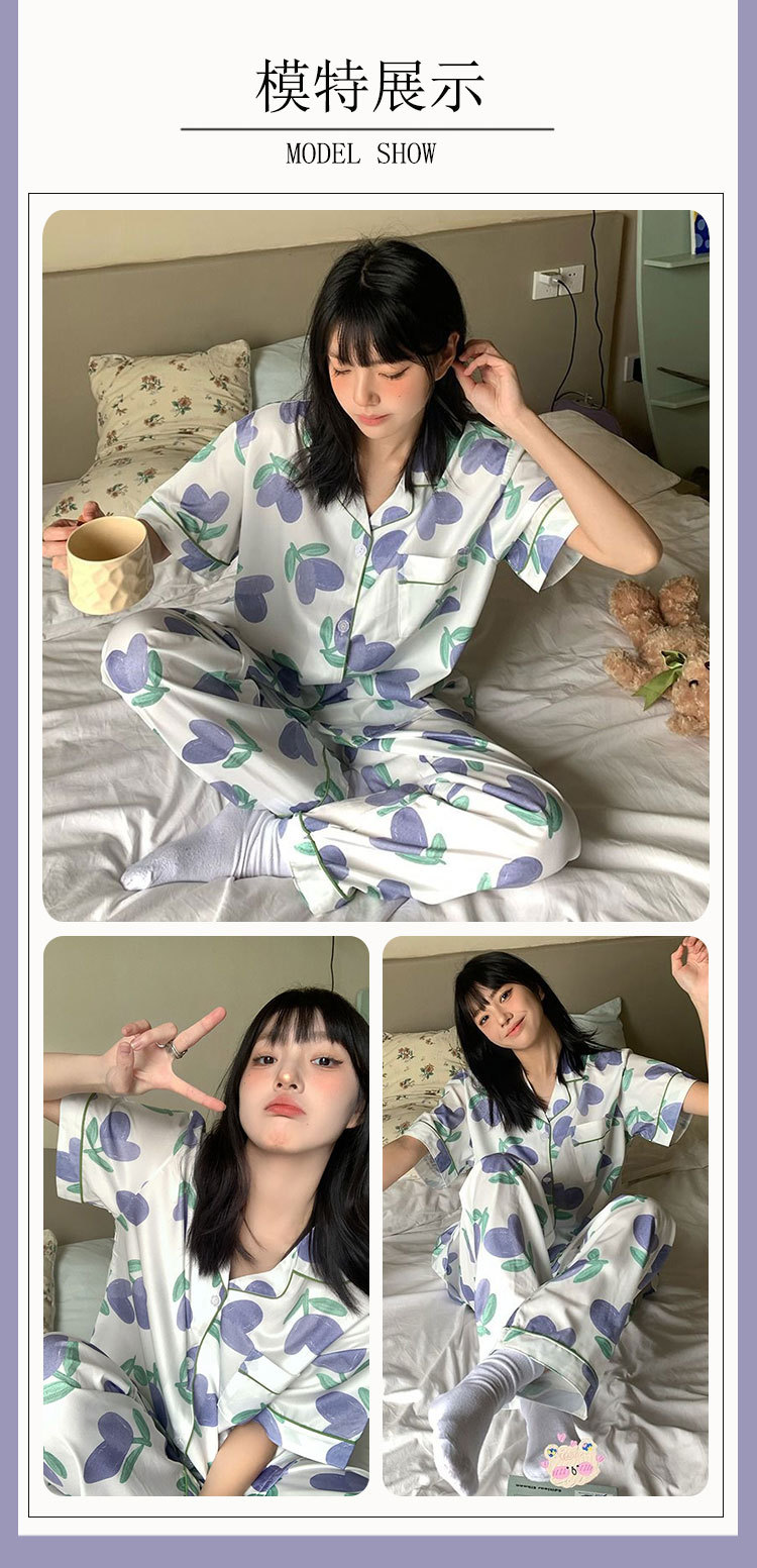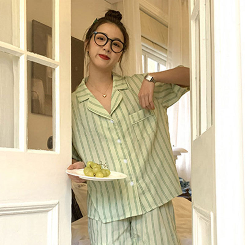 새로운 여성용 수출 잠옷, 달콤하고 귀여운 스타일의 핑크 물방울 무늬 가디건, 면 반팔 긴바지 홈웨어 세트스토어 가기