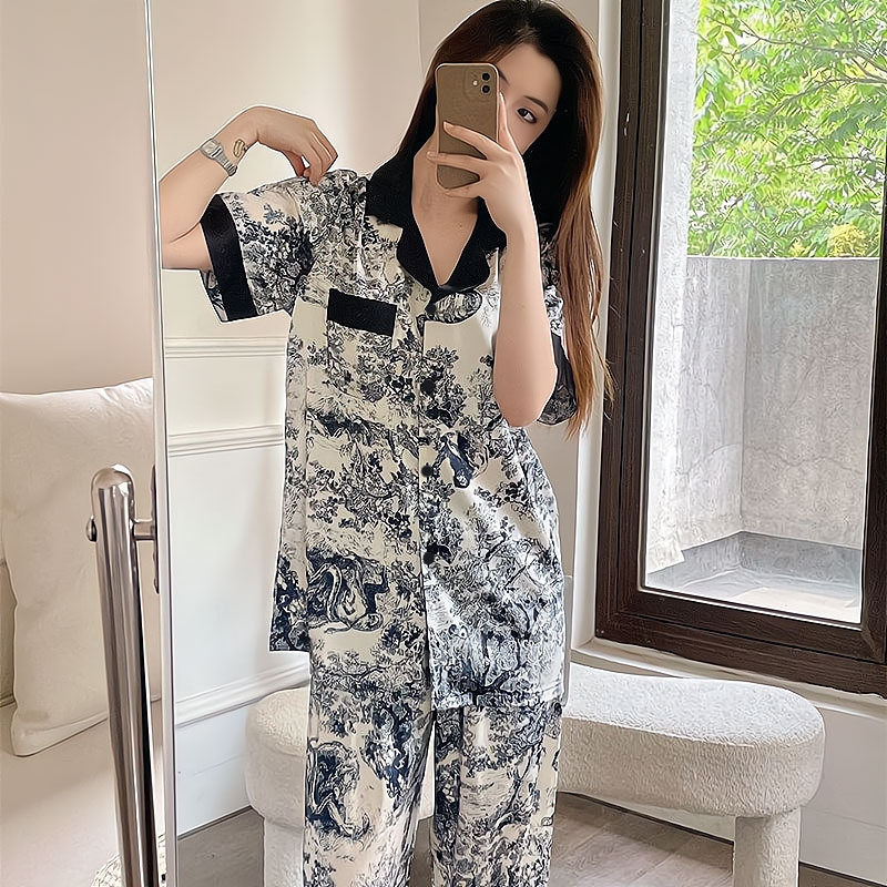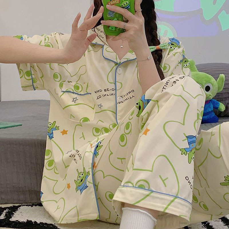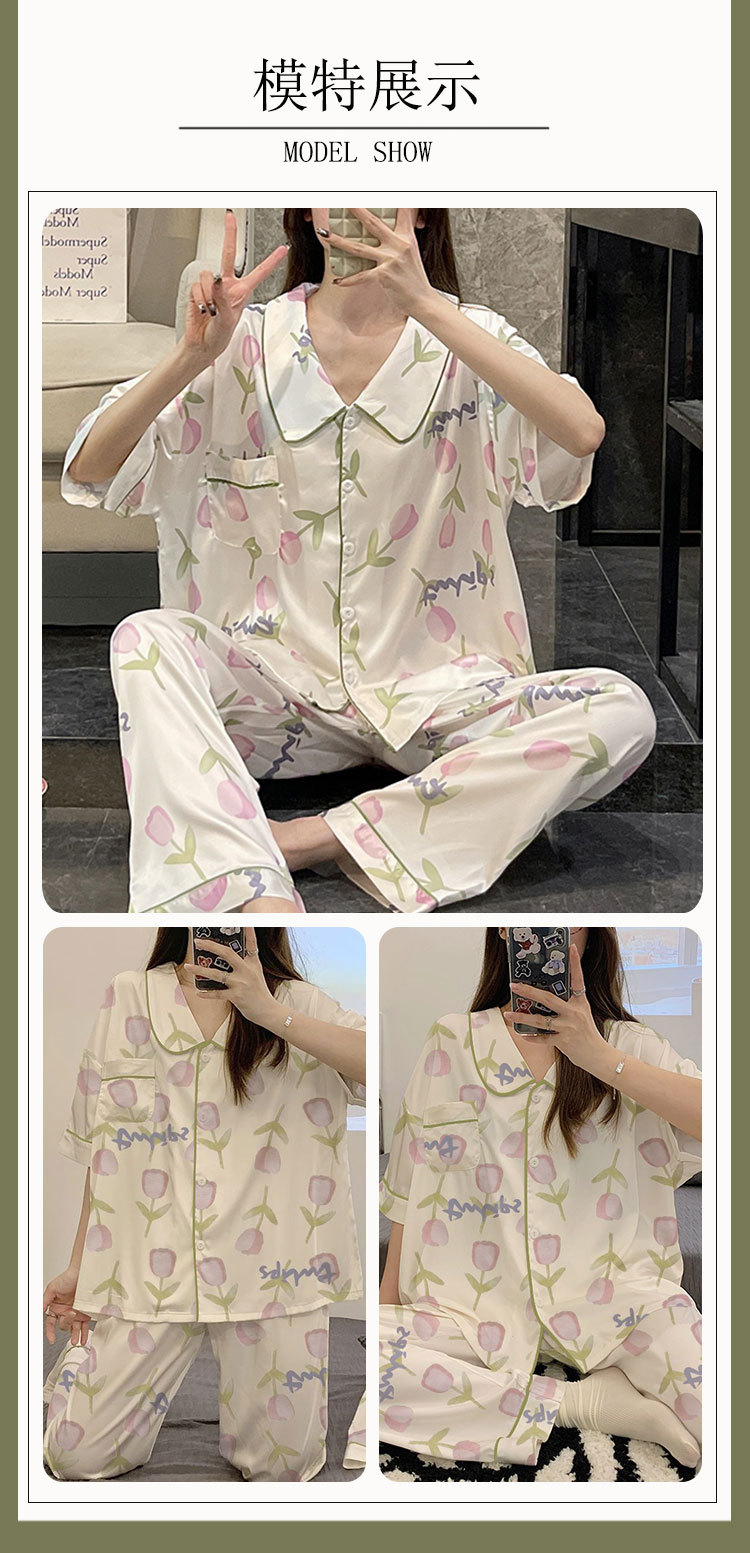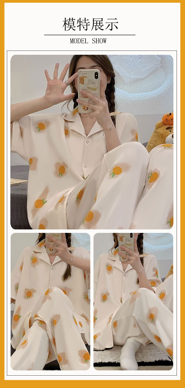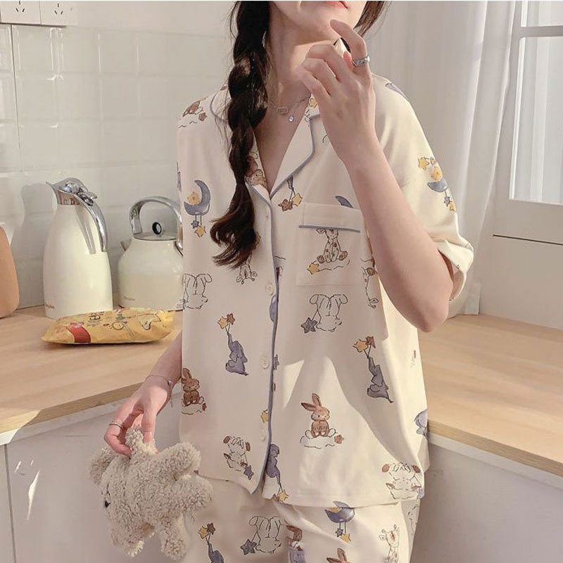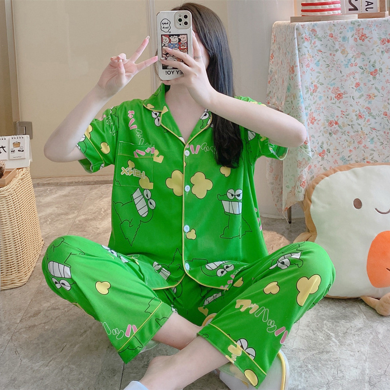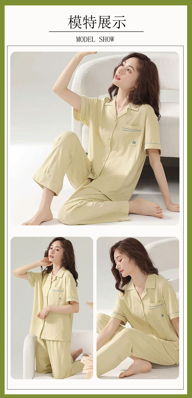 새로운 여성용 수출 잠옷, 달콤하고 귀여운 스타일의 핑크 물방울 무늬 가디건, 면 반팔 긴바지 홈웨어 세트스토어 가기
