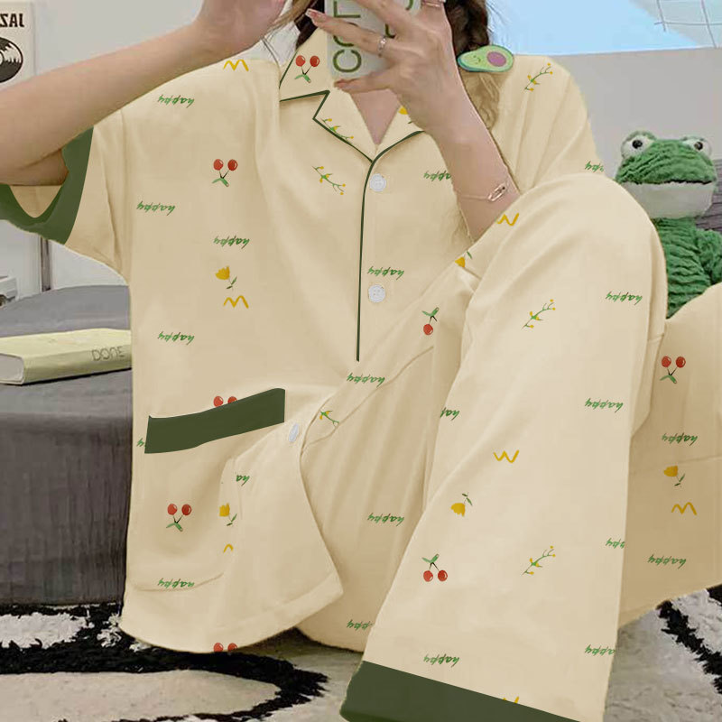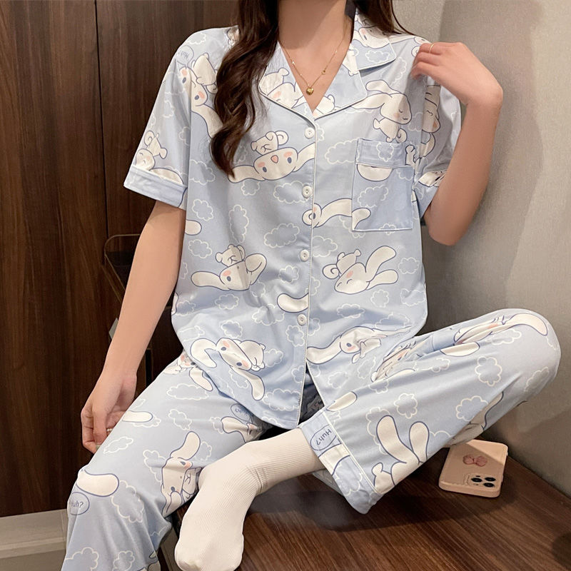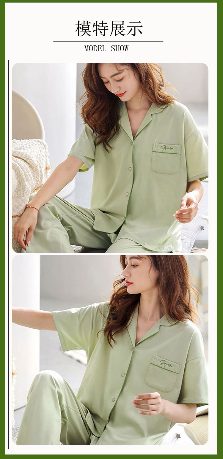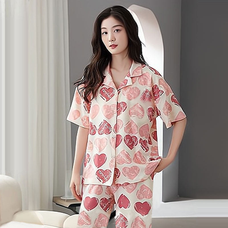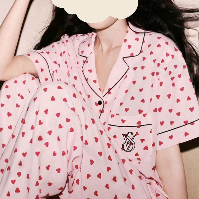 새로운 여성용 수출 잠옷, 달콤하고 귀여운 스타일의 핑크 물방울 무늬 가디건, 면 반팔 긴바지 홈웨어 세트