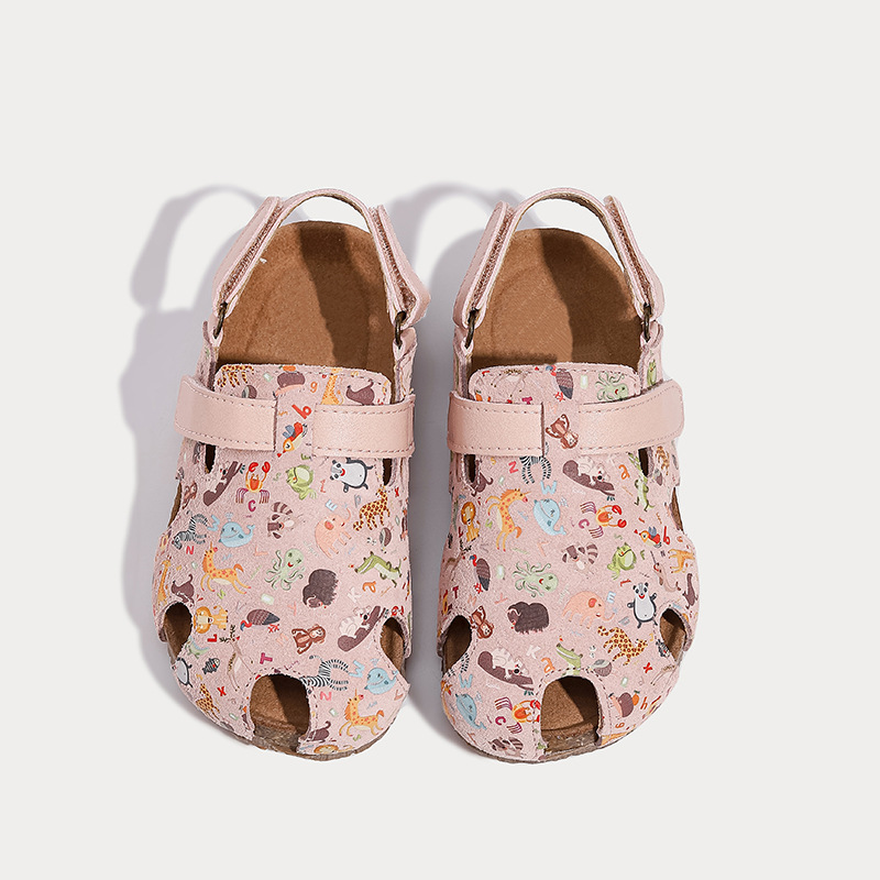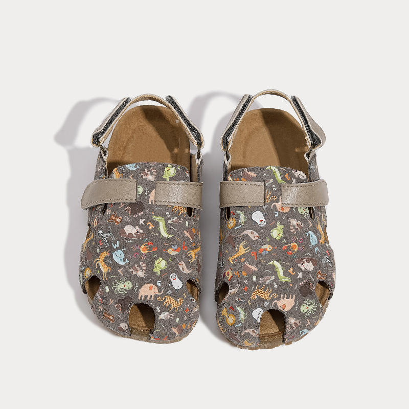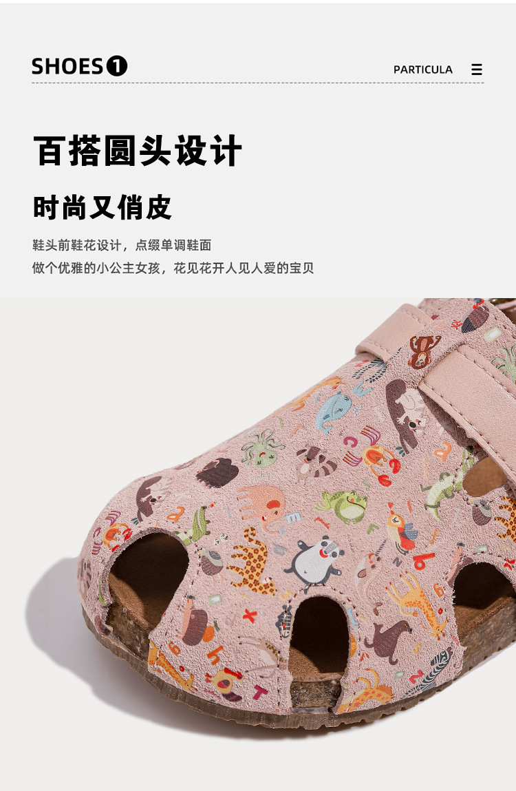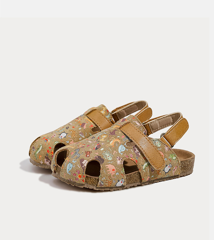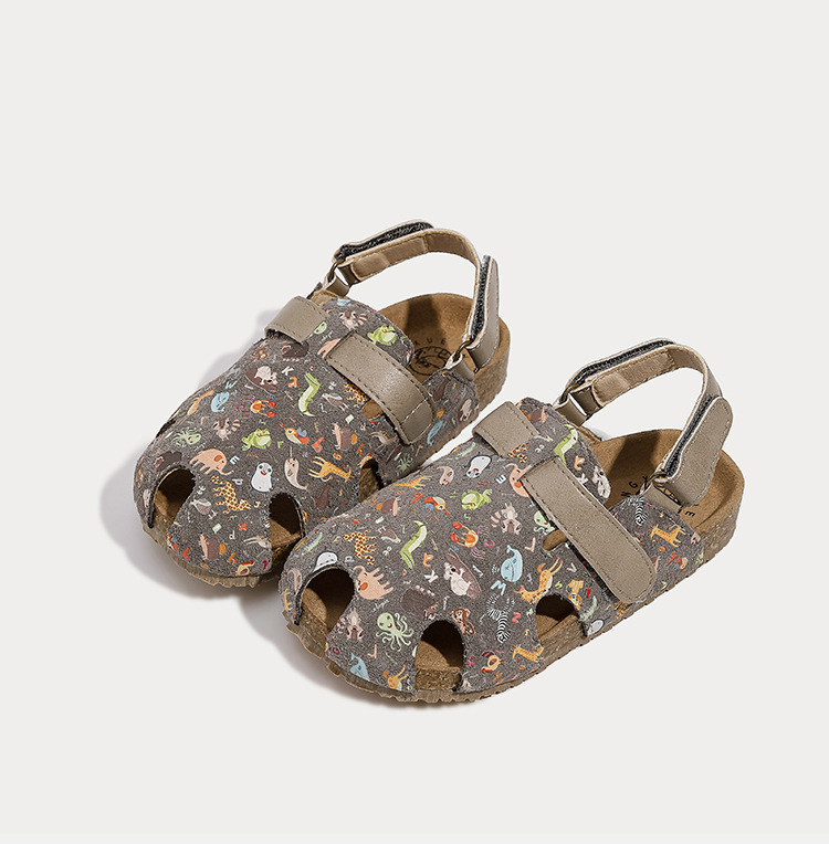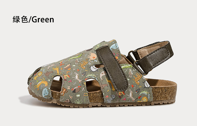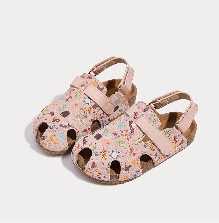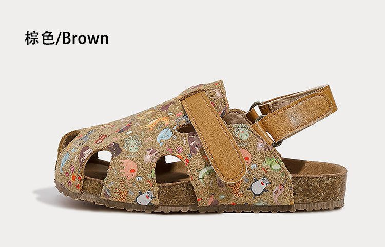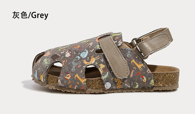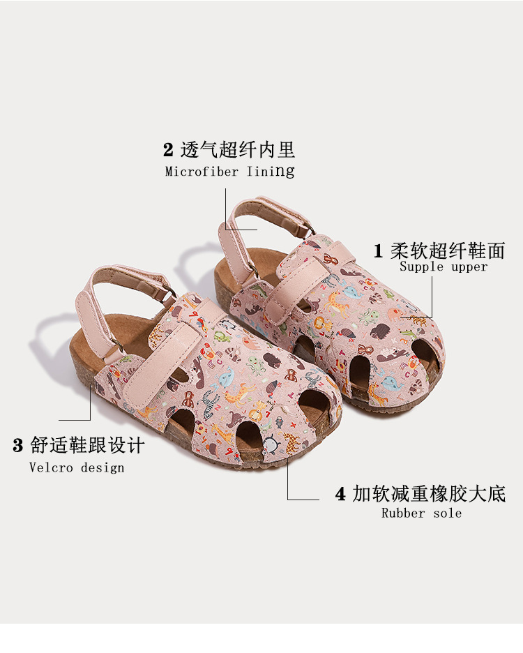 한국 정품 가죽 아기 샌들 소년 레트로 부드러운 바닥 버켄 네스 신발 만화 인쇄 소녀 비치 신발 여름 어린이 신발