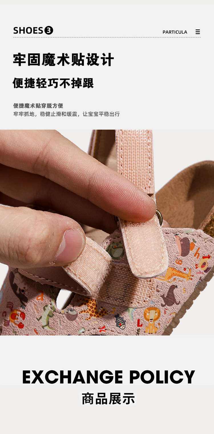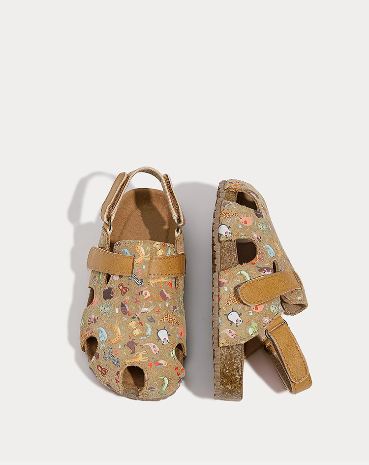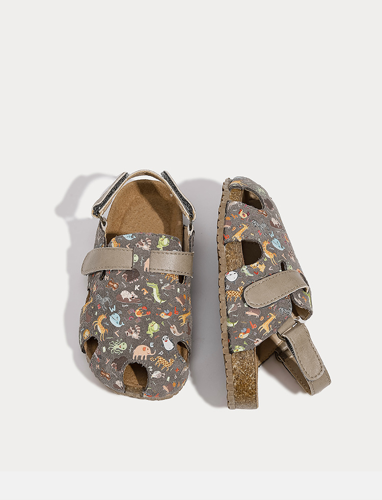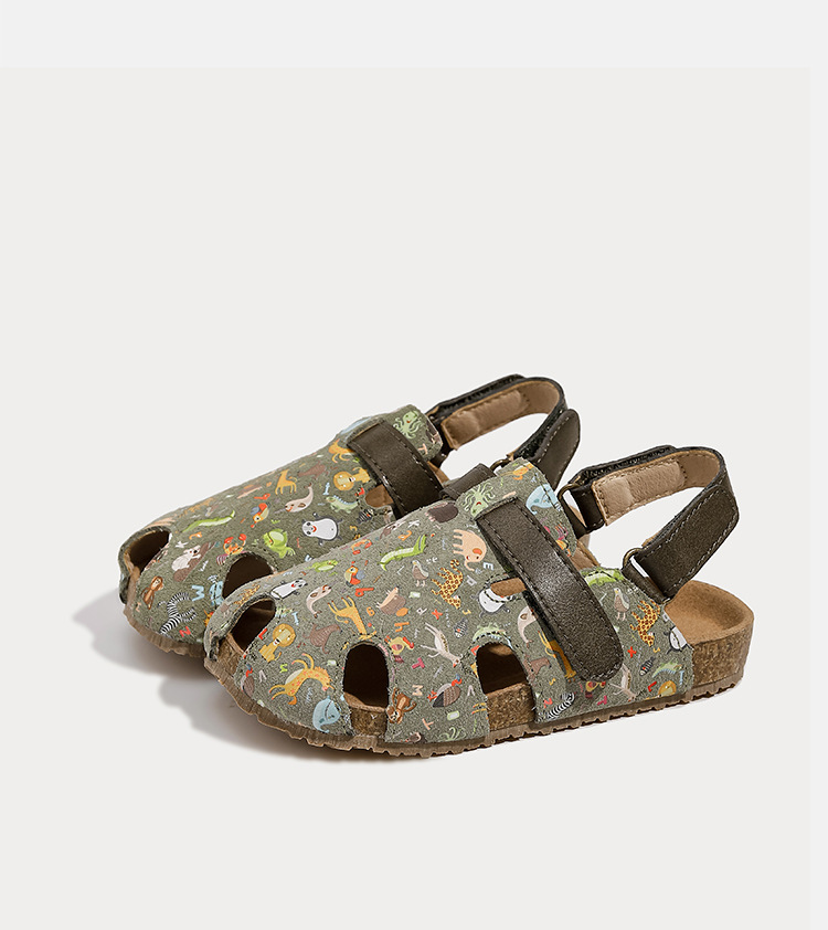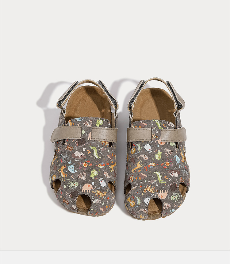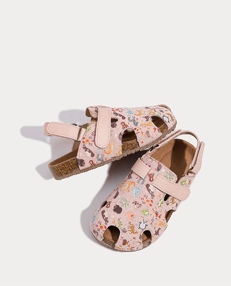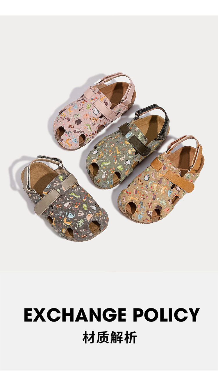 한국 정품 가죽 아기 샌들 소년 레트로 부드러운 바닥 버켄 네스 신발 만화 인쇄 소녀 비치 신발 여름 어린이 신발