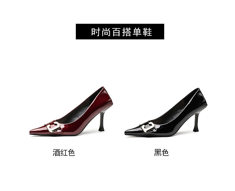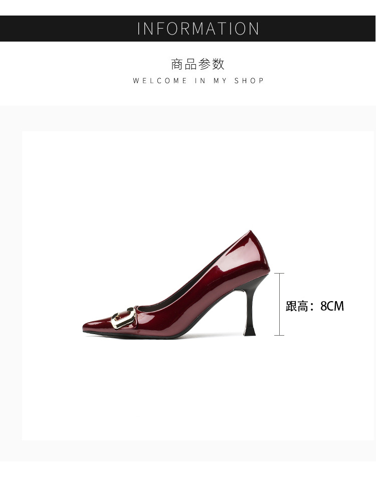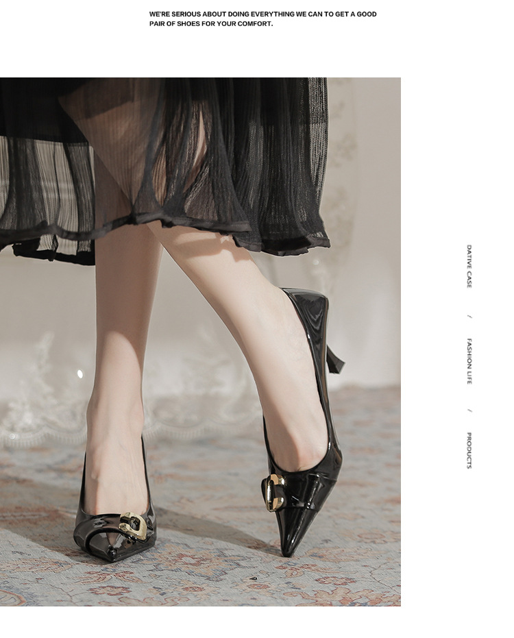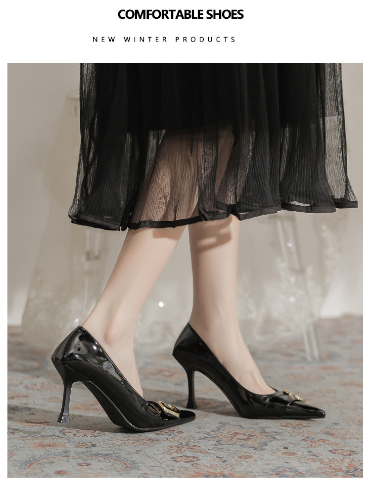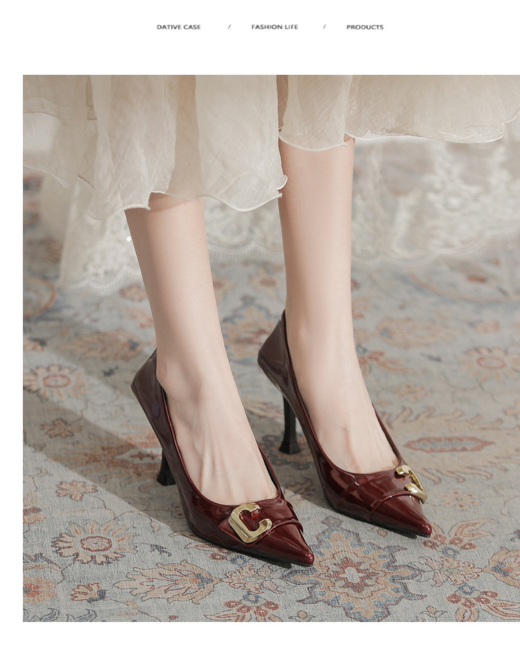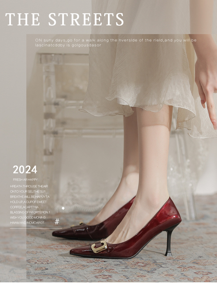 유럽풍 버클 장식 페이턴트 가죽 뾰족코 얇은 굽 하이힐 여성용 2024 여름 신상 메탈 버클 우아한 분위기의 얕은 굽 슈즈스토어 가기