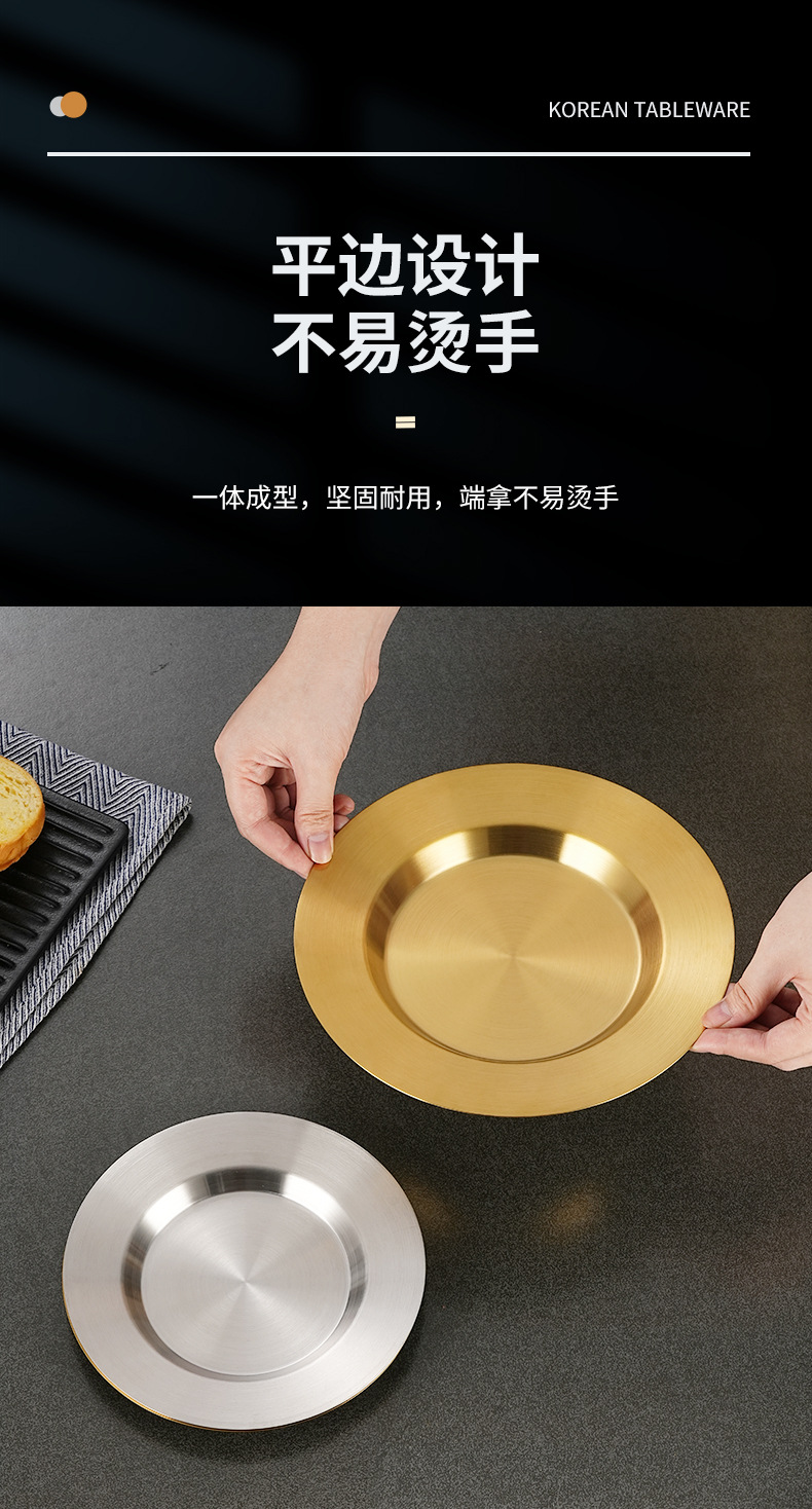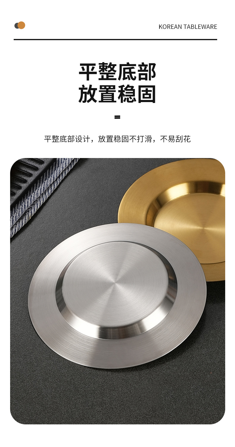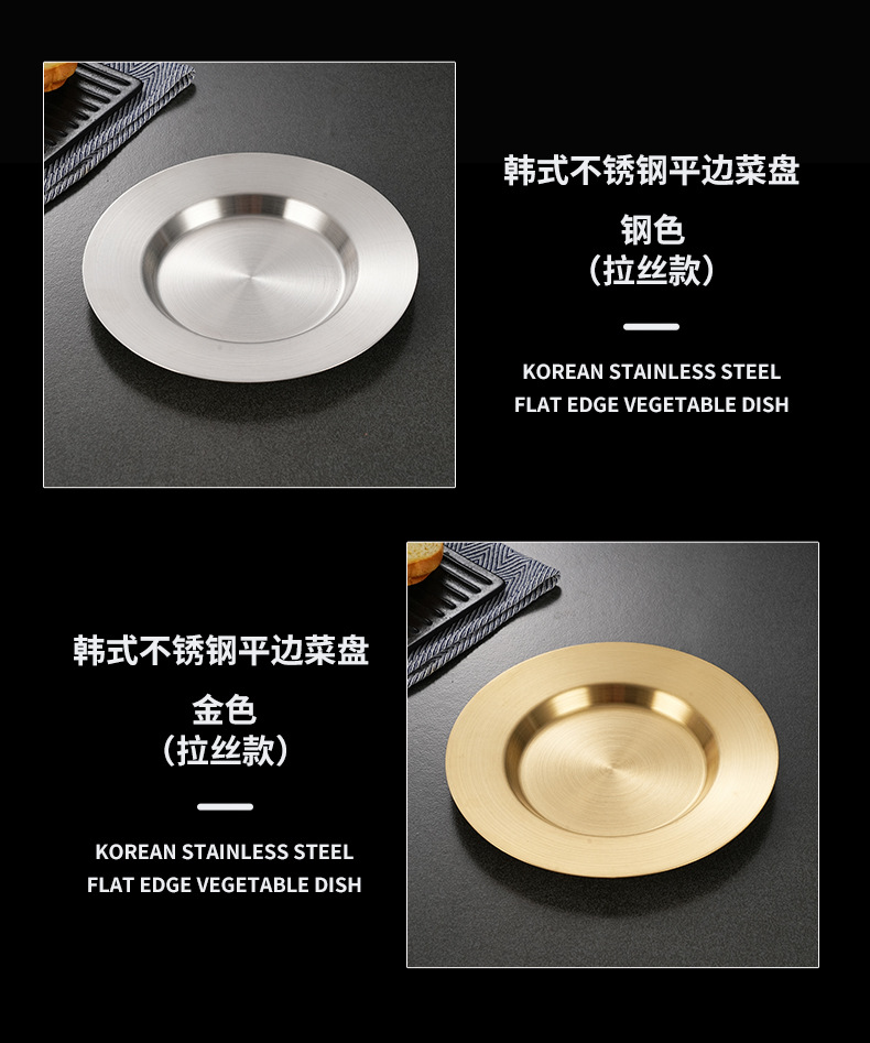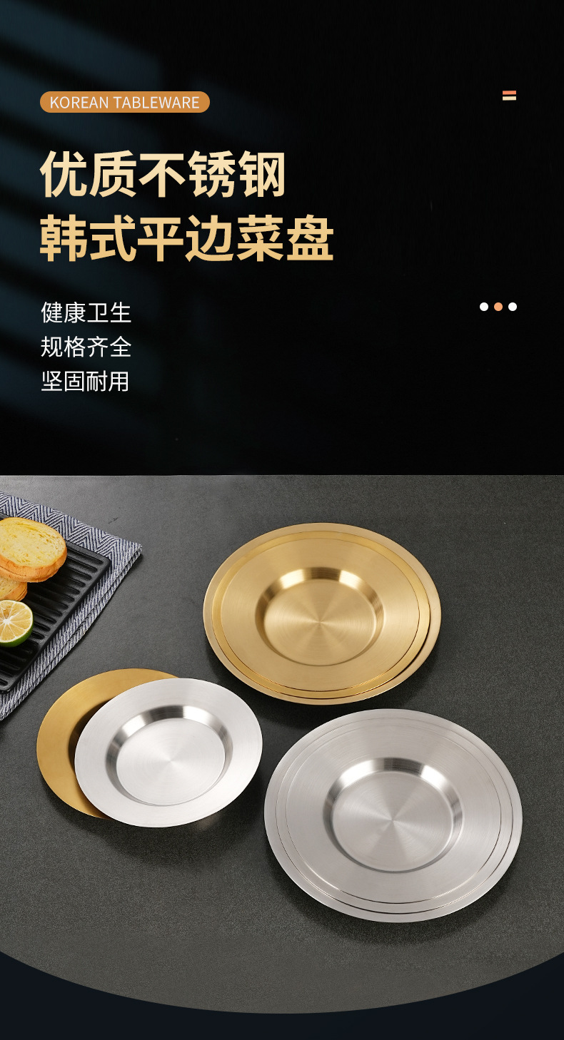 일본식 스테인레스 스틸 디스크 가정용 평평한 바닥 얕은 접시 샐러드 스낵 플레이트 골든 한국식 바베큐 플레이트 서양식 요리스토어 가기