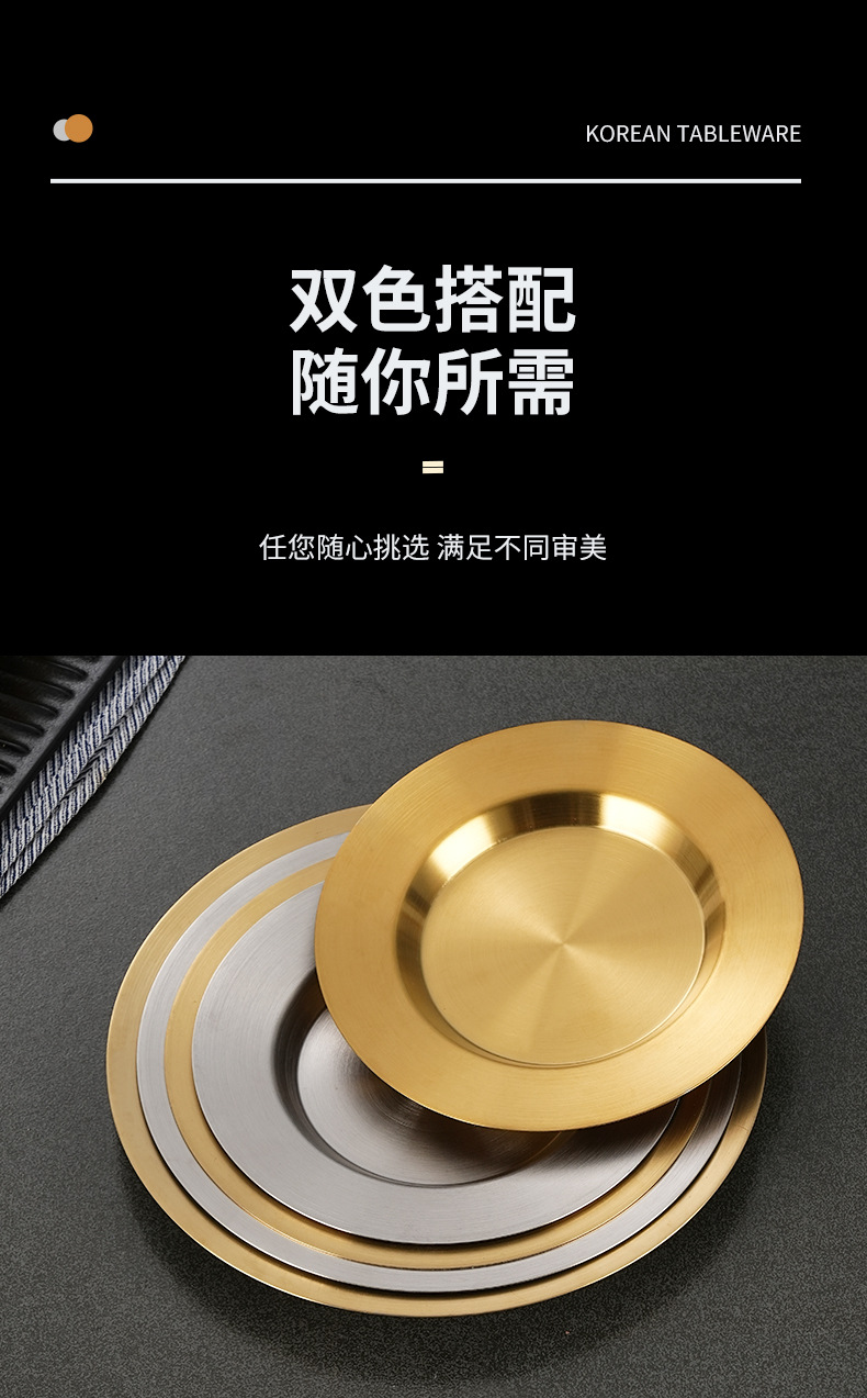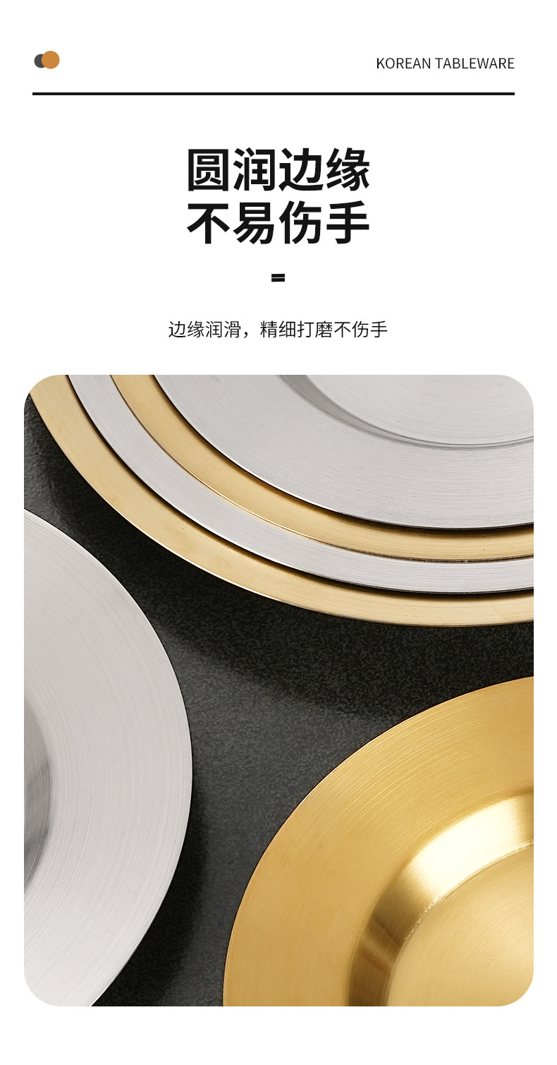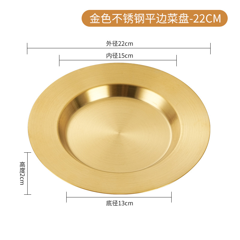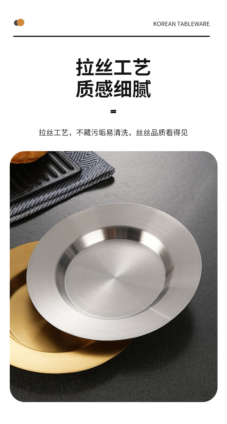 일본식 스테인레스 스틸 디스크 가정용 평평한 바닥 얕은 접시 샐러드 스낵 플레이트 골든 한국식 바베큐 플레이트 서양식 요리스토어 가기