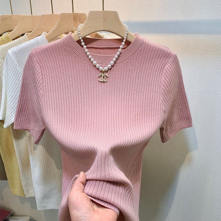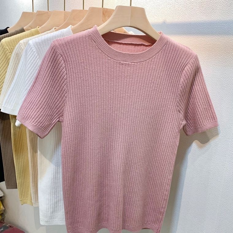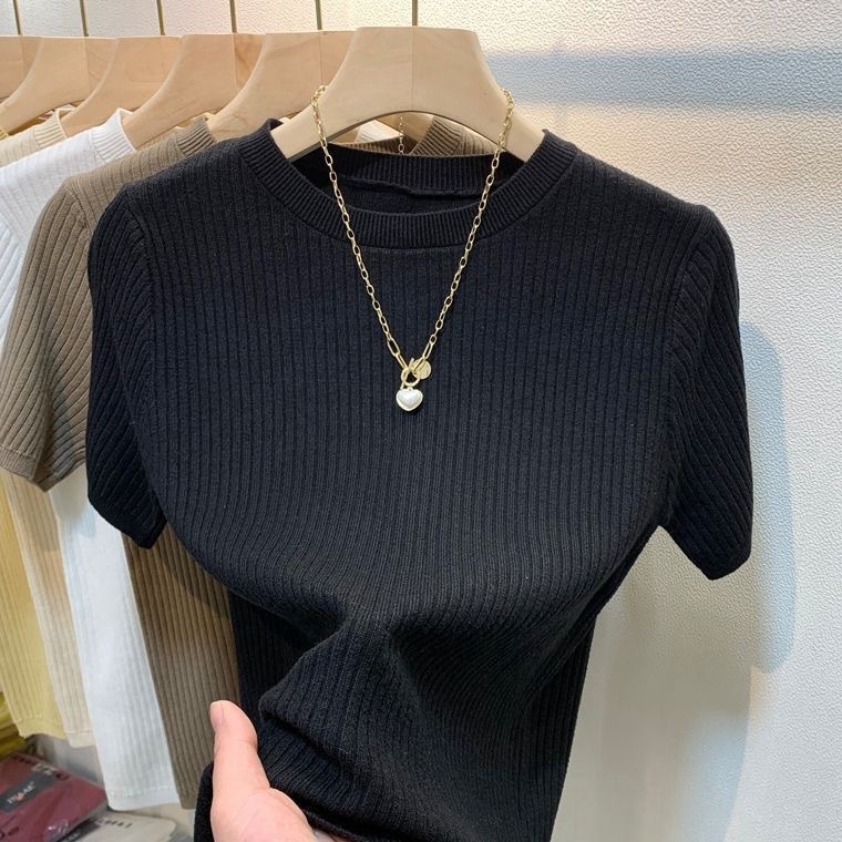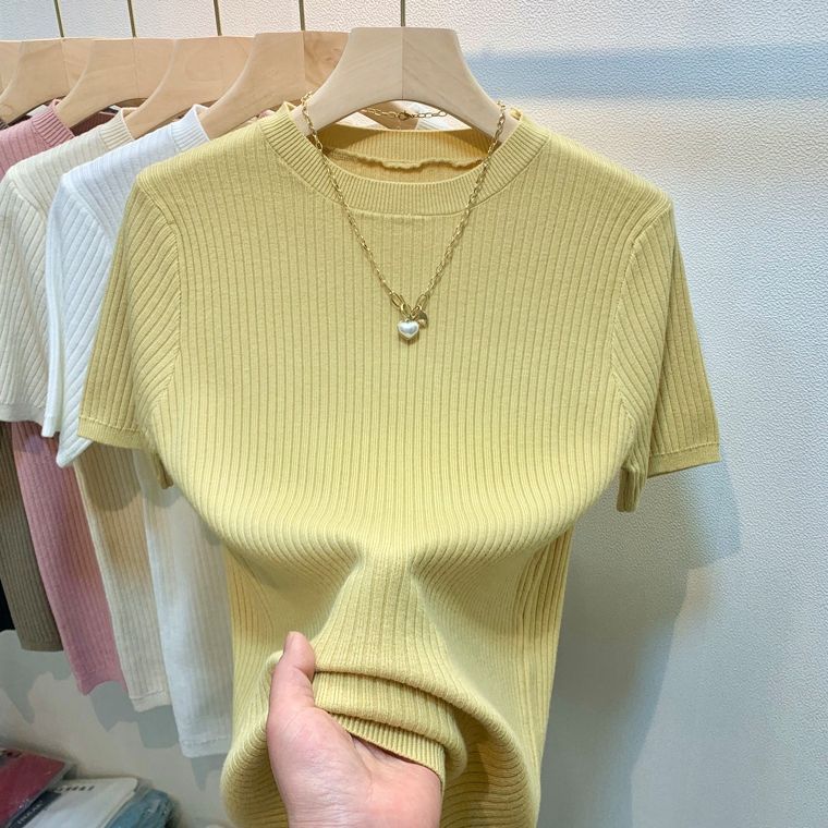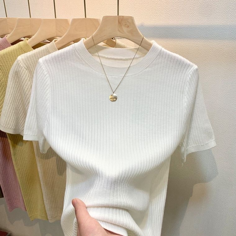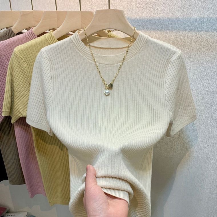 2024 여름 새로운 슬림 핏 니트웨어 반팔 여성 풀오버 스웨터 내부 짧은 라운드 넥베이스 셔츠