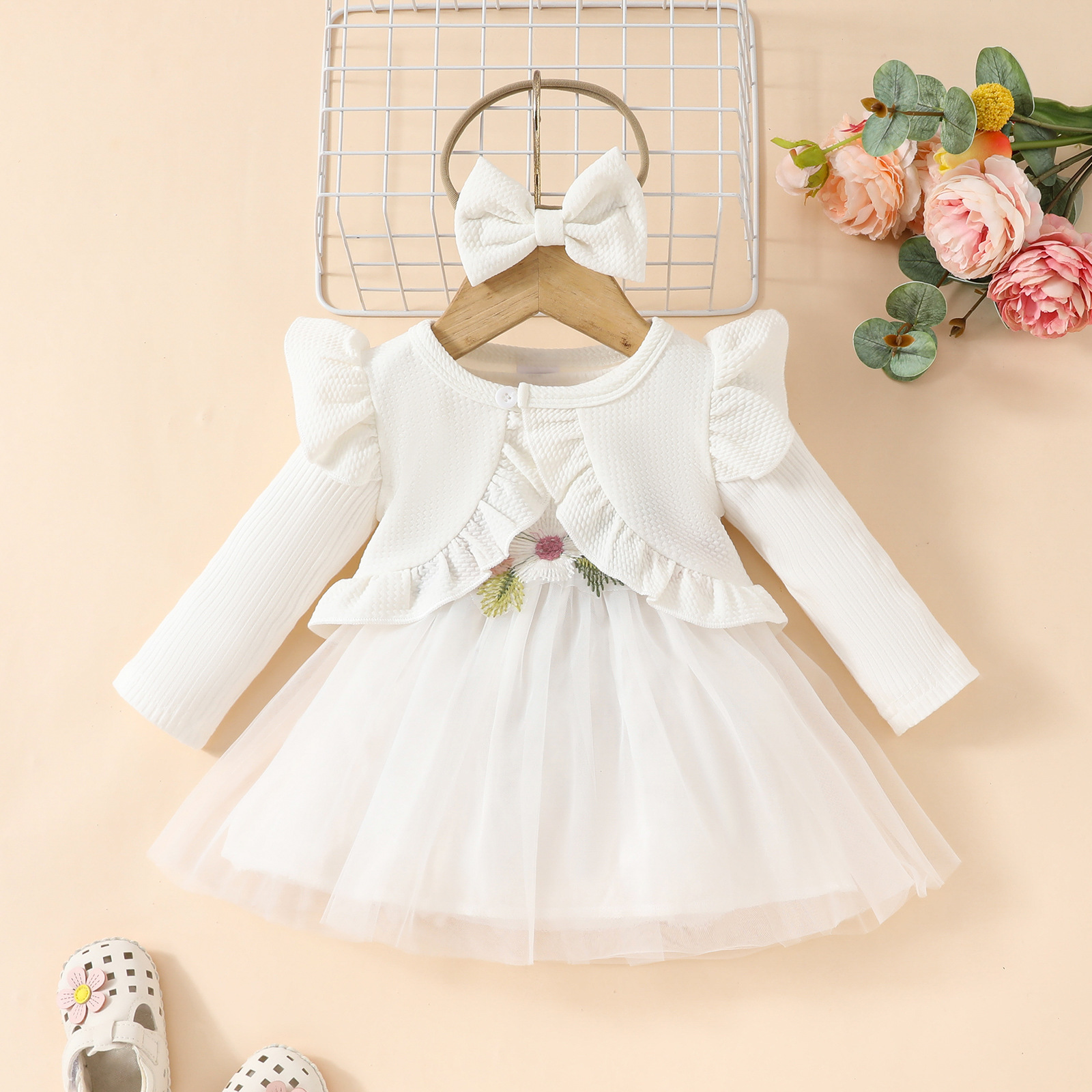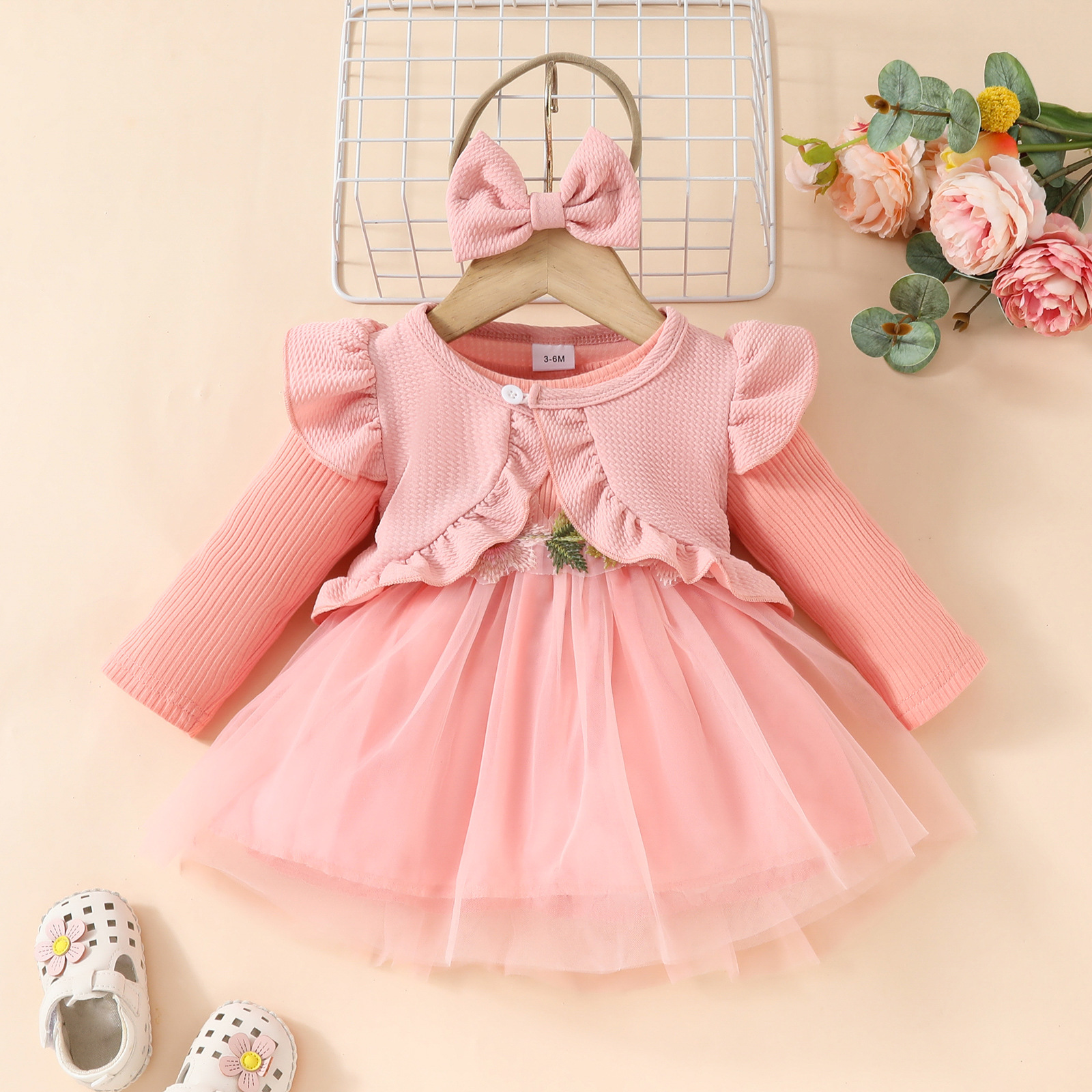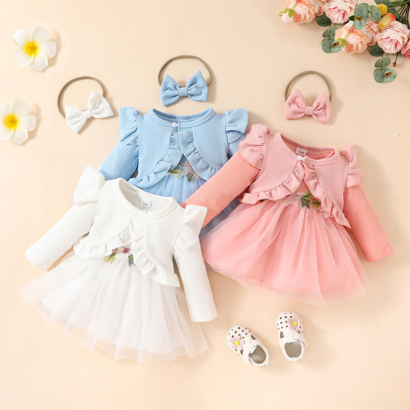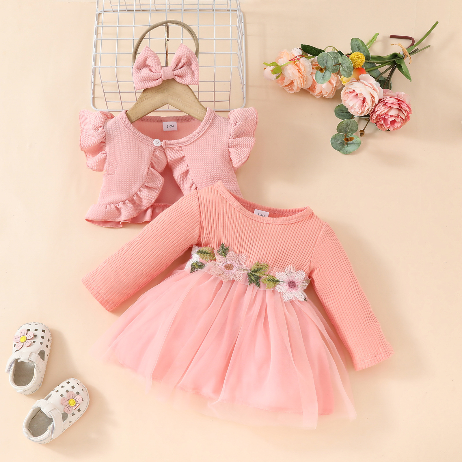 2024 가을과 겨울 유아 소녀 세트 스커트 민소매 주름 짧은 코트 긴 소매 메쉬 아플리케 원피스