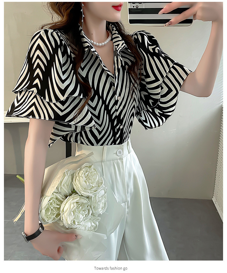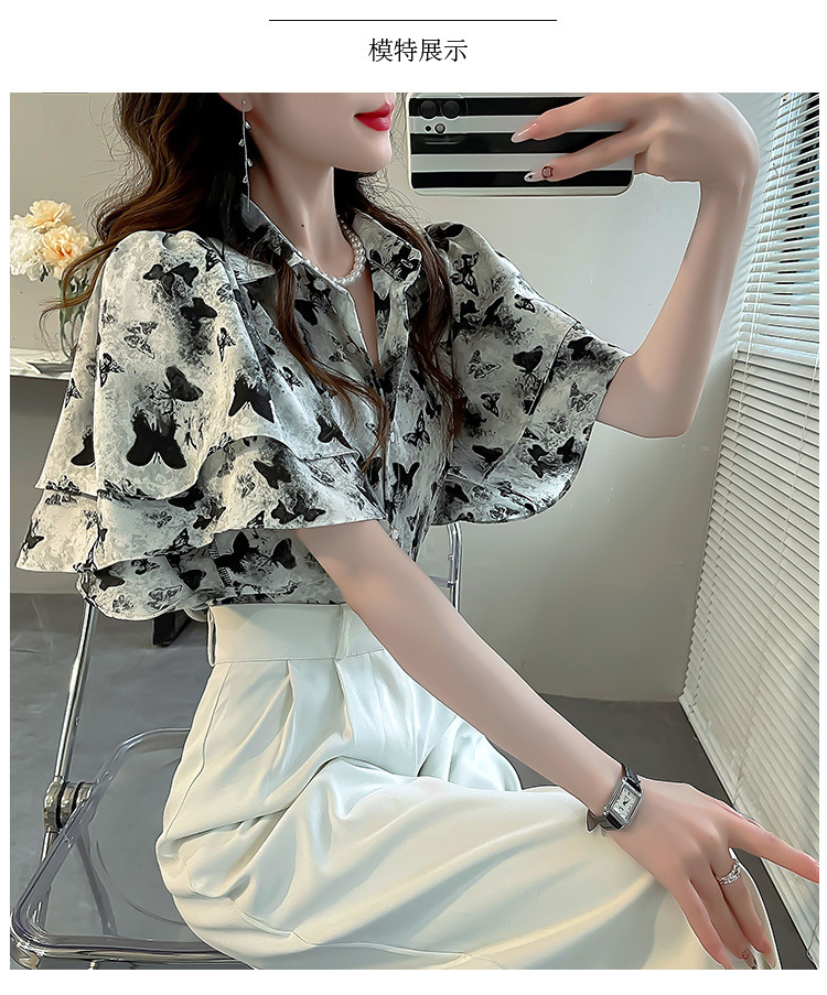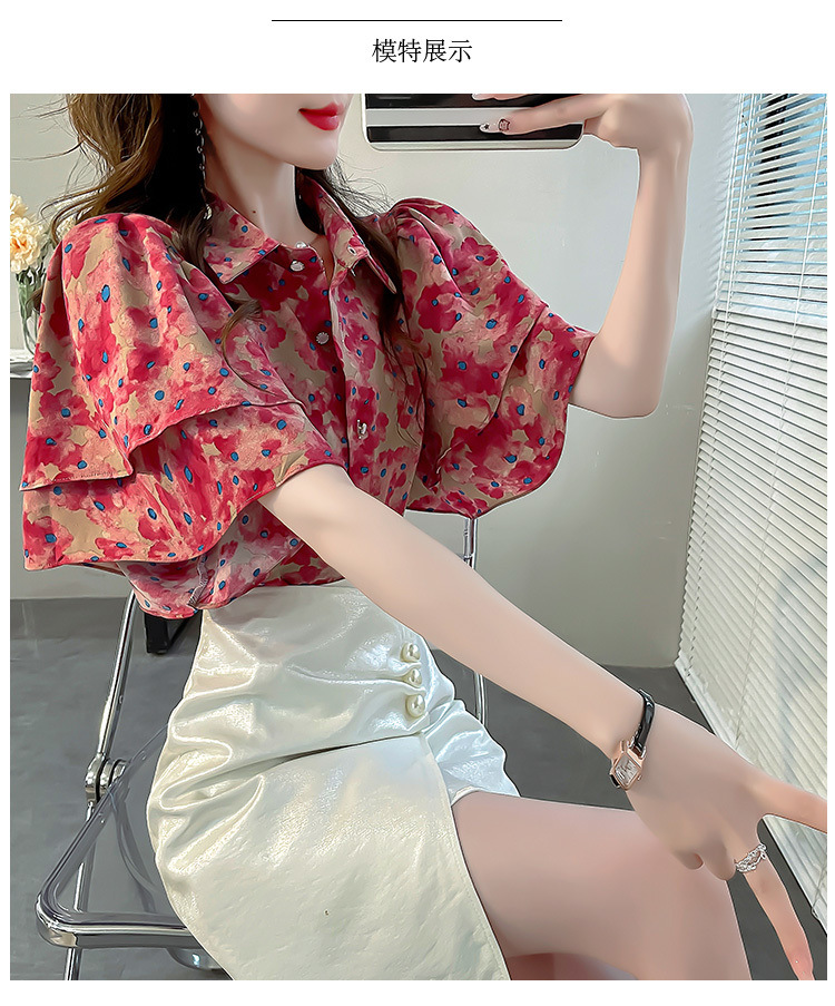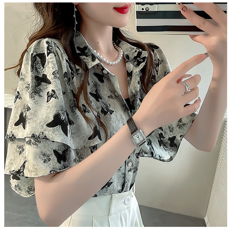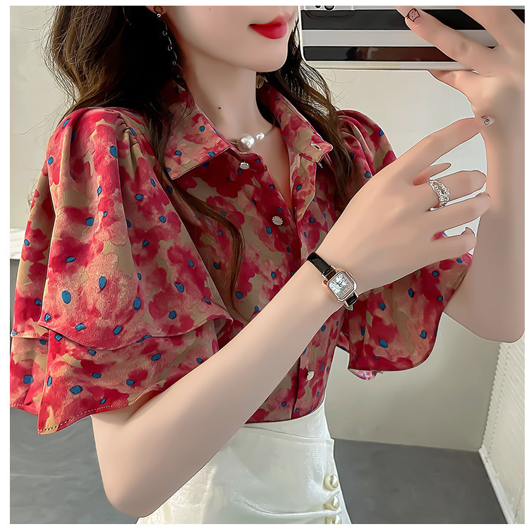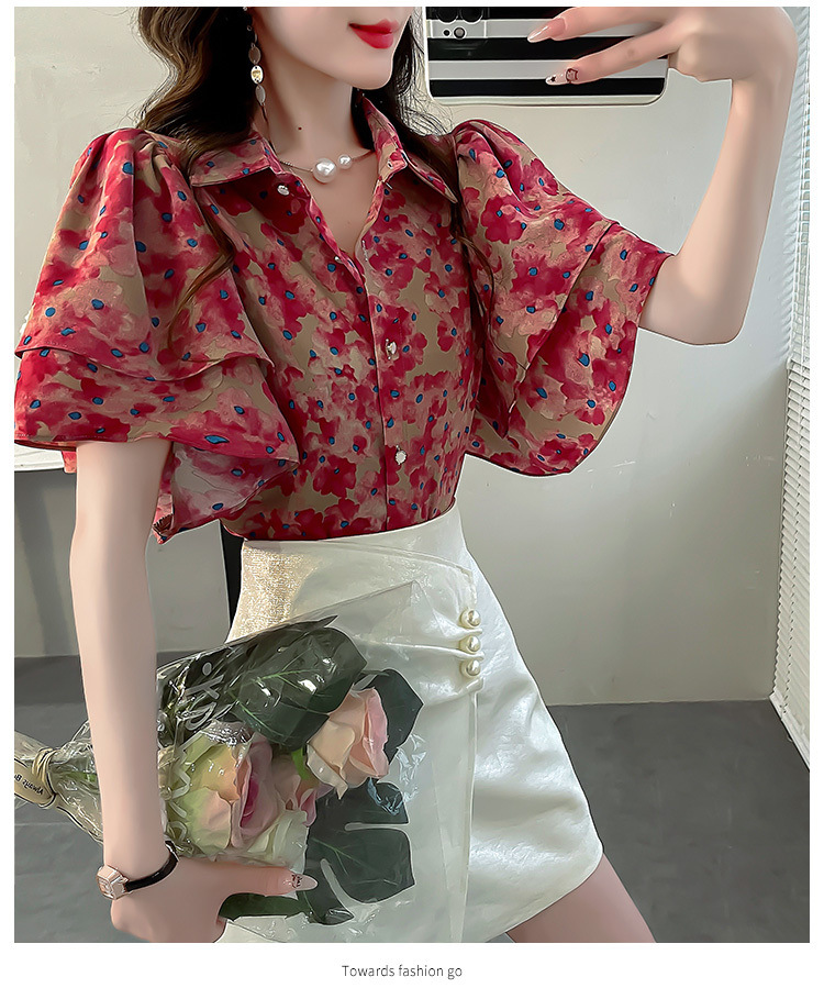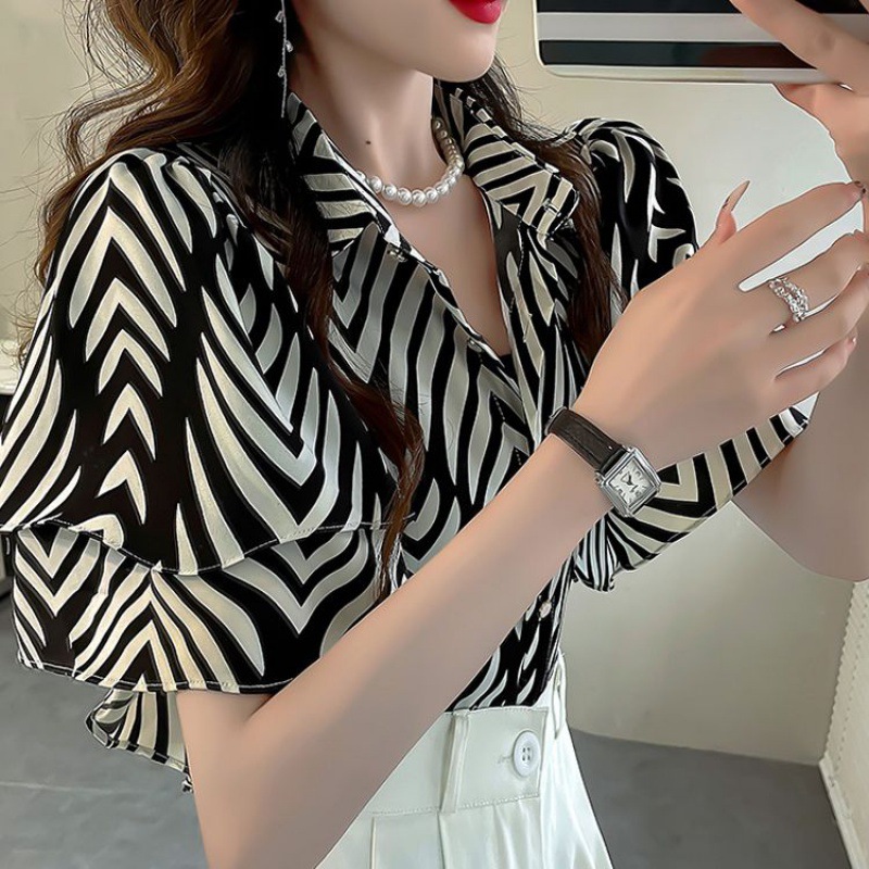 달콤한 인쇄 셔츠 2024 새로운 여성의 여름 반팔 셔츠 여성용 하이 엔드 반팔 러플 탑스토어 가기
