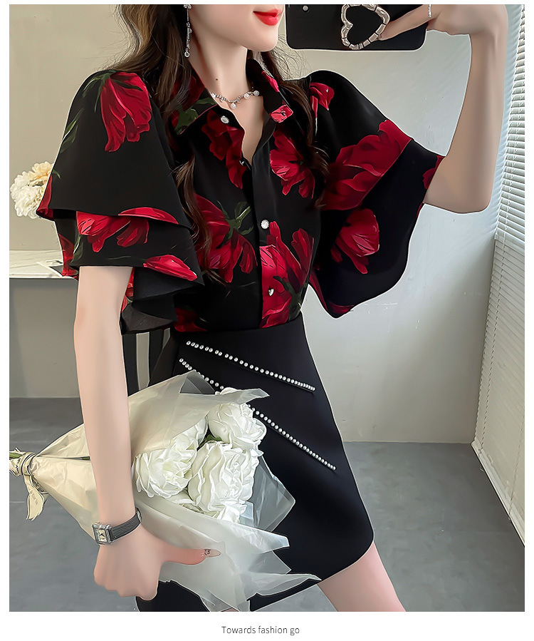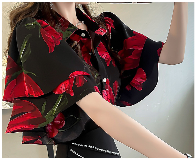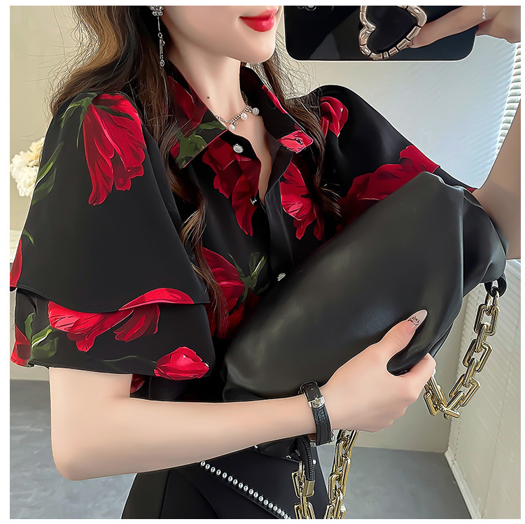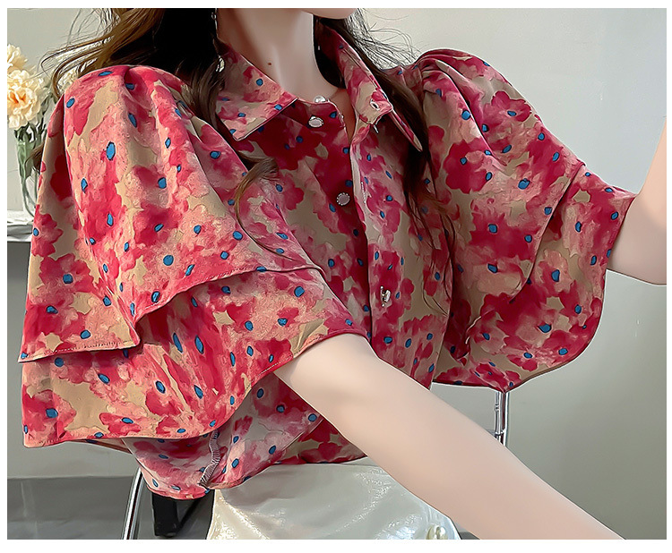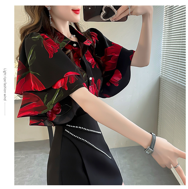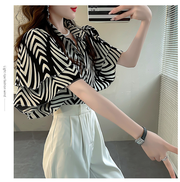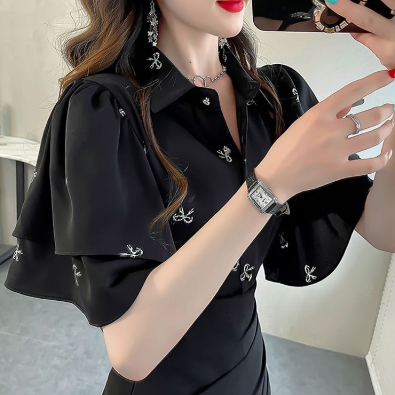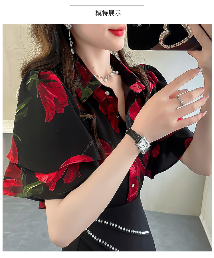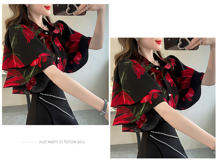 달콤한 인쇄 셔츠 2024 새로운 여성의 여름 반팔 셔츠 여성용 하이 엔드 반팔 러플 탑