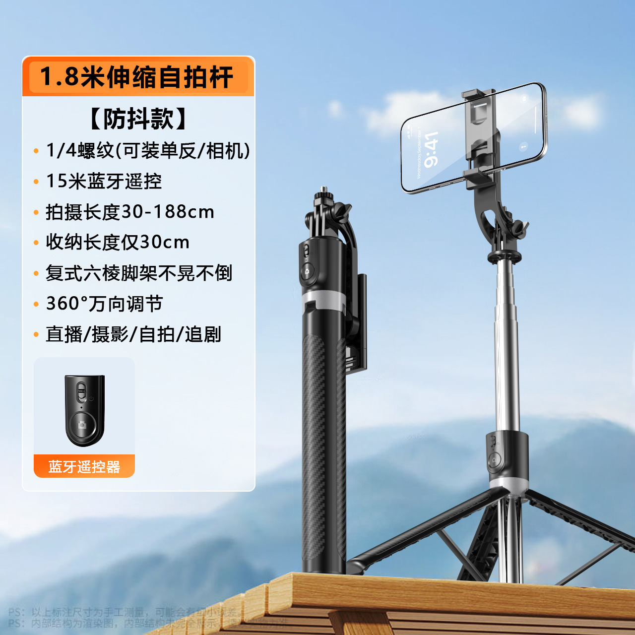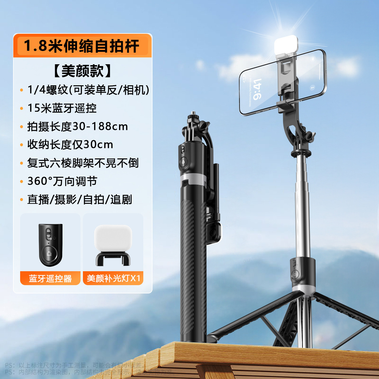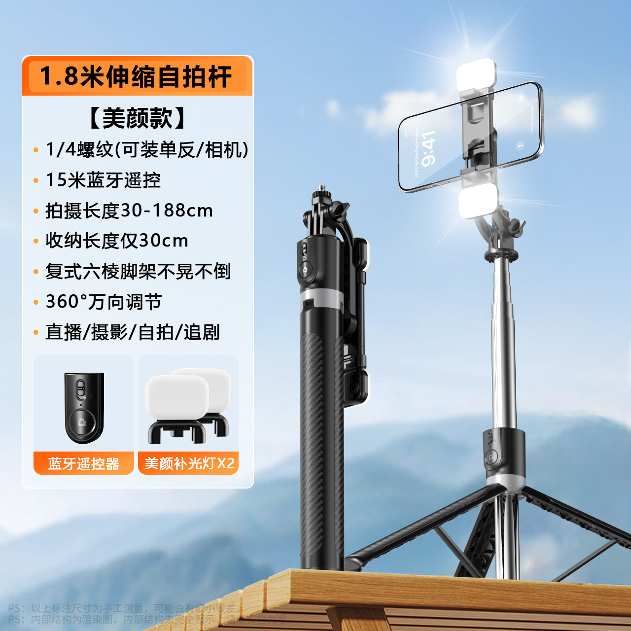 • 블랙 1.8m 셀카봉 + 이중 소형 조명