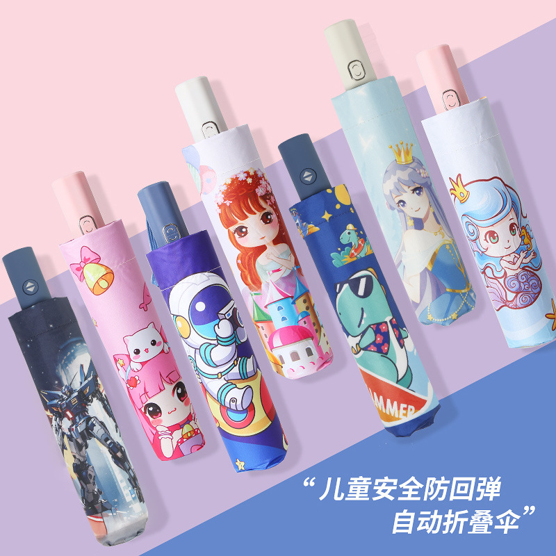 맞춤형 만화 귀여운 휴대용 완전 자동 안티 리바운드 안전 반사 스트립 접는 우산 어린이 우산 초등학생을위한